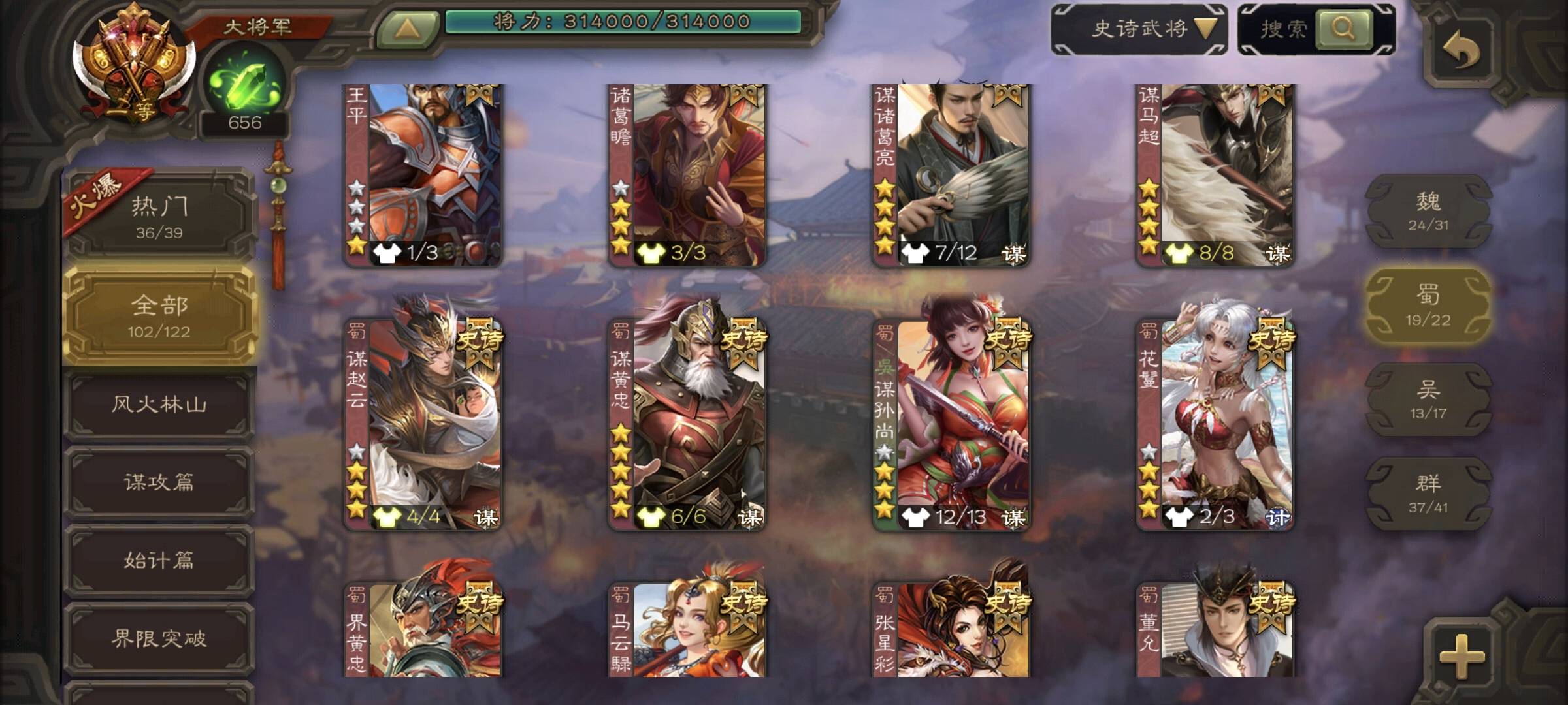 蜀——王平,诸葛瞻,谋马超,谋赵云,花鬘,界黄忠,马云騄,张星彩,董允,赵襄,关索,沙摩柯,周群,谯周,某黄忠,谋孙尚香,鲍三娘,傅佥,谋诸葛亮
