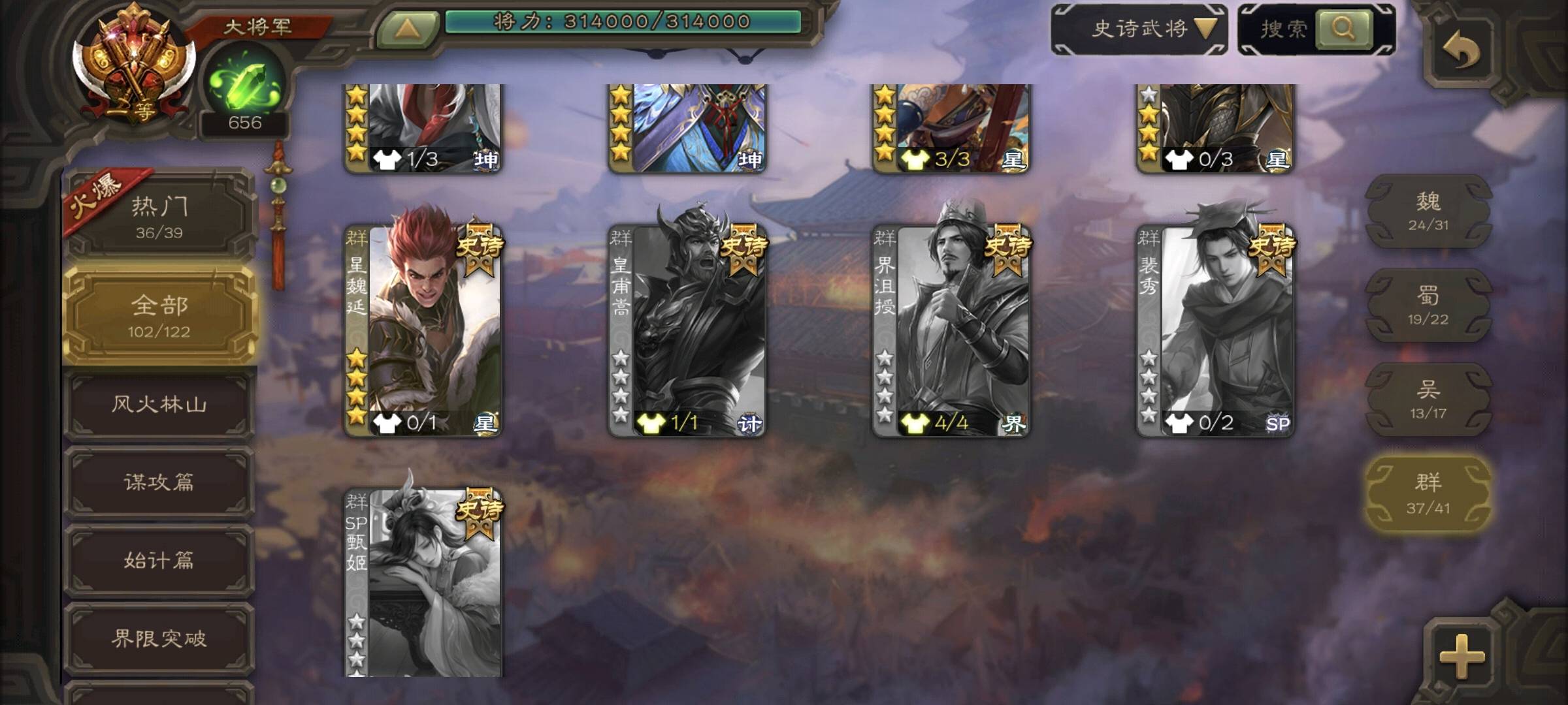 群——左慈,许攸,谋貂蝉,杜预,刘璋,界左慈,沮授,界李儒,张让,麹义,陶谦,士燮,司马徽,卑弥呼,刘焉,王允,苏飞,公孙康,兀突骨,祢衡,庞德公,星甘宁,张仲景,审配,徐荣,陈登,张琪瑛,灵雎,杨彪,星黄忠,星魏延,十常侍