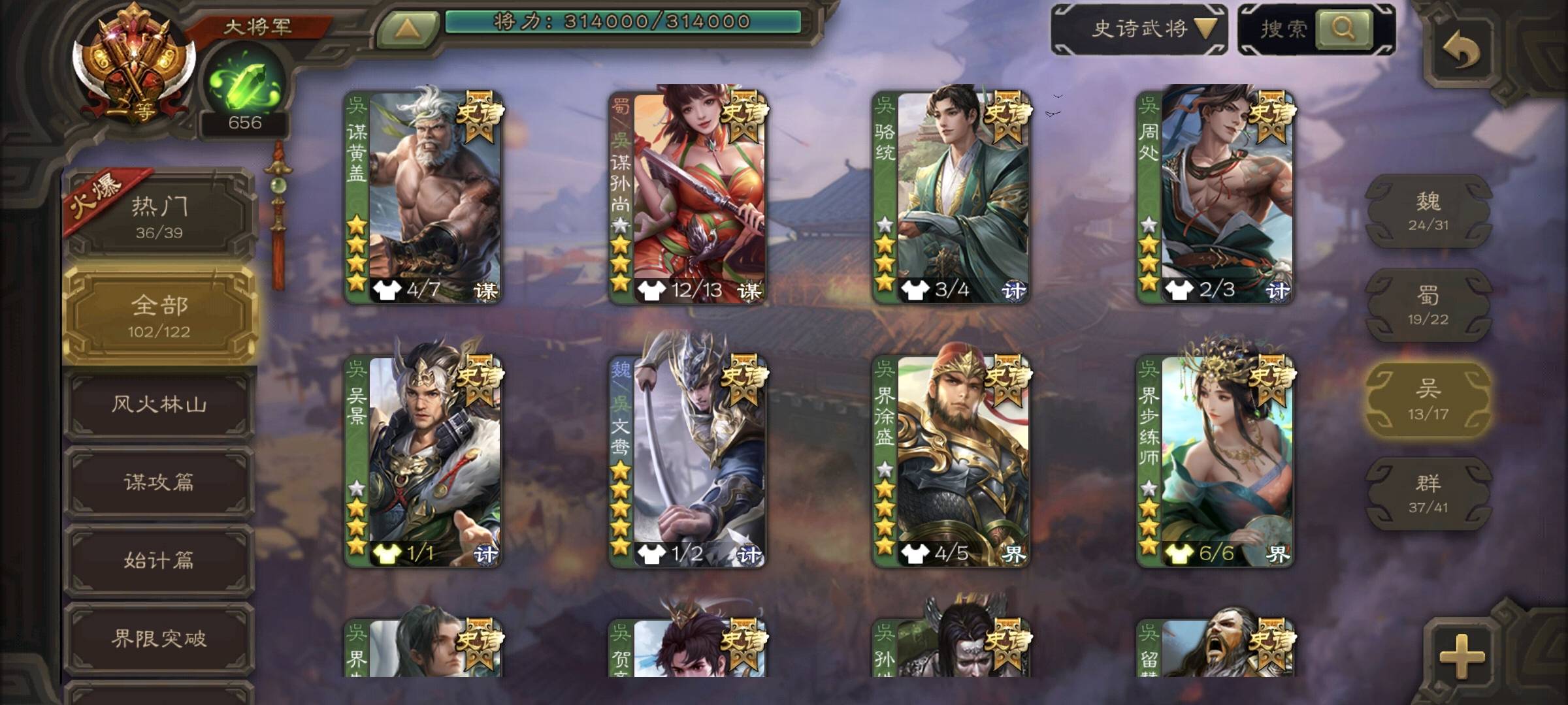 吴——谋黄盖,骆统,吴景,文鸯,界徐盛,界步练师,界朱然,贺齐,孙皓,留赞,谋孙尚香,周处,孙寒华