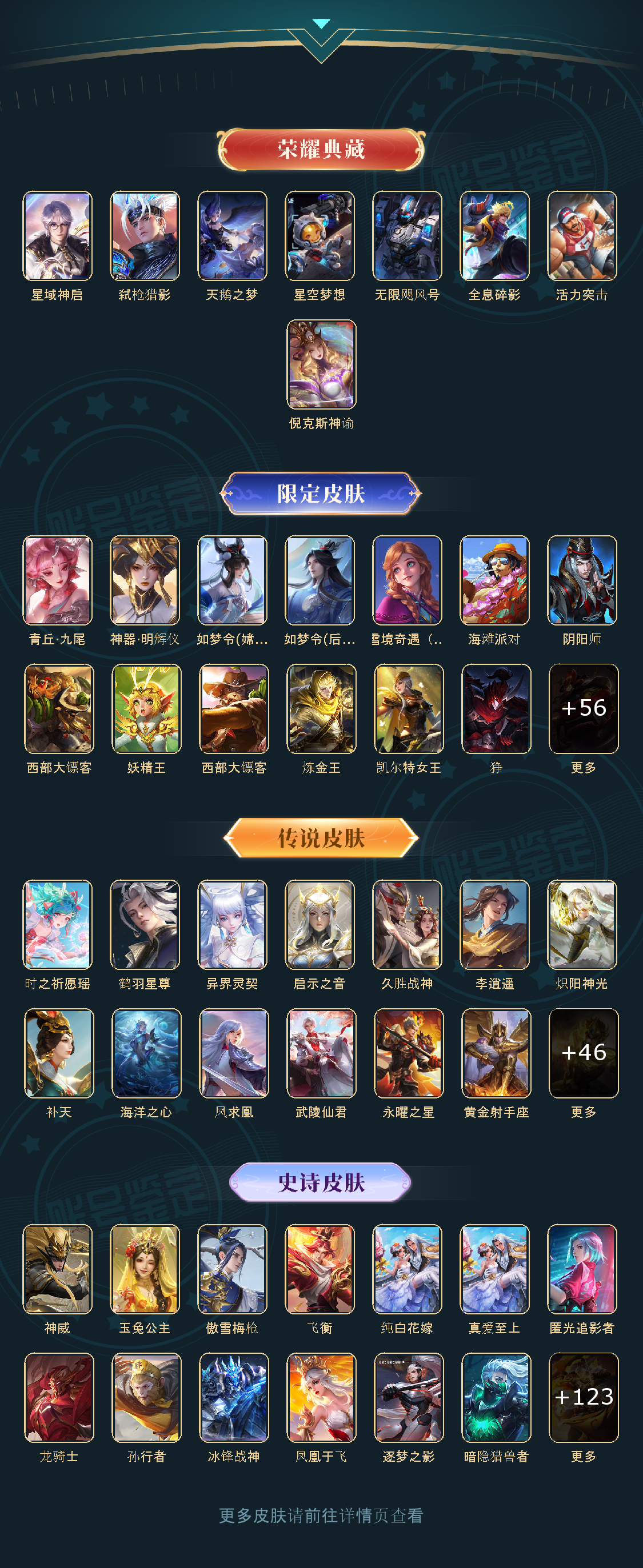 贵族等级V10,英雄数量118,典藏皮肤数8,皮肤数量414,冰锋战神/街头霸王/天鹅之梦/纯白花嫁/真爱至上/凤求凰/逐梦之影/武陵仙君/星空梦想/无限飓风号/黄金狮子座/一生所爱/全息碎影/朱雀志/活力突击/太华/久胜战神/飞衡/梁祝/倪克斯神谕/白鹤梁神女/匿光追影者/遇见胡旋/星域神启/李逍遥/武圣/孙行者/玉兔公主/补天/异界灵契/神威/启示之音/傲雪梅枪/淬星耀世