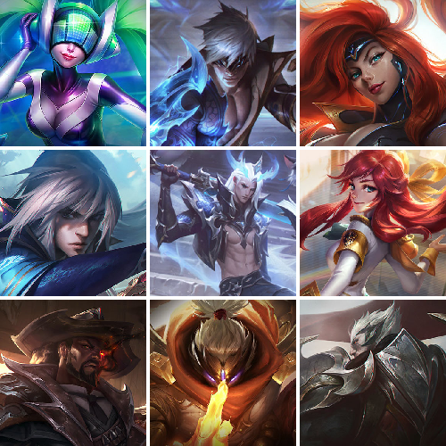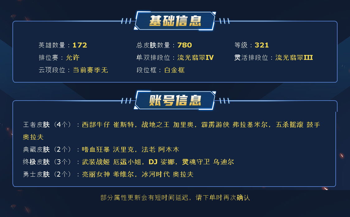 【可排位499原皮肤】至臻婕拉、至臻瑟提、至臻卢锡安、至臻剑魔、至臻瞎子、灰烬杀手塞拉斯、海克斯乌鸦、海克斯鳄鱼、海克斯人马、海克斯龙龟、暗星大虫子、新创战纪希维尔、王国机神玄武盖伦、玉剑传说男刀、星之守护者伊泽瑞尔、狗年狗头、狗年拉克丝、电玩女枪、电玩锐雯、司马懿仲达、花木兰、源计划铁男、源计划鳄鱼、光明哨兵男枪、神龙尊者圣龙李青、灵魂莲华阿狸、魅惑女巫辛德拉、养蜂人、EDG佛耶戈、EDG男枪、西部魔影男刀、黑夜使者凯隐、净雪之月凯隐、破败军团龙女、源计划猪妹、源计划韦鲁斯、咖啡甜心格温、女帝皎月、女帝奇亚娜、灵魂莲华蛇女、猎户星神韦鲁斯、人马星神、屠龙勇士巨魔、战地机甲狗头、抵抗军雷神杰斯、抵抗军绿魔辛吉德、灵魂守卫、武装战姬、DJ、甜心之翎洛、万圣节人马、星之守护者芮尔、泳池派对发条、泳池派对岩雀、御星魔矢、暗星锤石、奥德赛凯隐、黑夜亚索、黎明锐雯、律政大亨蒙多、神王诺手、屠龙勇士潘森、未来战士女警、西部魔影卢锡安、西部天使赛娜、星之守护者阿狸、星之守护者霞、源计划派克、源计划薇恩、战斗学院伊泽瑞尔、真实伤害艾克、暗星小丑、黯晶巨鳄、黯晶巨兽、黯晶之眼、奥德赛卡兹克、奥德赛石头人、超级英雄凯南、德玛西亚警官卢锡安、德玛西亚警官盖伦、黑潮皎月、黑潮吸血鬼、柯基库奇、魔女卡蜜尔、魔女妖姬、千纸双子、千纸凤凰、未来战士卢锡安、未来战士慎、武神、西部人马、小恶魔小炮、小蜜蜂提莫、星守辛德拉、腥红之月全套、永恒之森阿狸、宇航员茂凯、玉剑剑姬、源计划阿卡丽、源计划蔚、源计划狼人、源计划刀妹、战斗教授男枪、战斗学院杰斯、真实伤害奇亚娜