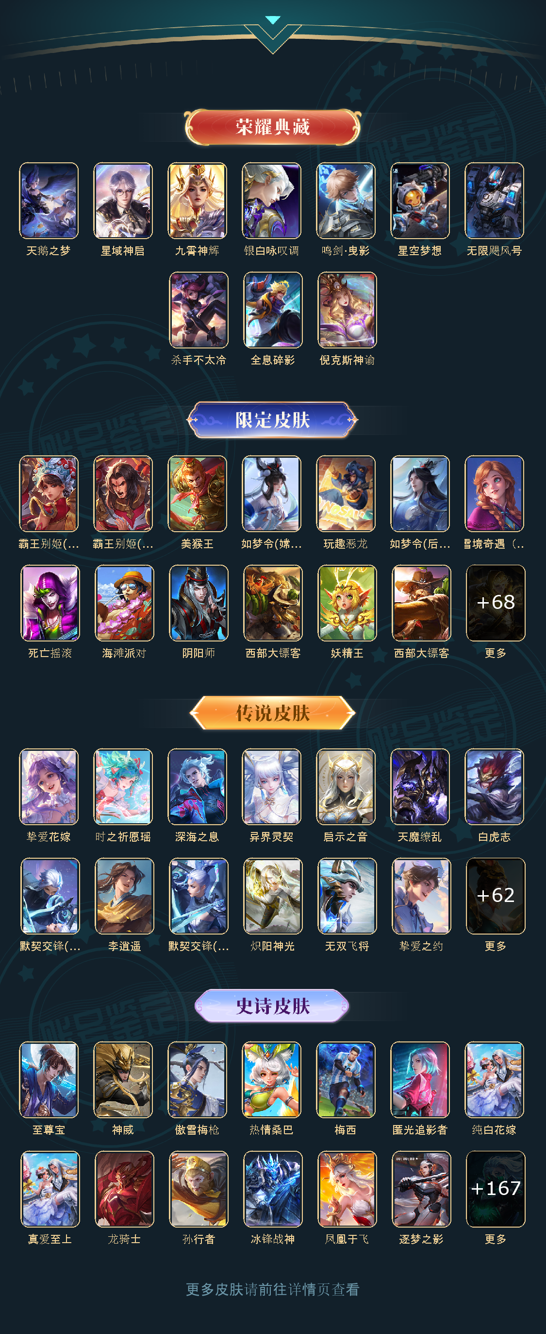 贵族等级V10,典藏皮肤数10,纯白花嫁/天魔缭乱/至尊宝/真爱至上/圣诞老人/热情桑巴/梅西/青龙志/白虎志/朱雀志/久胜战神/飞衡/倪克斯神谕/匿光追影者/鸣剑·曳影/星域神启/李逍遥/武圣/玉兔公主/补天/异界灵契/神威/启示之音/傲雪梅枪/时雨天司
