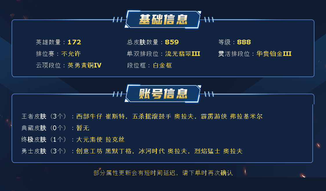 此号已在公安机关信息登记虚拟财产备案,租用期间禁止使用美化包第三方软件外挂等,如导致封号或冻结必将追究到底向平台找到下单IP、手机号实名、下单充值的实名找到本人法院传票到封号者家!把封号者起诉到法院追回账号损失切勿以身试法弄的大家都不好看!感谢支持与配合!根据《刑法》第二百七十五条故意毁坏财物罪:故意毁坏公私财物数额较大或者有其他严重情节的处三年以下有期徒刑、拘役或者罚金数额巨大或者有其他特别严重情节的处三年以上七年以下有期徒刑!切勿以身试法!