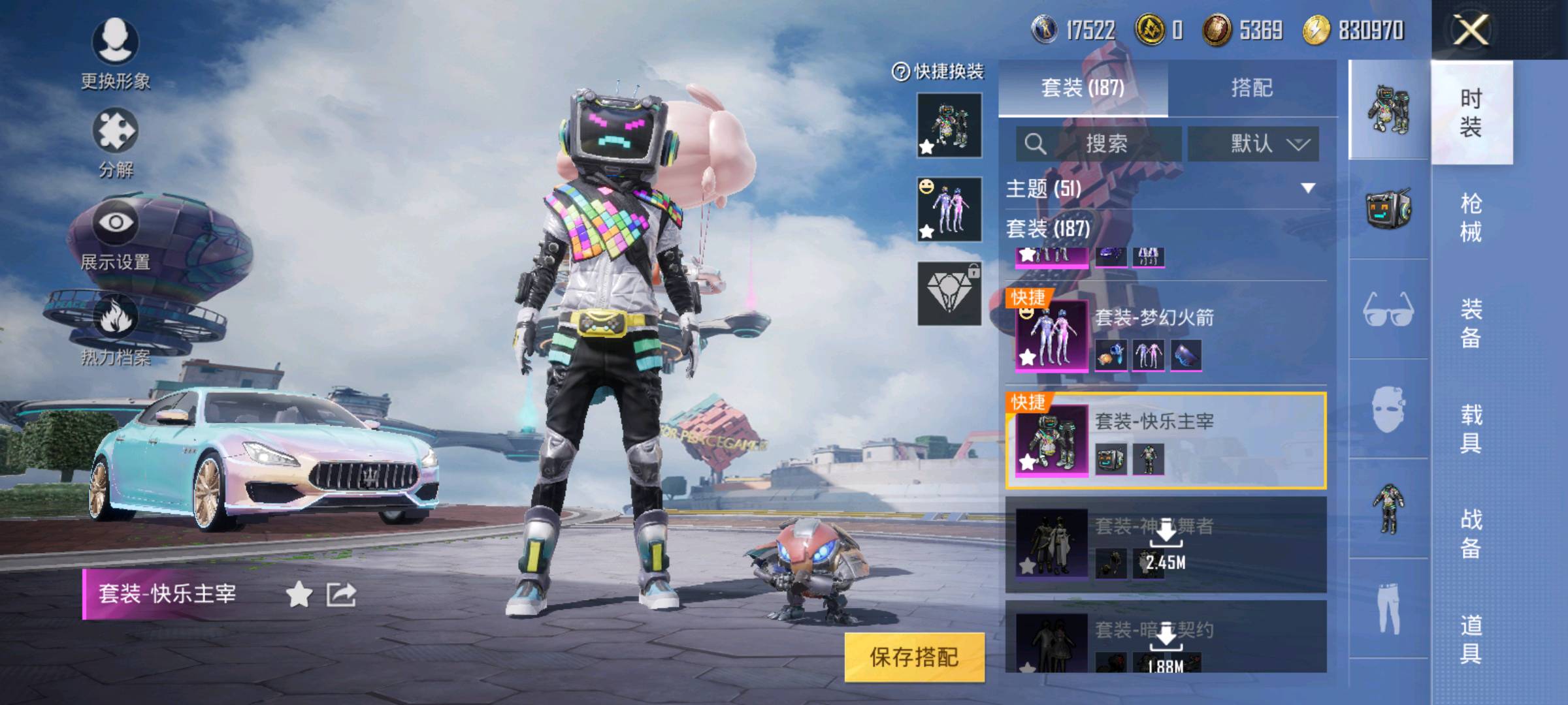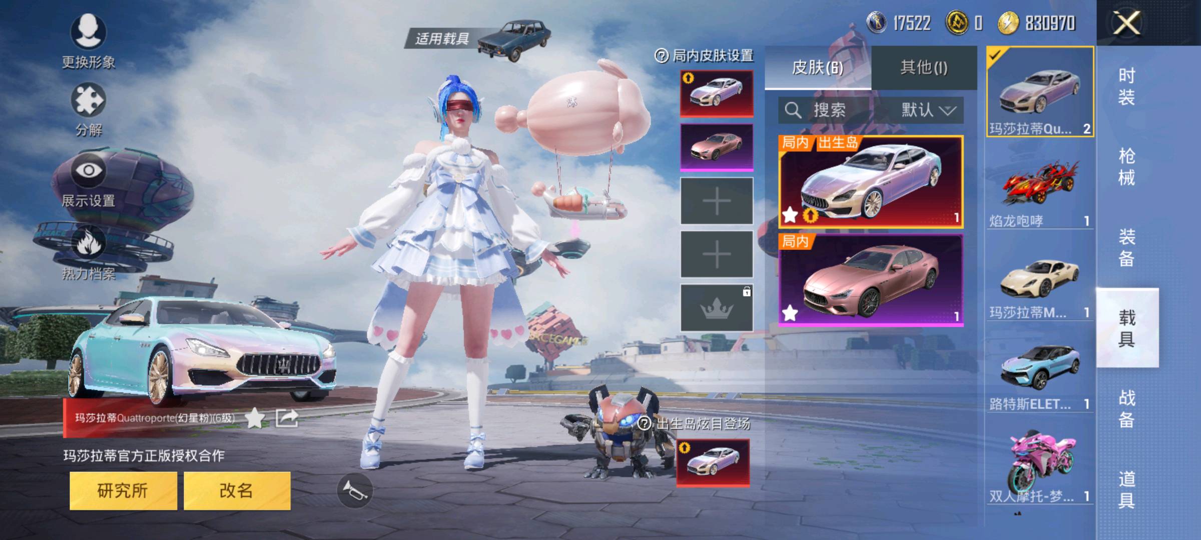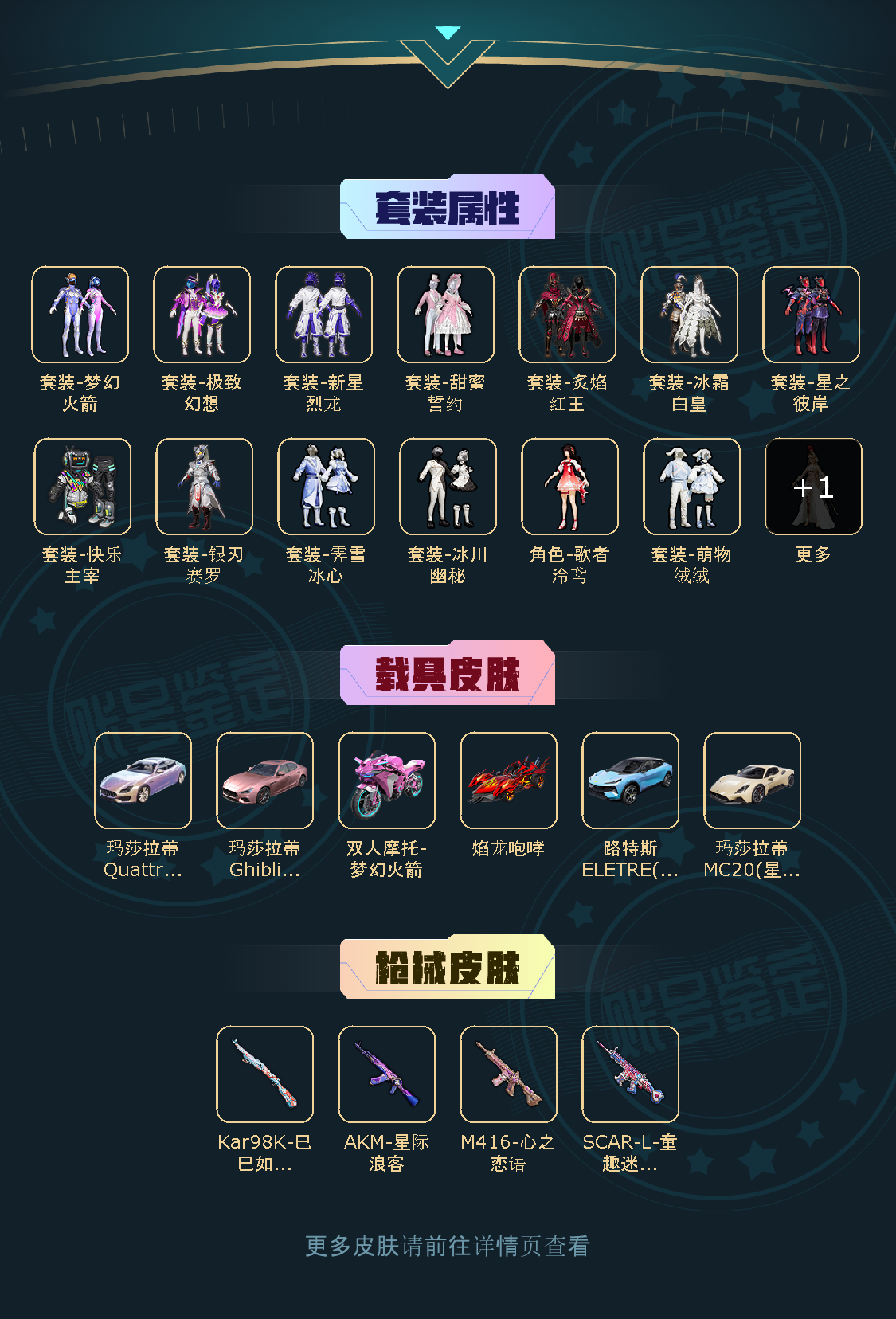 13粉,6载具,213套装,SCAR-L-童趣迷兔/M416-心之恋语/AKM-星际浪客/路特斯ELETRE(冰川蓝)/双人摩托-梦幻火箭/焰龙咆哮/玛莎拉蒂MC20(星石白)/玛莎拉蒂Quattroporte幻星粉/玛莎拉蒂Ghibli(粉)/