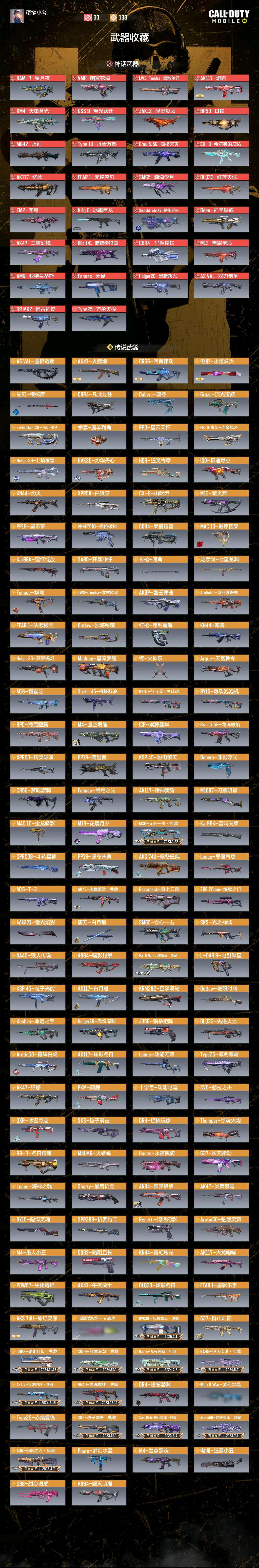 蛇刃-银蛇舞-街机霸王典藏-雪林歌谣-动能无限-巨擎涡轮-机要特工-先进火力-相位破碎-赤金战矛-圣诞狙--灼华丹心-星乐章-相位破碎-虚空塌陷/异界银狼-华珑-白狼牙-紫藤曼华-精灵咏叹-梦呓渡鸦-终焉-花晨月夕-会心一击-粒子光能-命运之手-白虎/魅惑灵狐(典藏)-赫拉之击-卢卡斯-次元律动-星云天秤-星河双鱼-宝瓶-极速燃点-闪耀明星-时序因果