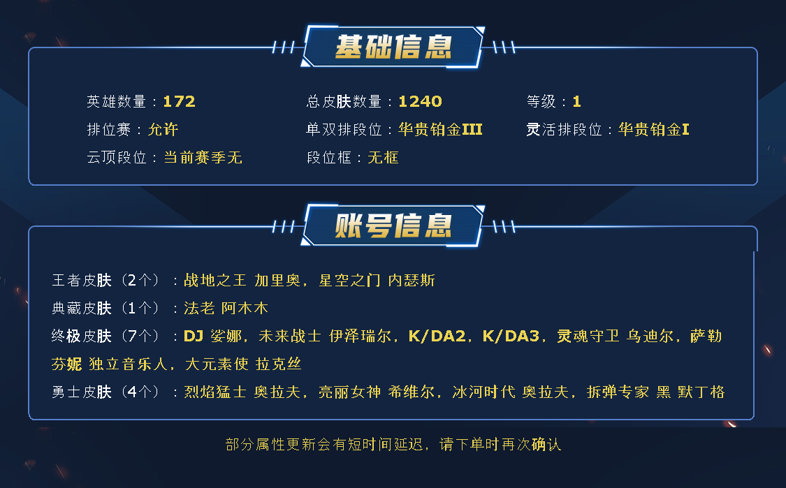 ~~喜欢记得收藏~~可排位~~1300皮全英雄~~租之前尽量查一下游戏ID,确保段位是您需要的,避免浪费您的时间~~请勿挂机逃跑故意送人头,谢谢合作,谢谢~~