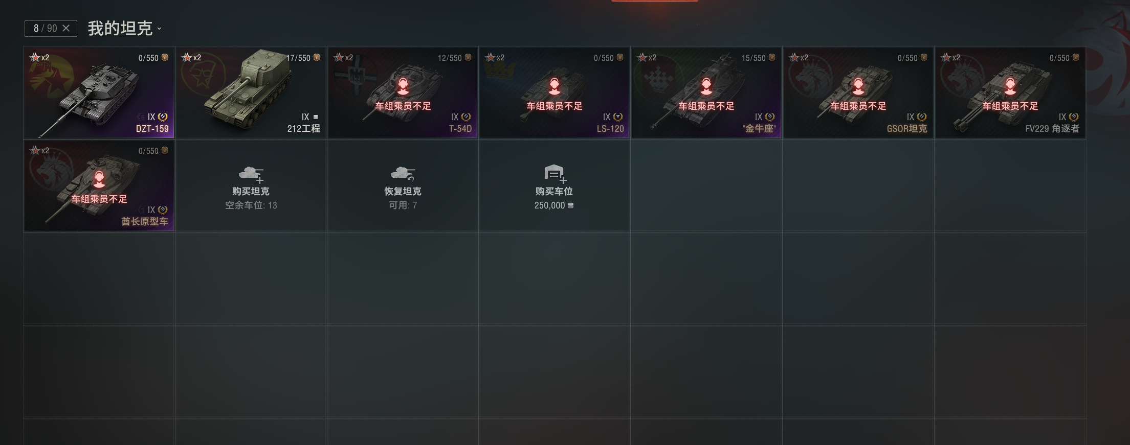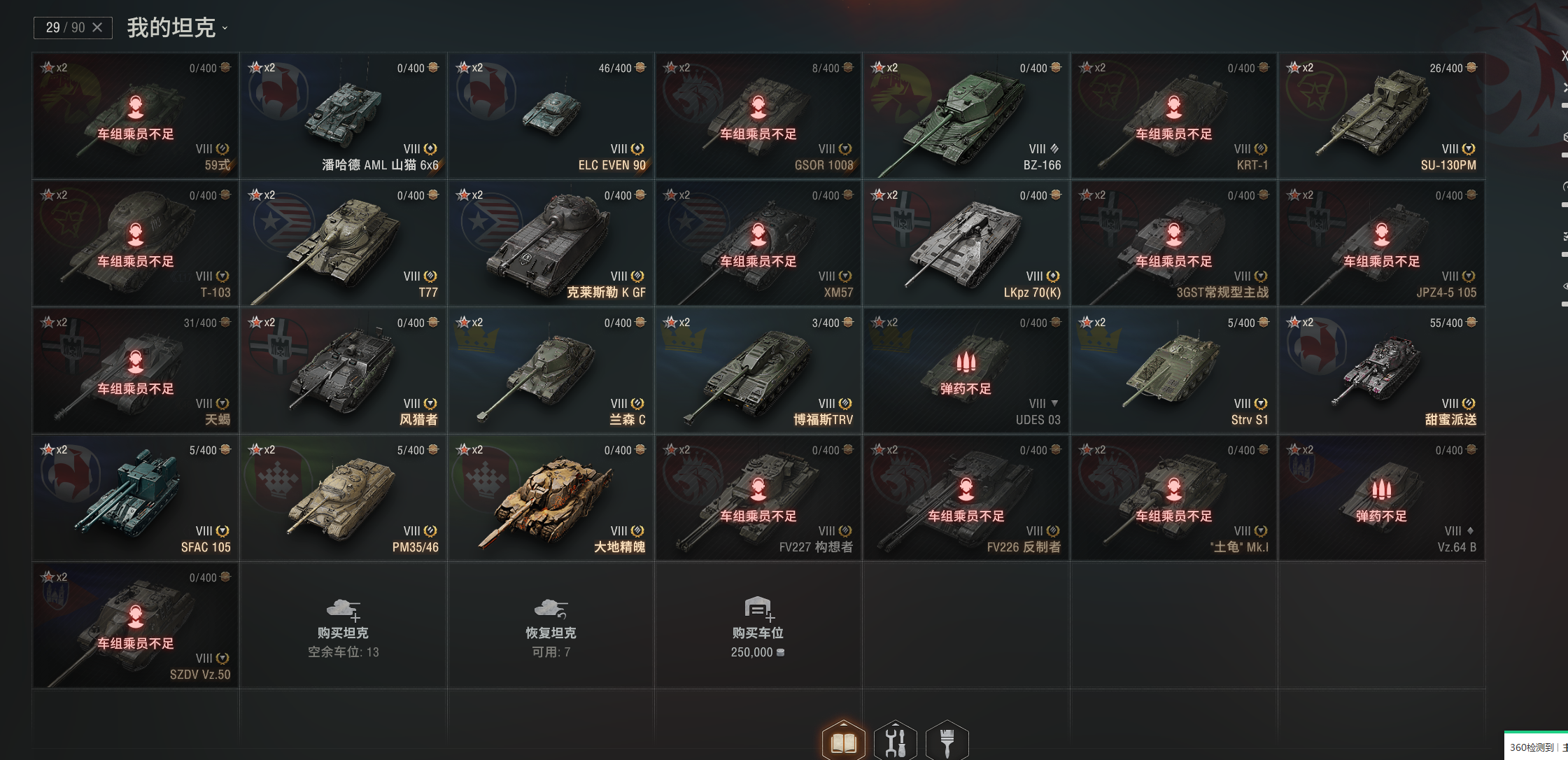 注意事项:1,进入游戏后,如果车辆情况不符。那是因为前面的玩家筛选了自己玩的坦克,其他的隐藏了。坦克显示栏,左下角小坦克标志,点进去把所有系别和级别选上,坦克就全部出来了。