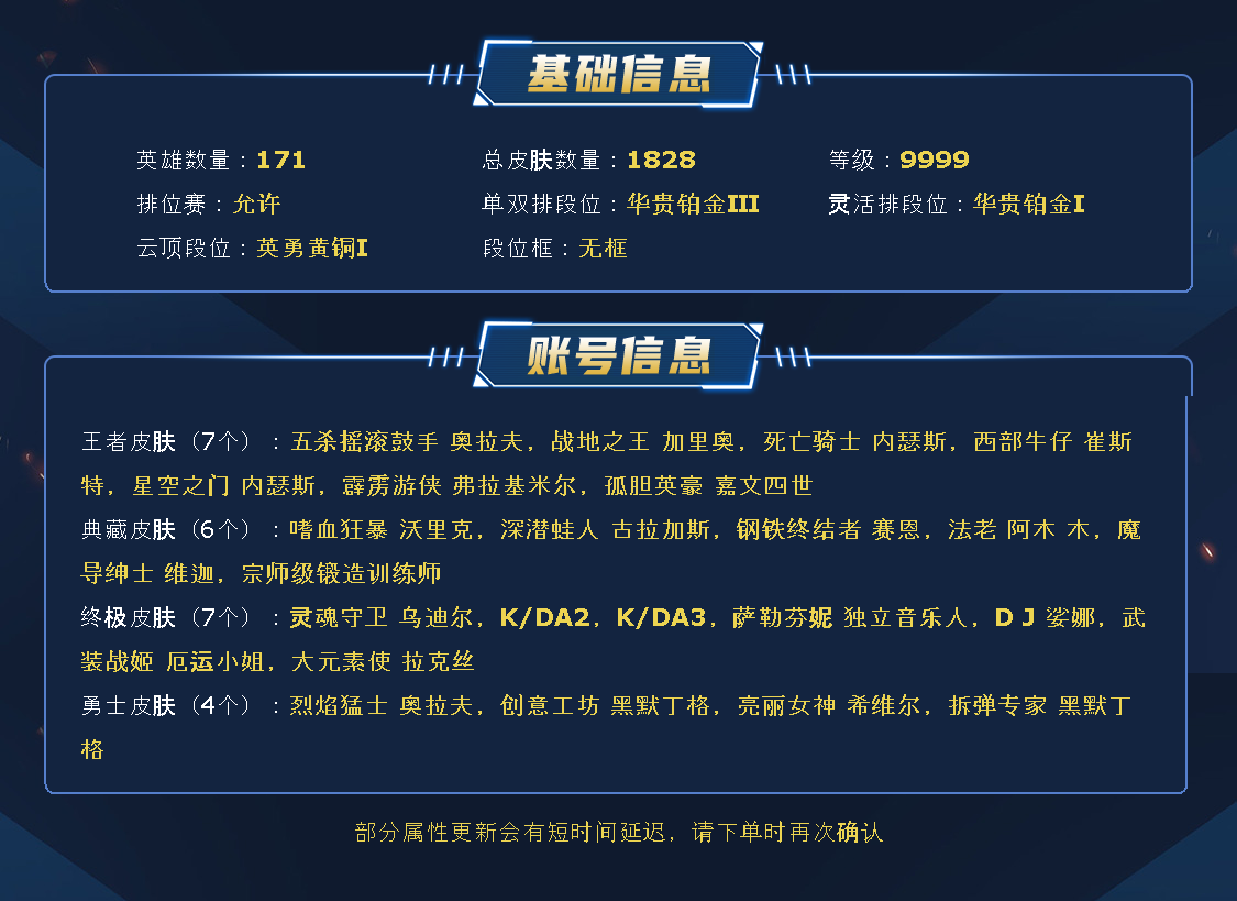 ~~喜欢记得收藏~~可排位~~1746皮全英雄丨50神话/至臻/海克斯丨IG套丨灵魂莲华套丨福牛守护者套丨幻灵套丨神龙尊者套丨女帝套丨KDA套丨创星御星丨甜心霞洛丨甜心格温丨哨兵薇恩丨替父从军丨银龙裁决丨嫦娥皎月丨卧虎藏龙丨勇敢的心丨EDG男枪丨羊年金克斯丨至高天薇古丝丨星守狐狸风女ez丨玉剑男刀女刀剑圣丨鼠年武器瑟提日女丨电玩女警瑞文人马丨幽梦玫瑰男刀辛德拉~~租之前尽量查一下游戏ID,确保段位是您需要的,避免浪费您的时间~~请勿挂机逃跑故意送人头,谢谢合作,谢谢~~