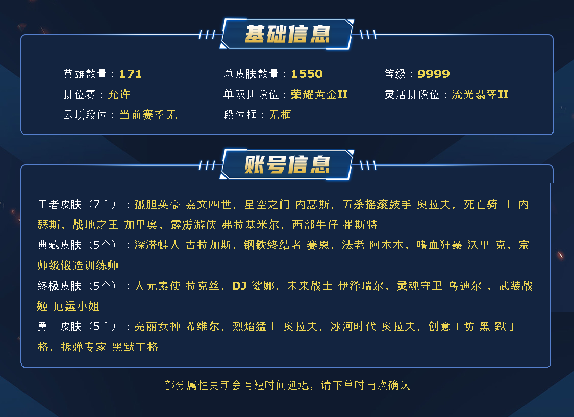 ~~喜欢记得收藏~~可排位~~1600皮全英雄丨80神话/至臻/海克斯丨龙瞎/龙的传人丨IG套丨EDG套丨神龙尊者套丨灵魂莲华套丨星之守护者套丨冰原女警丨玉剑男女刀丨鼠年武器瑟提丨青花瓷冰女ez丨幽梦玫瑰男刀辛德拉丨电玩女警女枪卡莎瑞雯人马~~租之前尽量查一下游戏ID,确保段位是您需要的,避免浪费您的时间~~请勿挂机逃跑故意送人头,谢谢合作,谢谢~~