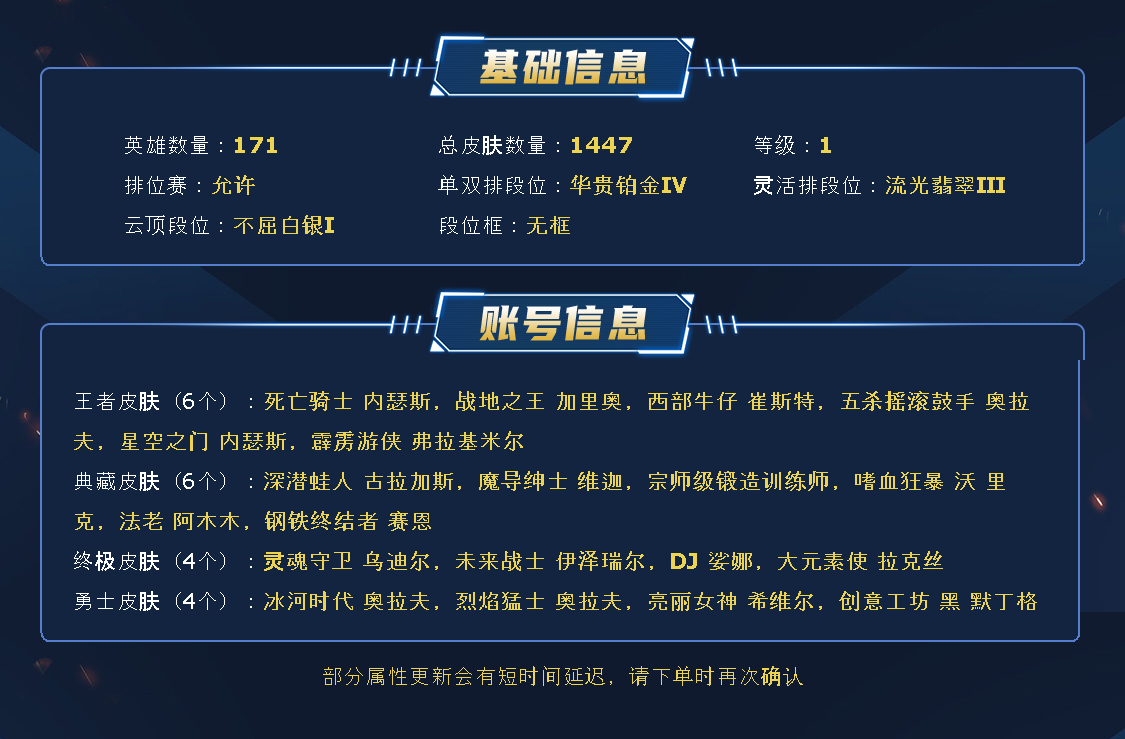 ~~喜欢记得收藏~~可排位~~1411皮全英雄丨835原皮576炫彩~~租之前尽量查一下游戏ID,确保段位是您需要的,避免浪费您的时间~~请勿挂机逃跑故意送人头,谢谢合作,谢谢~~