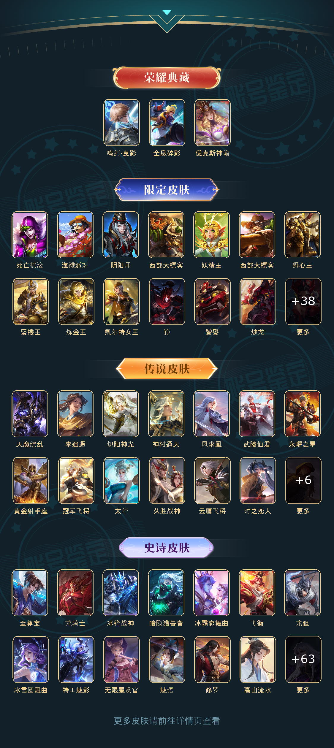 冰锋战神/街头霸王/天魔缭乱/至尊宝/王者之锤/凤求凰/武陵仙君/全息碎影/冰霜恋舞曲/太华/久胜战神/飞衡/梁祝/倪克斯神谕/鸣剑·曳影/龙胆/李逍遥