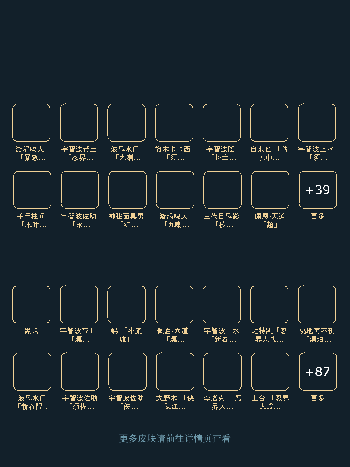 48S 91A 386忍者 宇智波带土「暴怒」/干柿鬼鲛「鲛肌融合」/宇智波佐助「疾风传咒印」/迈特凯「忍界大战」/宇智波带土「忍界大战」/宇智波斑「木叶创立」/佩恩·天道「波风水门「九喇嘛连结」机械鸣人「初始形态」宇智波佐助「侠隐江湖」