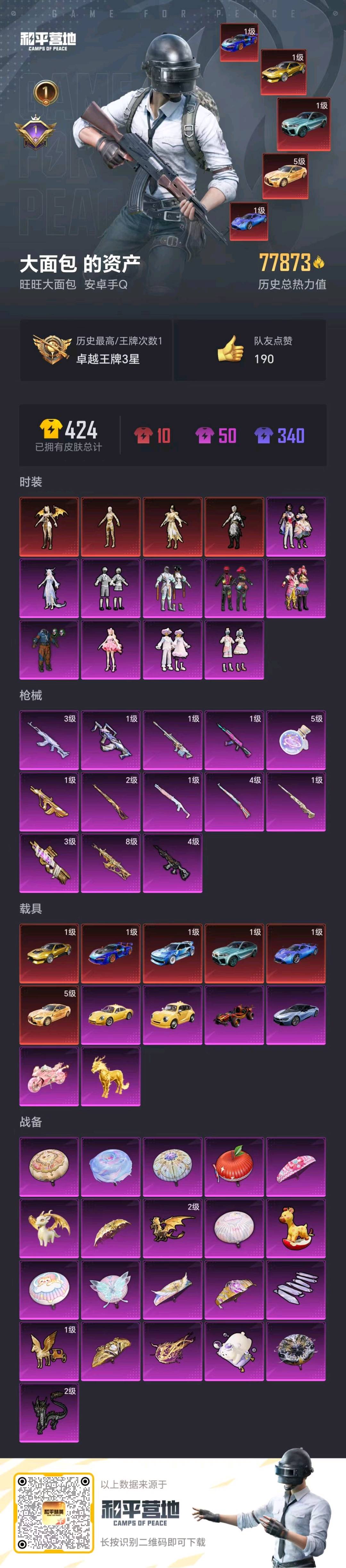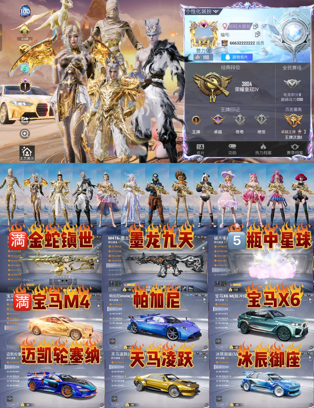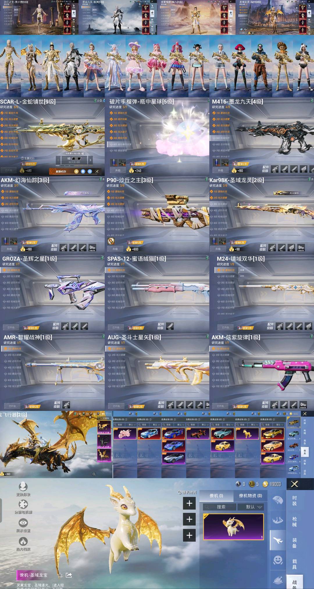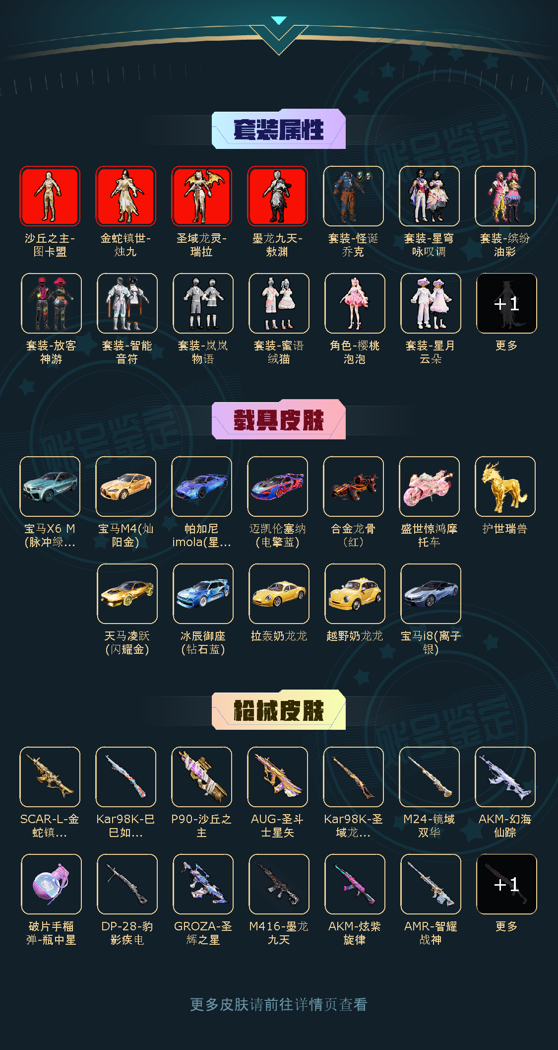 14粉,12载具,69套装,1王牌印记 破片手榴弹-瓶中星球/Kar98K-圣域龙灵/GROZA-圣辉之星/Kar98K-巳巳如意/SPAS-12-蜜语绒猫/M24-镜域双华/AUG-圣斗士星矢/AKM-炫紫旋律/M416-墨龙九天/AKM-幻海仙踪/AMR-智耀战神/SCAR-L-金蛇镇世/P90-沙丘之主/宝马i8(离子银)/越野奶龙龙/护世瑞兽/宝马X6 M(脉冲绿)/宝马M4(灿阳金)/迈凯伦塞纳(电擎蓝)/帕加尼imola(星空蓝)/天马凌跃(闪耀金)/合金龙骨(红)/盛世惊鸿摩托车/拉轰奶龙龙/冰辰御座(钻石蓝)/