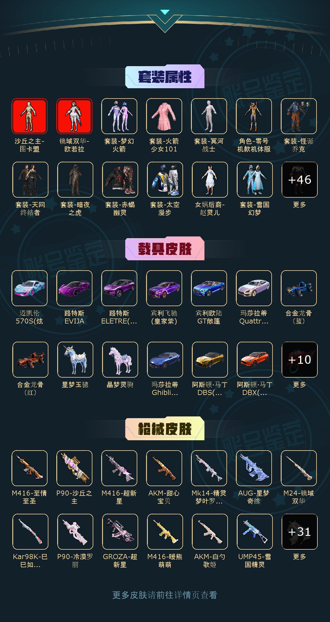 52粉,22载具,42特效枪,337套装,32王牌印记 UZI-绮梦青鸾AKM-甜心宝贝SCAR-L-梦幻火箭M416-风花雪月AUG-星之彼岸Vector-红伞翩翩GROZA-香水柠檬M416-心之恋语平底锅-林间仙鹿M416-五爪金龙DP-28-枪炮玫瑰AKM-炫紫旋律MG3-洛神天依GROZA-焦糖拿铁SCAR-L-青春物语AKM-百合蜜语SLR-暗夜玫瑰UMP45-雪国精灵M762-甜蜜誓约UMP45-相思残雪UMP45-恐龙拽拽M249-蓝莓炮弹兰博基尼Aventador(翡翠绿)萌喵橘座阿斯顿·马丁DBX(橙)特斯拉Model 3(珍珠白)玛莎拉蒂Ghibli(蓝)兰博基尼URUS(尊享铂)金龙耀世双人摩托-双刃魅影(红)合金龙骨(蓝)灵鼠银迹阿斯顿·马丁DBS(金)极速兔兔鬼马风驰合金龙骨(红)兰博基尼Estoque(尊享铂)