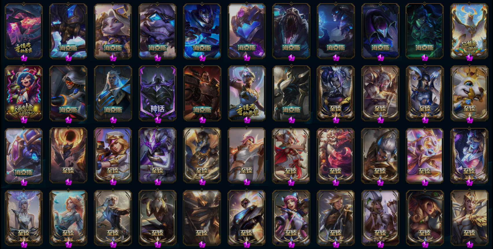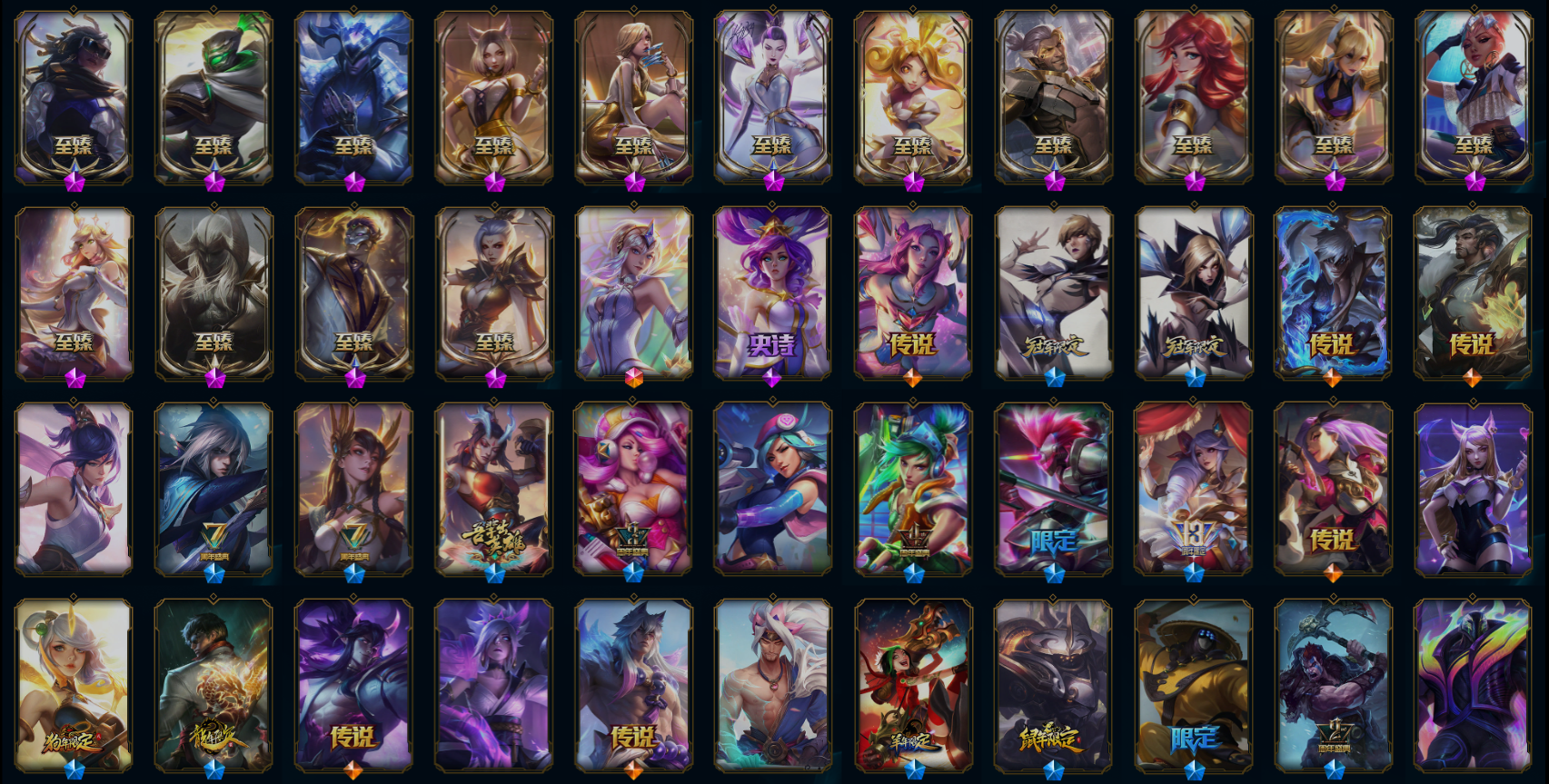 【传说皮肤】烈焰雄心崔丝塔娜 铁哥们儿奥拉夫 钢铁军团盖伦 源计划泯灭雷克顿 恶魔之刃泰达米尔 魔幻卡牌崔斯特 灵魂莲华锤石 战斗学院凯特琳 星之守护者卡莎 灌篮高手德莱厄斯 灵魂莲华瑟提 神王德莱厄斯 黯黑魔龙希瓦娜 大天使长米迦勒凯尔 女皇艾希 泳池派对吉格斯 苹果机器人布里茨 女警狙击凯特琳 焰尾妖狐阿狸 女帝卡特琳娜 源计划毁灭派克 提莫约德尔人的一大步 源计划净化薇恩 神龙尊者夜月幻龙亚索 神龙尊者昼日真龙亚索 第三类接触黑默丁格 邪鸦魅影乐芙兰 红色男爵库奇 炼狱魔犬内瑟斯 战地巨兽科加斯 电玩女神娑娜 双重冰晶艾尼维亚 黎明使者锐雯 源计划林易 地狱之门卫士加里奥 合金巨兽努努和威朗普 黯晶凤凰艾尼维亚 星之守护者金克丝 女主播迦娜 鬼魂新娘莫甘娜 星之守护者拉克丝 银河魔装机神兰博 苍穹之光韦鲁斯 霸天异形卡兹克 真实伤害艾克 神龙尊者圣龙李青 最终BOSS维迦 战场女武神凯尔 冰霜之刃艾瑞莉娅 天煞劫 西部魔影卢锡安 宇航员诺提勒斯 驯龙炮手崔丝塔娜 绅士科加斯 日蚀骑士蕾欧娜 上古战魂魔腾 神拳李青 黑夜使者亚索 死亡骑士盖伦 恶魔男爵瑞兹 源计划联合艾希 律政大亨蒙多 偶像歌手阿狸