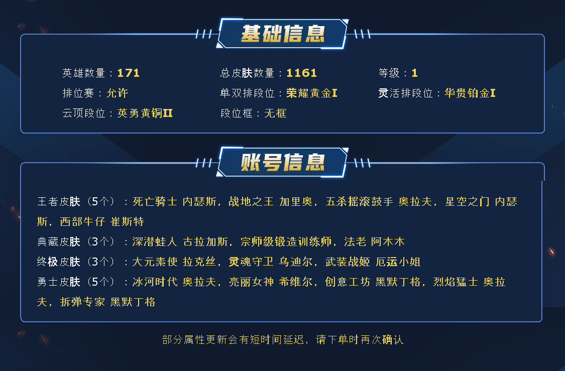 ~~喜欢记得收藏~~可排位~~1143皮全英雄~~租之前尽量查一下游戏ID,确保段位是您需要的,避免浪费您的时间~~请勿挂机逃跑故意送人头,谢谢合作,谢谢~~