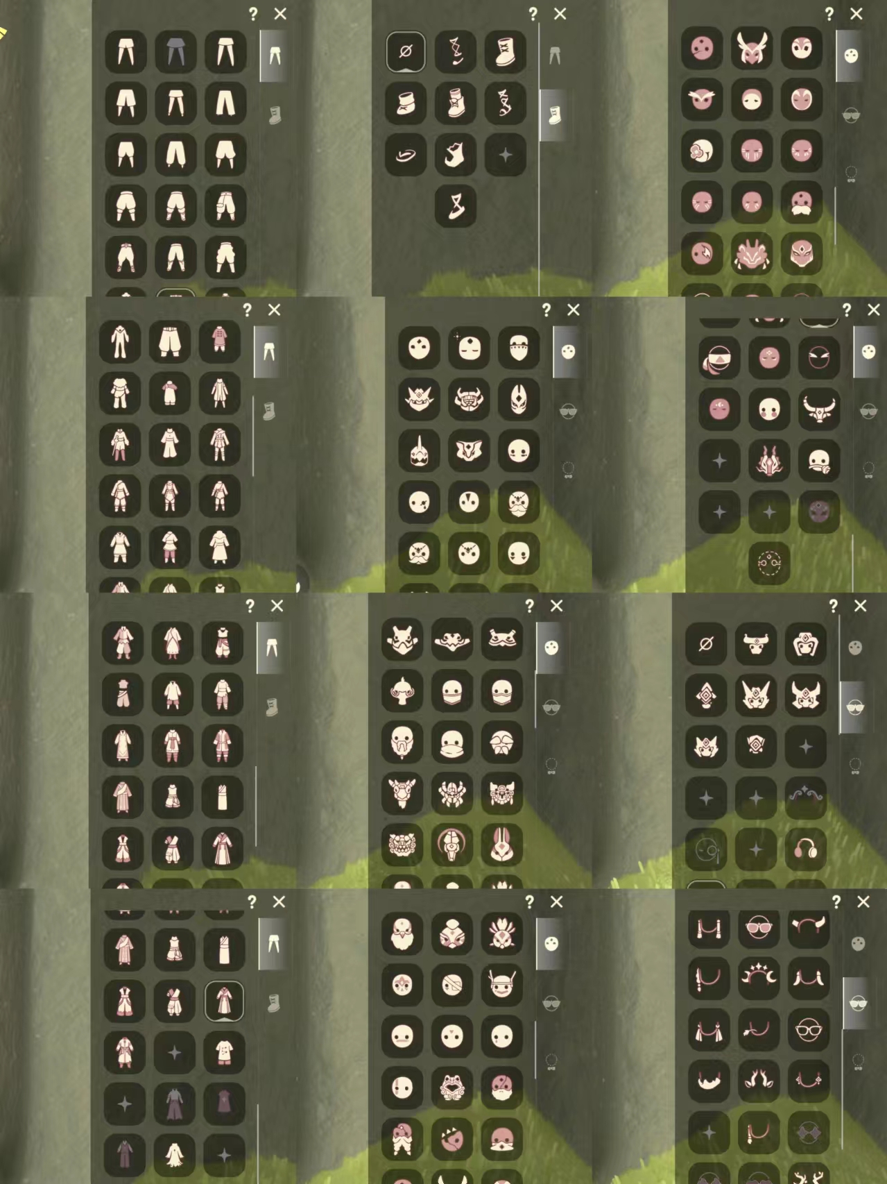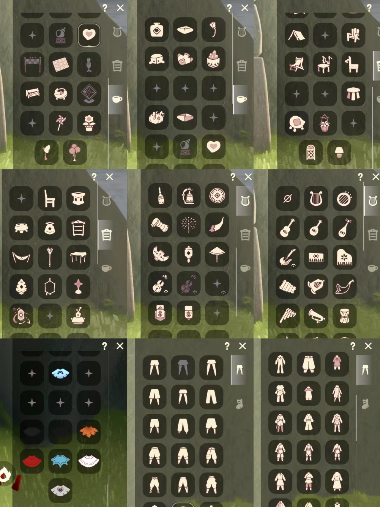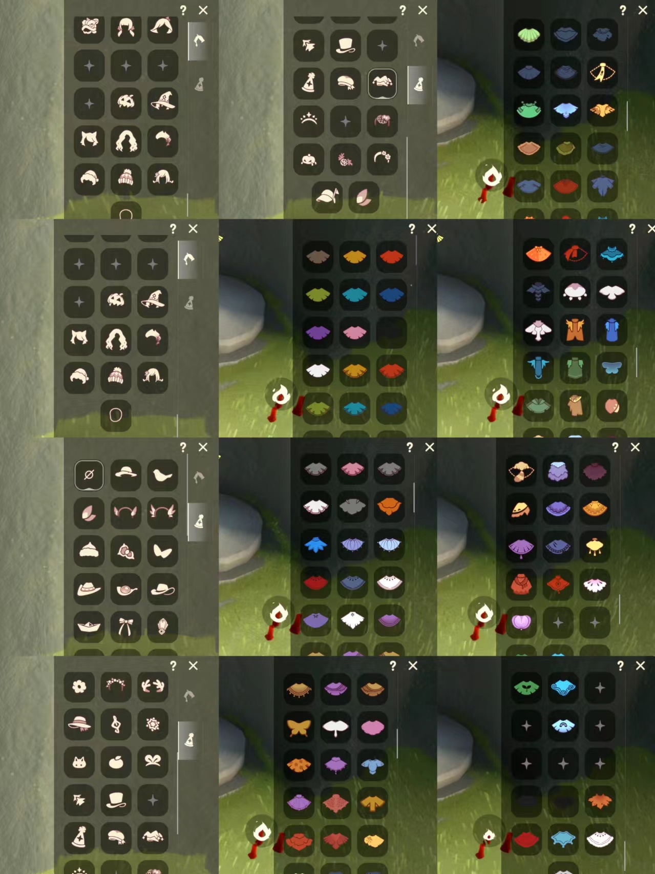 常驻:晨岛/胡子|云野/小飞象|雨林/雨妈|霞谷/平菇/卡卡|暮土/龙骨|禁阁/指甲盖(全图毕业) 季节:音韵项链/白鸟|魔法项链/魔法耳坠/咖喱|圣岛项链/手碟/鲲斗|预言项链/鼓/阿努比斯|梦想项链/凤凰斗|集结项链/锅/麻袋斗|王子项链/王子裤|玫瑰|风项链/蓝黄羽裤|潜海项链/潜水面具|表演项链/白枭|破晓项链/冥龙斗|欧若拉项链/高领舞裤/透明碟翼斗|追忆项链/鲲灯|夜行项链/面具|拾光项链/西部帽|归巢项链|九色鹿项链 礼包:女巫裙|圣诞鹿角|枯角|星月头冠|蝙蝠套|新春福娃|绊爱|蛛网朋克|乌师|中秋玉兔|雪花发卡|大橘大利|小王子小行星夹克|小王子围巾|灯笼|茶几|南瓜背饰 热门物品:白棉裤|毛靴裤|搓澡巾|武士裤|背带裤|矮人|黄鼠狼|樱花头|蝴蝶结|公主|粗辫|书虫|正太|高马尾|郡主|箬笠|花环|虚荣|红耳机|太阳帽|彩虹斗|白金斗|雨伞|笛子|红吉他|高音钢琴|万圣桌子|猫猫头|