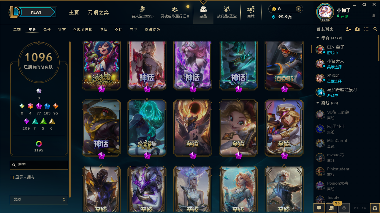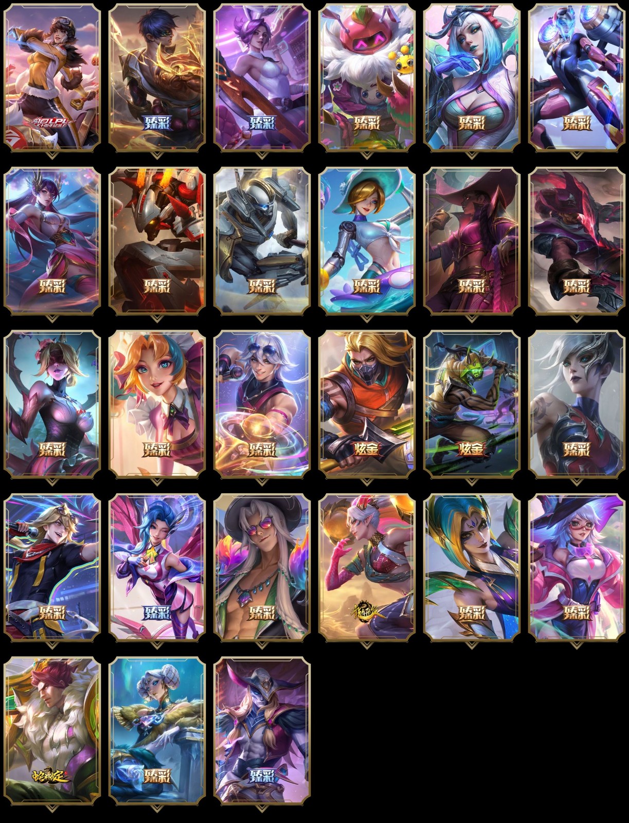【重要皮肤】魔女阿卡丽至臻 玉剑传说琴仙子至臻 斗魂觉醒萨科至臻 斗魂觉醒派克至臻 墨之影武者亚索至臻 花仙使者卡特琳娜至臻 绝息圣堂厄运小姐至臻 剪纸仙灵希维尔至臻 青花瓷丽桑卓至臻 太空律动魔音海妖娜美至臻 海珀利安小队X09星环灵风迦娜至臻 星之守护者辛德拉至臻 海之歌萨勒芬妮至臻 青花瓷拉克丝至臻 神凰行者烈羽焰凰霞至臻 魅惑女巫莫甘娜至臻 女帝黛安娜至臻 战斗学院蕾欧娜至臻 太空律动璐璐至臻 魔女婕拉至臻 奥术师佐伊至臻 未来战士卢锡安至臻 真实伤害亚索至臻 真实伤害赛娜至臻 星之守护者索拉卡至臻 灵魂莲华提莫至臻 灵能特工伊泽瑞尔至臻 暗星墨菲特至臻 神龙尊者炎龙瑟提至臻 黑夜使者凯隐至臻 神龙尊者均衡之龙沃利贝尔至臻 KDA二代卡莎至臻 KDA一代卡莎至臻 KDA卡莎2022至臻 KDA阿狸至臻 KDA阿狸2022至臻 KDA伊芙琳至臻 KDA伊芙琳2022至臻 KDA阿卡丽至臻 战斗学院拉克丝至臻 烈焰美人薇恩至臻 电玩女神凯特琳至臻 魅惑女巫厄运小姐至臻 魅惑女巫厄运小姐2022至臻 星之守护者妮蔻至臻 绒毛菲兹至臻 绒毛菲兹2022至臻 腥红之月亚托克斯至臻 腥红之月亚托克斯2022至臻 未来战士锤石至臻 灰烬骑士派克 灰烬征服者潘森 灰烬杀手塞拉斯 海克斯科技安妮 海克斯科技瑟庄妮 海克斯科技克格莫 海克斯科技斯维因 海克斯科技吉格斯 海克斯科技玛尔扎哈 海克斯科技波比 海克斯科技嘉文四世 海克斯科技阿木木 海克斯科技拉莫斯 海克斯科技魔腾 海克斯科技崔丝塔娜 新卧虎藏龙贾克斯 水晶圣骑艾希 水晶圣骑塔莉垭 水晶圣骑蕾欧娜 暗星科加斯 零之枪骑赫卡里姆 摄魂使者薇恩 新创战纪希维尔 青年瑞兹 胜利剑圣易 胜利女神娑娜 胜利之王泰达米尔 胜利巨口克格莫 哥特萝莉安妮 粉色萝莉崔丝塔娜 创星之灵璐璐 荣誉使者玛尔扎哈 养蜂人辛吉德 勇敢的心德莱厄斯 电玩女神厄运小姐 电玩勇者锐雯 电玩女神阿狸 星之守护者伊泽瑞尔 玉剑传说无影 玉剑传说舞剑仙 玉剑传说无劫 玉剑传说舞龙卫 天龙之子斯莫德 虎头虎脑崔丝塔娜 烈焰仙子黛安娜 龙腾虎跃瑟提 猛虎下山赵信 招财进宝提莫 替父从军花木兰 神龙烈焰金克丝 春晖神女拉克丝 你看见过我的熊猫吗安妮 美猴王孙悟空 定海神珍孙悟空 玉净夜叉凯特琳 紫金罗刹莫甘娜 广寒仙子嫦娥 虎痴之拳蔚 张辽文远 司马懿仲达 金猪烈焰瑟庄妮 烈焰美人薇恩 纳财大帝塔姆 王国机神玄武盖伦 福牛守护者厄斐琉斯 福牛守护者阿利斯塔 胜利之树茂凯 胜利女神奥莉安娜 胜利枪神格雷福斯 胜利枪神卢锡安 胜利之剑亚托克斯 水晶玫瑰迦娜 甜心之翎洛 甜心宝贝安妮 甜心宝贝娑娜 穿心之剑菲奥娜 觅心女王艾希 觅心萝莉金克丝 觅心猫猫悠米 觅心猎手薇恩 幽梦玫瑰泰隆 水晶玫瑰斯维因 冬境仙灵索拉卡 寒冬精灵璐璐 冬季仙境奥莉安娜 冰雪驯鹿波比 冰雪风暴希维尔 冬季仙境卡尔玛 持胡萝卜的雪人易 狂心冰王图奇 冰封王子蒙多 冰雪女神辛德拉 魄罗骑士瑟庄妮 夺命美人卡特琳娜 平安夜女神娑娜 圣诞糖果棒厄运小姐 魅惑女巫迦娜 灵魂收割者索拉卡 克烈古拉伯爵 泳池派对黑默丁格 泳池派对塔里克 泳池派对菲奥娜 泳池派对格雷福斯 泳池派对蕾欧娜 泳池派对雷克顿 御星魔矢艾希 克格汪 EDG厄斐琉斯 EDG佛耶戈 EDG格雷福斯 EDG悠米 EDG佐伊 FPX锤石 FPX墨菲特 SSG伊泽瑞尔 SKTT1娜美 SKTT1阿利斯塔 SKTT1瑞兹 SKTT1伊莉丝 SKTT1雷克顿 SSW锤石 SSW泰隆 SSW图奇 SSW辛吉德 SKTT1贾克斯 SKTT1婕拉 SKTT1李青 SKTT1薇恩 暗杀星奥莉安娜 暗杀星蒙多 暗杀星努努和威朗普 暗杀星慎 Fnatic迦娜 Fnatic库奇 Fnatic古拉加斯 Fnatic嘉文四世 Fnatic卡尔萨斯 冰雪节玛尔扎哈 冰雪节辛吉德 冰雪兽纳尔 防暴士兵格雷福斯 防暴士兵辛吉德 防暴天使凯尔 钢铁之翼艾尼维亚 冠军掠夺者卡兹克 冠军之矛卡莉丝塔 冠军之刃锐雯 冠军之刃锐雯2016 冠军之血希瓦娜 冠军之隐劫 鬼影森森茂凯 鬼影重重魔腾 胡桃夹子萨科 惊悚派对阿木木 警用试作体K9内瑟斯 魅惑女巫娜美 密林猎手提莫 南瓜头费德提克 圣诞精灵崔丝塔娜 圣诞开心鬼提莫 圣诞狂欢基兰 圣诞狂欢努努和威朗普 圣诞老人古拉加斯 圣诞玩偶波比 圣诞驯鹿克格莫 糖果使徒费德提克 外星装甲库奇 卧虎藏龙贾克斯 无头骑士赫卡里姆 喜庆之树茂凯 邪恶圣诞老人维迦 幸福女神乐芙兰 雪默丁格 野兽猎人德莱文 野兽猎人泰达米尔 英勇玩具兵普朗克 永恒之森乐芙兰 勇者奈德丽 征服者阿利斯塔 暗影沃里克 魅惑女巫菲奥娜 阿木木主人不要我了 2021全球总决赛嘉文四世 波比的巧克力工坊 都铎王朝图奇 十五周年纪念希维尔 十周年纪念安妮 源代码乐芙兰 神凰行者瑞羽圣凰艾尼维亚 胜利凤凰艾尼维亚 DJ娑娜 大元素使拉克丝 灵魂守卫乌迪尔 未来战士伊泽瑞尔 绝息圣堂洛