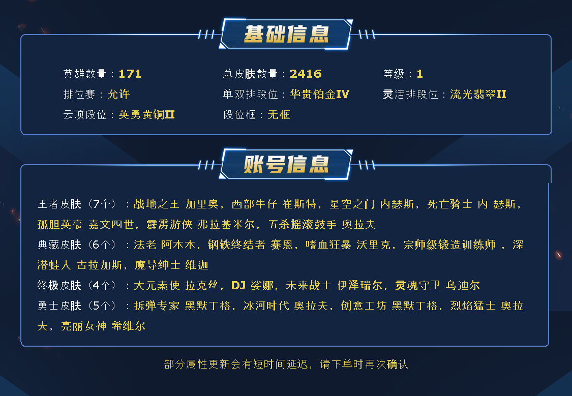 ~~喜欢记得收藏~~可排位~~2408皮全英雄~~租之前尽量查一下游戏ID,确保段位是您需要的,避免浪费您的时间~~请勿挂机逃跑故意送人头,谢谢合作,谢谢~~