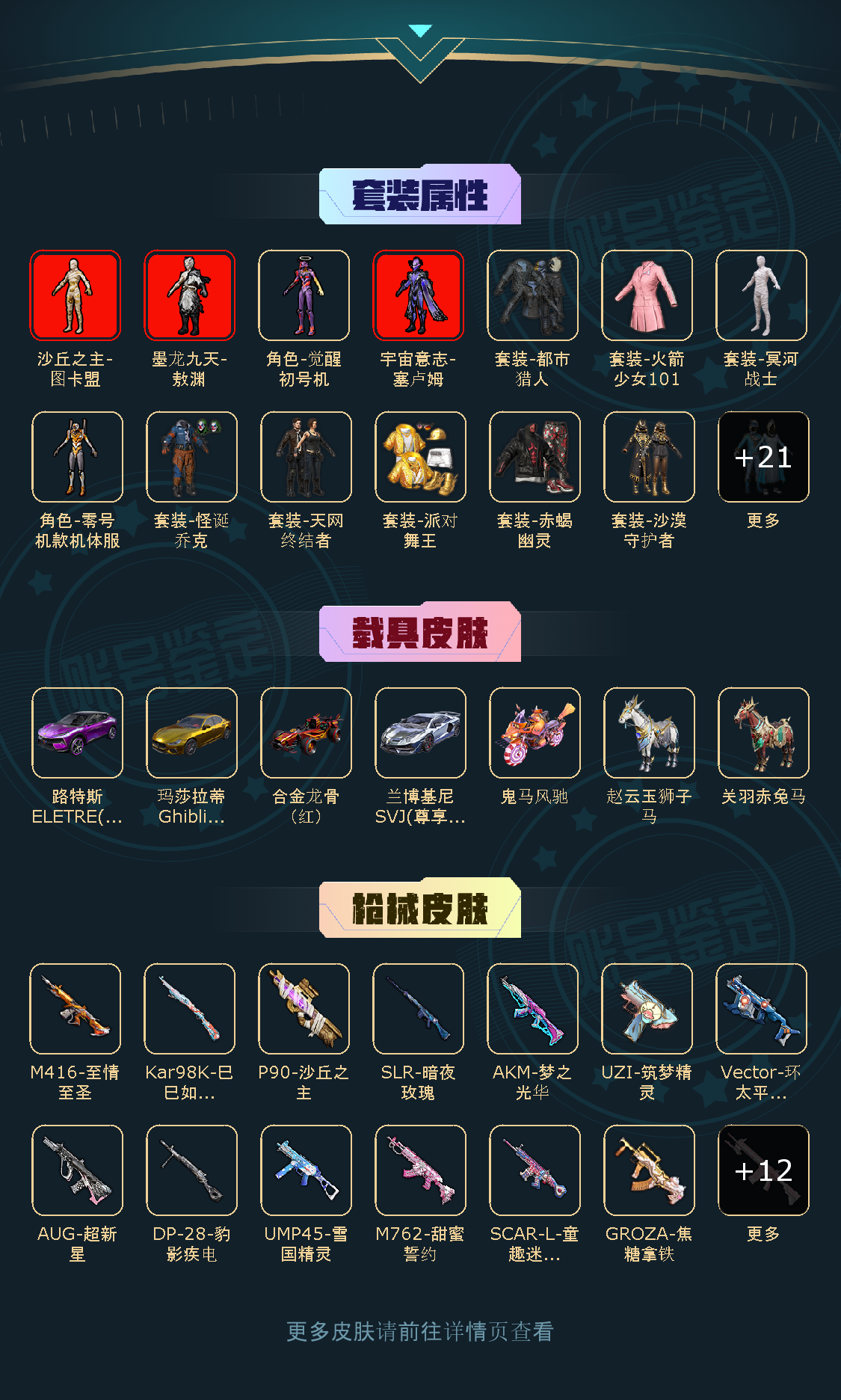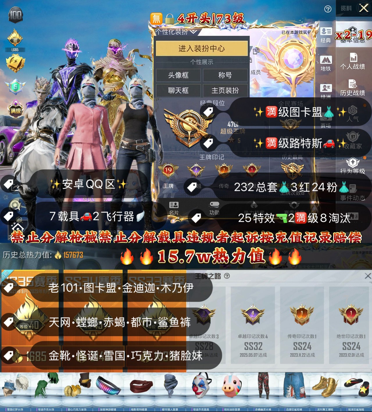租号过程中,发广告,骗人等,发现直接改密码顶号,举报到平台封号封实名。开挂分解枪械 分解载具 改ID等等违规行为直接起诉,本店所有账号公安已备案,请勿以身试法,文明游戏152402热力值 16王牌印记 历史卓越王牌18星 218套装 306枪皮 【7载具】 路特斯EL紫色 (6级) 玛莎拉蒂金色 兰博SVJ尊享铂 合金龙骨红色 照夜玉狮子 赤兔 鬼马风驰 【3神装】 宇宙意志-塞卢姆 (1级) 墨龙九天-敖渊 (1级) 沙丘之主-图卡盟 (7级) 【9稀有】 火箭少女101 木乃伊 赤蝎幽灵 AKM-缤纷海域 AKM-百万伏特 都市猎人 派对舞王 天网终结者 派对舞王(金靴子) 【24粉装】 觉醒初号机 黄螳螂 圣堂之誓 雪国幻梦 宝贝奶油派 天使彩虹糖 甜心巧克力 千金淑猫 洛天依 天星战神 怪诞乔克 飒粉甜心 呆萌星弥 小可学妹 缤纷油彩 放客神游 快乐主宰 极限特训 第五大道 赛罗闪耀型 闪耀迪迦型 独舞天鹅 桀骜红莲 暗夜玫瑰 【24特效枪】 M416-墨龙九天 (2级) P90-沙丘之主 (2级) UMP45-雪国精灵 (5级) UMP45-宇宙意志 (1级) Kar98K-巳巳如意 (5级) M762-甜蜜誓约 (5级) P90-能量风暴 (5级) PKM-天星战神 (4级) AUG-超新星 (5级) SCAR-L-童趣迷兔 (5级) DP-28-圣堂之誓 (3级) UZI-筑梦精灵 (5级) M416-暖熊萌萌 (1级) M416-至情至圣 (6级) 汤姆逊-怪笑疯兔 (1级) M417-第五大道 (4级) AKM-梦之光华 (5级) SLR-暗夜玫瑰 (5级) M416-风花雪月 (1级) MG3-洛神天依 (3级) 平底锅-林间仙鹿 (3级) Vector-环太平洋 (5级) GROZA-焦糖拿铁 (4级) 破片手榴弹-秋玉花灯 (6级) 【9飞行器】 龙翔九天飞行器 绮梦青鸾飞行器 甜蜜誓约飞行器 齐天大圣飞行器 深渊漩涡飞行器 繁龙极客飞行器 千面幻镜飞行器 闪光银龙飞行器 天之羽翼飞行器 【30热门】 8号机 Mark.06 龟仙人 呆萌铁蟹 鹰眼刺客 沙漠守护者 迅捷狂鲨 深海小丑鱼 罗小黑 胖达圆圆 胖达团团 梦起落英 暗夜契约 怪笑疯兔 诡面顽熊 暗影哥特 迪迦奥特曼 赛罗奥特曼 醒狮腾龙 团圆交子 瑞龙福将 纯白誓言 豚鼠丹丹 水银刺客 漫步者 冰爽海盐 弄潮海豚 M416-快乐主宰 M762-瑞龙福将 M24-奇异狩猎者 【6头盔】 雪国精灵头盔 甜心宝贝头盔 百万伏特头盔 深海小丑鱼头盔 金羽特工头盔 甜蜜誓约头盔 【7背包】 雪国精灵背包 甜心宝贝背包 百万伏特背包 幻影战神背包 萌熊伴侣背包 深海小丑鱼背包 甜蜜誓约背包