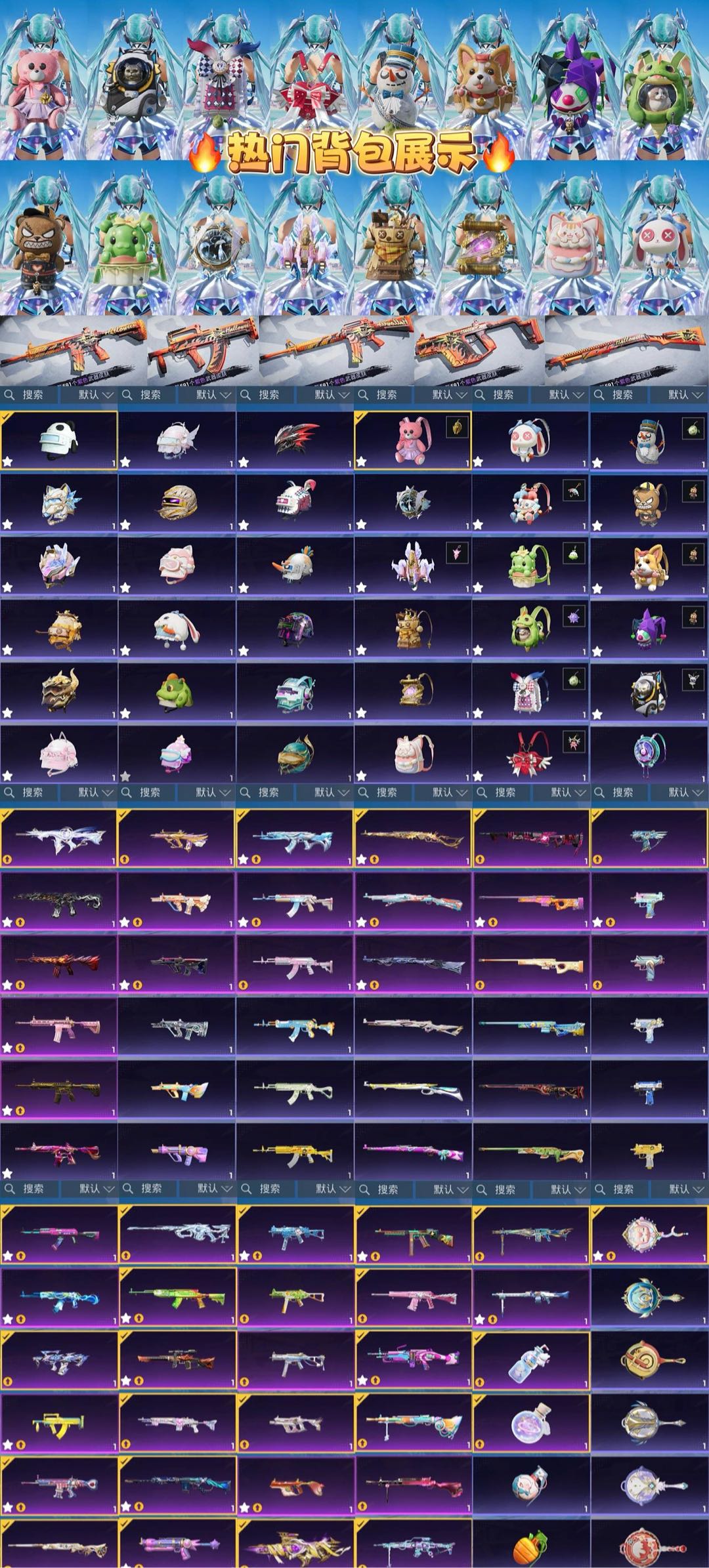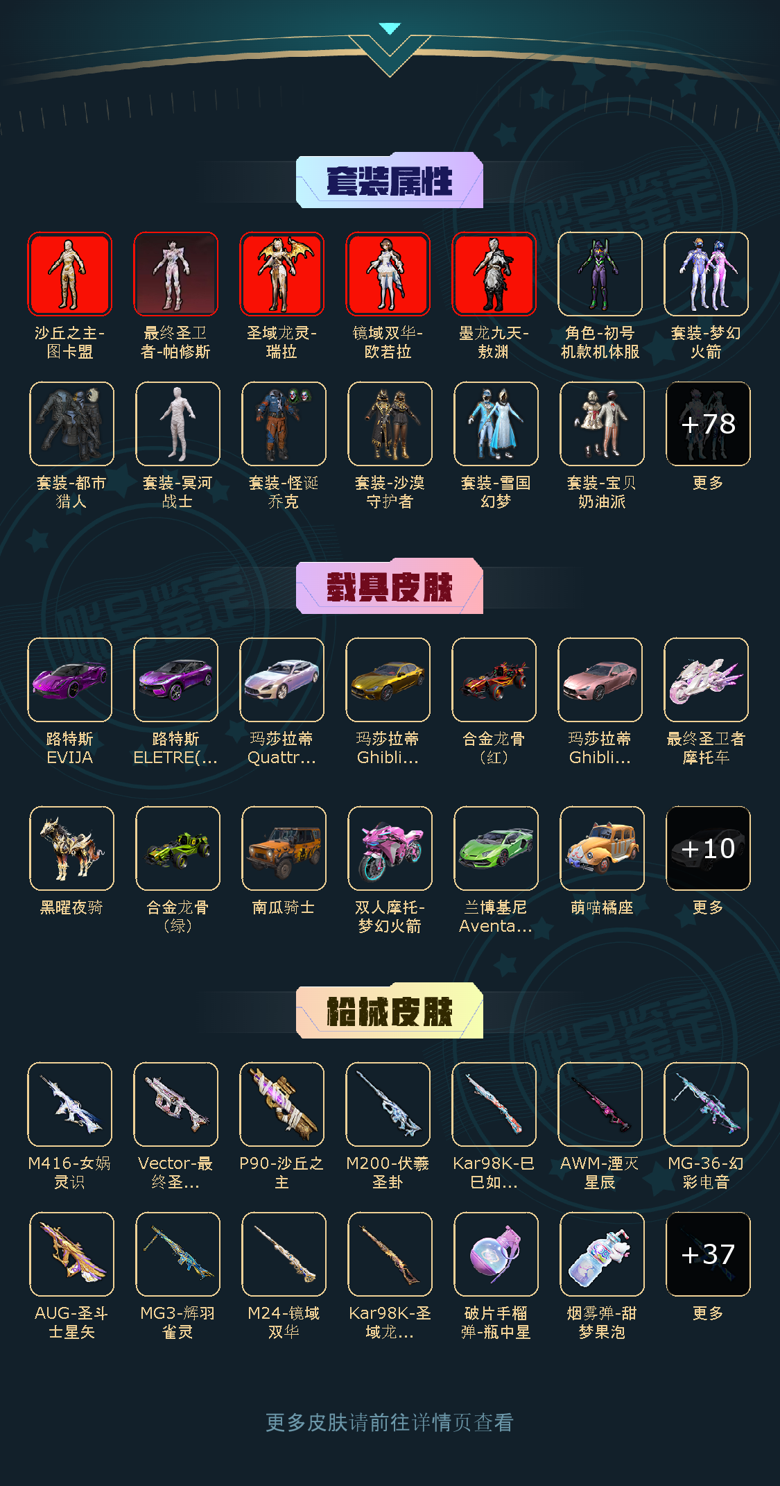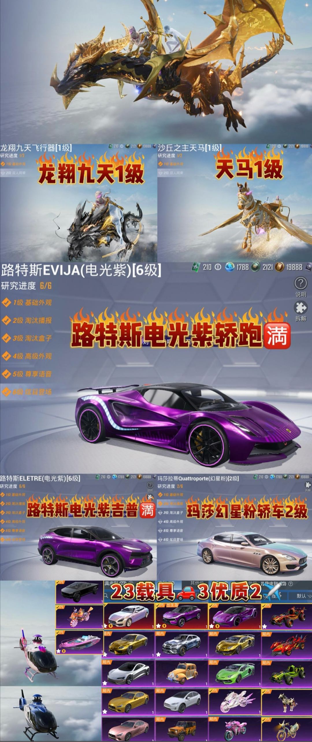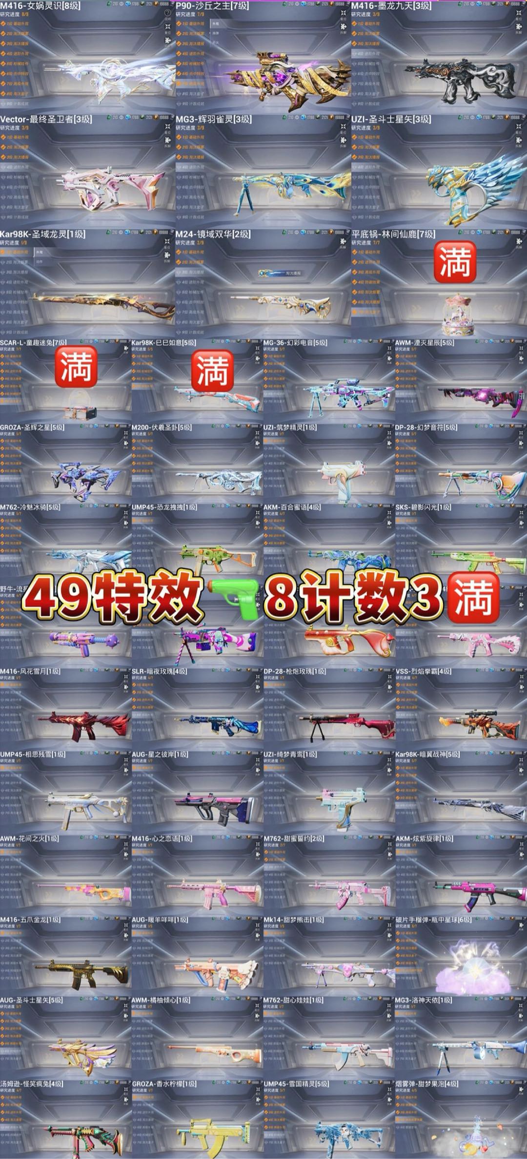 88粉,23载具,49特效枪,427套装,15王牌印记 UZI-绮梦青鸾/SCAR-L-童趣迷兔/SKS-碧影闪光/M416-风花雪月/AUG-星之彼岸/AWM-花间之火/M762-甜心娃娃/汤姆逊-怪笑疯兔/Vector-红伞翩翩/GROZA-香水柠檬/AWM-橘柚倾心/M416-心之恋语/平底锅-林间仙鹿/M416-五爪金龙/DP-28-枪炮玫瑰/DP-28-幻梦音符/AKM-炫紫旋律/MG3-洛神天依/M762-冷魅冰骑/AKM-百合蜜语/UZI-筑梦精灵/SLR-暗夜玫瑰/S12K-海渊国主/VSS-烈焰拳霸/Kar98K-暗翼战神/UMP45-雪国精灵/M762-甜蜜誓约/UMP45-相思残雪/UMP45-恐龙拽拽/M249-蓝莓炮弹/野牛-流星咚咚/兰博基尼Aventador(翡翠绿)/玛莎拉蒂Ghibli(金)/萌喵橘座/特斯拉Model X(珍珠白)/特斯拉Roadster(尊享铂)/双人摩托-梦幻火箭/兰博基尼URUS(尊享铂)/特斯拉Cybertruck(极昼黑)/兰博基尼Estoque(炫光金)/焰龙咆哮/快艇-塞莎KL27(霓虹粉)/合金龙骨(绿)/鬼马风驰/南瓜骑士/合金龙骨(红)/玛莎拉蒂Ghibli(粉)/兰博基尼SVJ(炫光金)