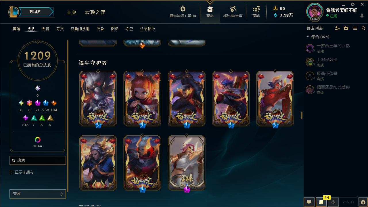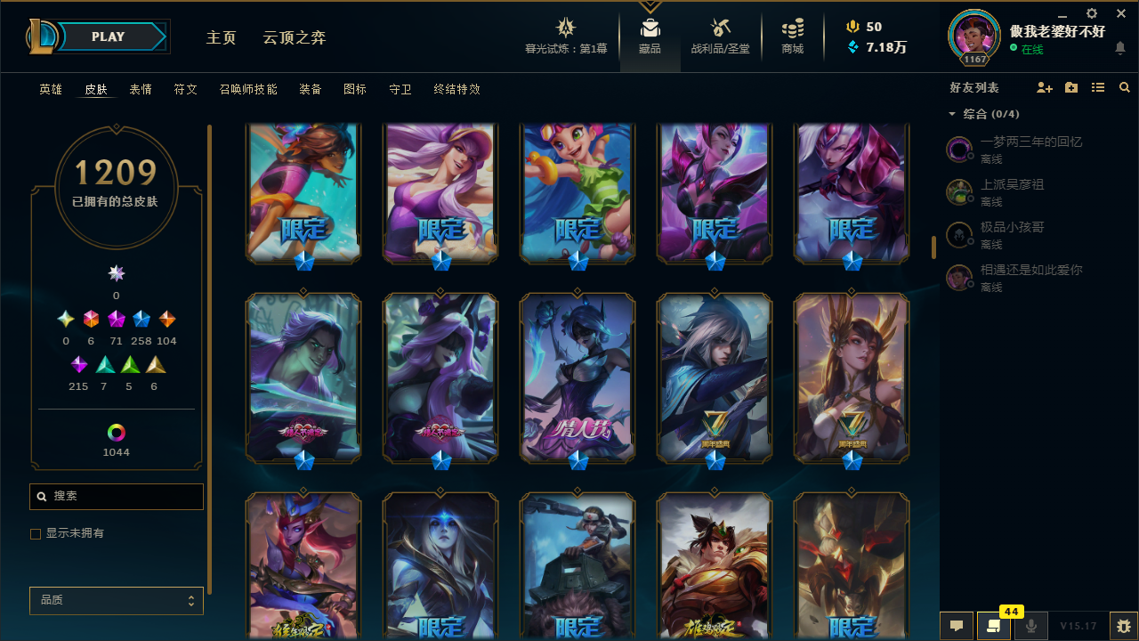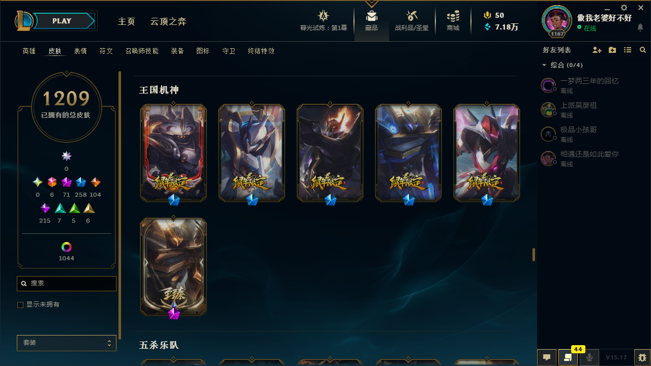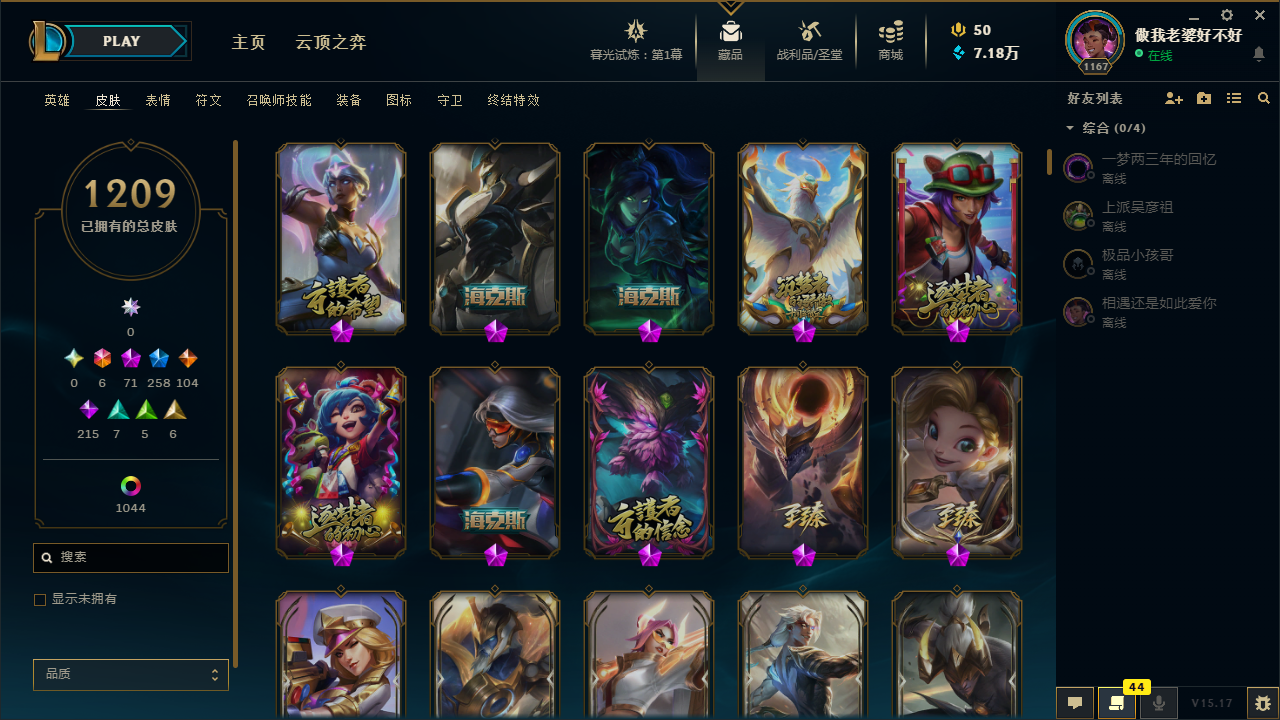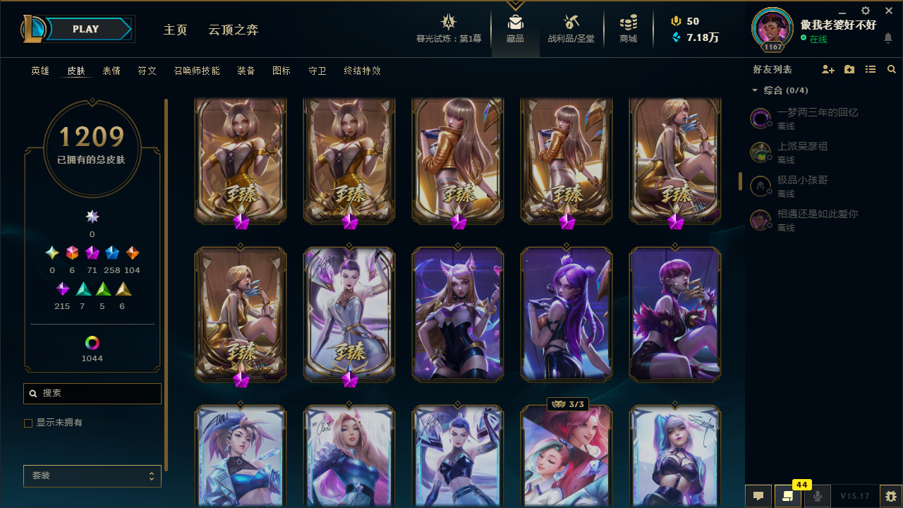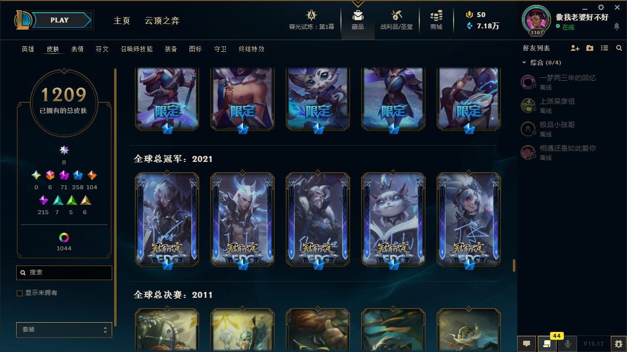 【重要皮肤】星之守护者辛德拉至臻 幻灵战斗猫金克丝至臻 青花瓷拉克丝至臻 神凰行者烈羽焰凰霞至臻 魅惑女巫莫甘娜至臻 女帝黛安娜至臻 战斗学院蕾欧娜至臻 太空律动璐璐至臻 魔女婕拉至臻 魔女乐芙兰至臻 奥术师佐伊至臻 未来战士卢锡安至臻 真实伤害亚索至臻 真实伤害赛娜至臻 星之守护者索拉卡至臻 灵魂莲华提莫至臻 灵能特工伊泽瑞尔至臻 福牛守护者菲奥娜至臻 源计划逆流塞拉斯至臻 源计划阴劫至臻 王国机神玄武盖伦至臻 暗星墨菲特至臻 神龙尊者炎龙瑟提至臻 黑夜使者凯隐至臻 神龙尊者均衡之龙沃利贝尔至臻 征服者贾克斯至臻 飞升战神潘森至臻 焰执事布兰德至臻 KDA二代卡莎至臻 KDA一代卡莎至臻 KDA卡莎2022至臻 KDA阿狸至臻 KDA阿狸2022至臻 KDA伊芙琳至臻 KDA伊芙琳2022至臻 烈焰美人薇恩至臻 烈焰美人薇恩2022至臻 电玩女神凯特琳至臻 魅惑女巫厄运小姐至臻 魅惑女巫厄运小姐2022至臻 源计划正义艾瑞莉娅至臻 真实伤害奇亚娜至臻 真实伤害奇亚娜2022至臻 绒毛菲兹至臻 绒毛菲兹2022至臻 玉剑传说武剑仙至臻 玉剑传说武剑仙2022至臻 腥红之月亚托克斯至臻 腥红之月亚托克斯2022至臻 未来战士锤石至臻 未来战士锤石2022至臻 黑夜使者李青至臻 黑夜使者李青2022至臻 灰烬骑士派克 海克斯科技安妮 海克斯科技雷克顿 海克斯科技吉格斯 海克斯科技嘉文四世 海克斯科技阿木木 海克斯科技魔腾 永恒之森奥恩 光明哨兵奥拉夫 黎明使者卡尔玛 恐惧新星德莱厄斯 零之枪骑赫卡里姆 摄魂使者薇恩 新创战纪希维尔 青年瑞兹 胜利剑圣易 胜利女神娑娜 胜利之王泰达米尔 胜利巨口克格莫 舞会公主安妮 战熊骑士瑟庄妮 创星之灵璐璐 养蜂人辛吉德 安妮梦游仙境 电玩女神厄运小姐 电玩勇者锐雯 电玩女神阿狸 星之守护者伊泽瑞尔 玉剑传说无影 玉剑传说舞剑仙 神凰行者幽羽玄凰萨勒芬妮 神凰行者烈羽焰凰霞 星之守护者佐伊 灵能特工易 点心宝贝阿木木 龙的传人李青 虎头虎脑崔丝塔娜 烈焰仙子黛安娜 替父从军花木兰 神龙烈焰金克丝 碧玉之牙卡西奥佩娅 春晖神女拉克丝 你看见过我的熊猫吗安妮 南天之怒沃里克 美猴王孙悟空 定海神珍孙悟空 玉净夜叉凯特琳 紫金罗刹莫甘娜 广寒仙子嫦娥 虎痴之拳蔚 张辽文远 司马懿仲达 金猪烈焰瑟庄妮 烈焰美人薇恩 纳财大帝塔姆 神龙之翼库奇 征服者贾克斯 王国机神青龙德莱文 王国机神朱雀蕾欧娜 王国机神苍狼瑟提 王国机神白虎贾克斯 王国机神玄武盖伦 福牛守护者安妮 福牛守护者厄斐琉斯 福牛守护者德莱厄斯 福牛守护者阿利斯塔 福牛守护者嘉文四世 福牛守护者菲奥娜 胜利女神瑟庄妮 胜利机器人布里茨 胜利枪神卢锡安 怦然心动凯特琳 意乱情迷蔚 水晶玫瑰阿克尚 水晶玫瑰迦娜 幽梦玫瑰伊莉丝 碎心之拳蔚 甜心之羽霞 甜心之翎洛 甜心宝贝安妮 甜心宝贝娑娜 觅心游侠卢锡安 觅心魔灵奥莉安娜 觅心女王艾希 觅心之翼奎因 觅心萝莉金克丝 觅心猫猫悠米 觅心猎手薇恩 幽梦玫瑰辛德拉 幽梦玫瑰泰隆 水晶玫瑰婕拉 水晶玫瑰斯维因 双城之战2微光实验室辛吉德 北极星圣贤基兰 冬境仙灵索拉卡 寒冬精灵璐璐 冬季仙境奥莉安娜 雪球也能爆炸吉格斯 圣诞捣蛋鬼金克丝 圣诞老人布隆 圣诞老人德莱文 冰雪驯鹿波比 冬季仙境卡尔玛 持胡萝卜的雪人易 狂心冰王图奇 冰封王子蒙多 冰雪女神辛德拉 魄罗骑士瑟庄妮 夺命美人卡特琳娜 平安夜女神娑娜 圣诞糖果棒厄运小姐 魅惑女巫迦娜 魅惑女巫厄运小姐 魅惑女巫莫甘娜 魅惑女巫崔丝塔娜 魅惑女巫奈德丽 魅惑女巫伊莉丝 伯爵卡萨丁 大魔法锅布里茨 大魔王提莫 死亡誓约劫 灵魂收割者索拉卡 克烈古拉伯爵 小恶魔菲兹 南瓜头王子阿木木 海之歌萨勒芬妮 泳池派对凯特琳 泳池派对佐伊 泳池派对普朗克 泳池派对辛德拉 泳池派对奥莉安娜 泳池派对嘉文四世 泳池派对黑默丁格 泳池派对塔莉垭 泳池派对厄运小姐 泳池派对塔里克 泳池派对菲奥娜 泳池派对格雷福斯 泳池派对李青 泳池派对蕾欧娜 泳池派对雷克顿 泳池派对瑟提 泳池派对布隆 电玩战魂赫卡里姆 穿星魔锋赵信 御星魔矢艾希 送披萨的小姐姐希维尔 鸡里奥 克格汪 制胜金靴李青 制胜金球拉莫斯 EDG厄斐琉斯 EDG佛耶戈 EDG格雷福斯 EDG悠米 EDG佐伊 DWG烬 DWG凯南 DWG奈德丽 FPX锤石 FPX薇恩 FPX李青 FPX墨菲特 iG卡蜜尔 iG卡莎 iG乐芙兰 SSG洛 SSG纳尔 SSG塔莉垭 SSG嘉文四世 SSG伊泽瑞尔 SKTT1扎克 SKTT1烬 SKTT1娜美 SKTT1艾克 SKTT1奥拉夫 SKTT1阿利斯塔 SKTT1卡莉丝塔 SKTT1瑞兹 SKTT1阿兹尔 SKTT1伊莉丝 SKTT1雷克顿 SSW锤石 SSW雷恩加尔 SSW泰隆 SSW图奇 SSW辛吉德 SKTT1贾克斯 SKTT1劫 SKTT1婕拉 SKTT1李青 SKTT1薇恩 暗杀星奥莉安娜 暗杀星蒙多 暗杀星努努和威朗普 暗杀星伊泽瑞尔 暗杀星慎 Fnatic迦娜 Fnatic库奇 Fnatic古拉加斯 Fnatic嘉文四世 Fnatic卡尔萨斯 冰雪节格雷福斯 冰雪节玛尔扎哈 冰雪节辛吉德 冰雪兽纳尔 防暴机器人布里茨 防暴士兵格雷福斯 防暴士兵辛吉德 钢铁之翼艾尼维亚 冠军典狱长锤石 冠军掠夺者卡兹克 冠军蔷薇乐芙兰 冠军之矛卡莉丝塔 冠军之刃锐雯2016 冠军之血希瓦娜 冠军之隐劫 冠军之志瑞兹 春晖山神墨菲特 鬼影森森茂凯 鬼影重重魔腾 海贼瑞兹 红桃杰克崔斯特 胡桃夹子萨科 惊悚派对阿木木 惊悚派对费德提克 警用试作体K9内瑟斯 蓝色忧郁崔斯特 魅惑女巫