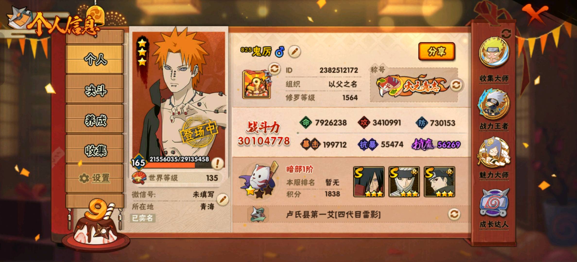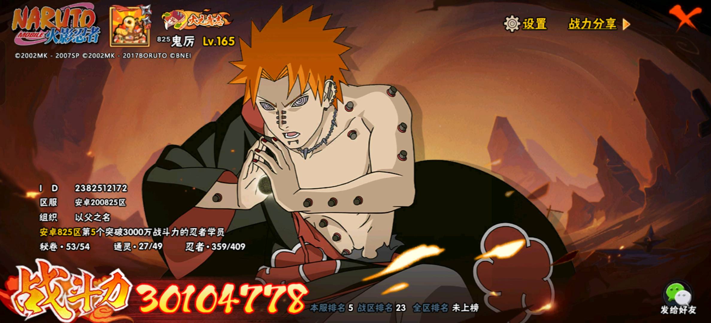 ⅴ区53个S忍,3010万战力。本区榜五。欢迎收藏!!!