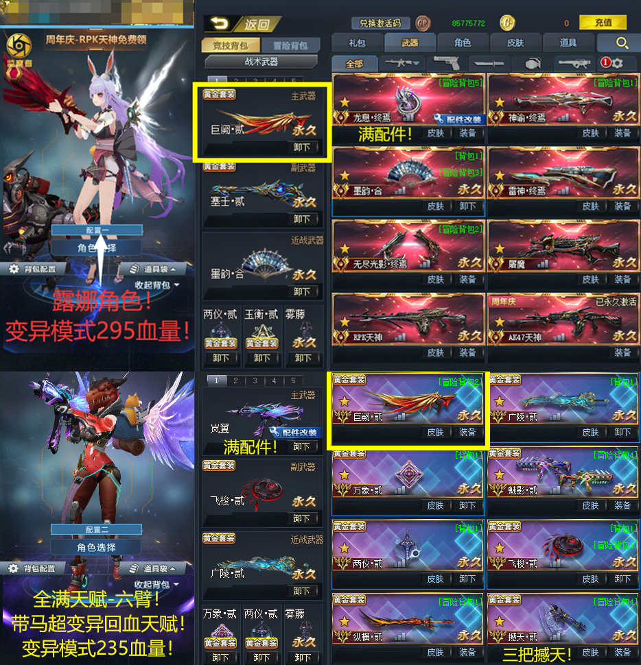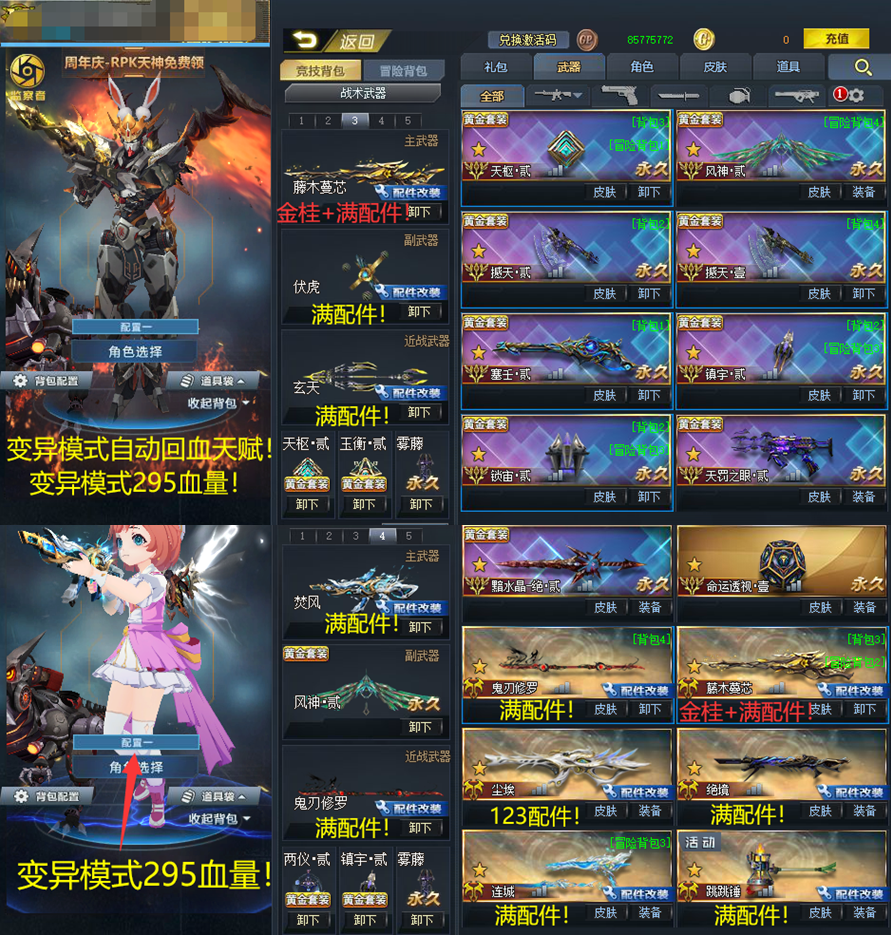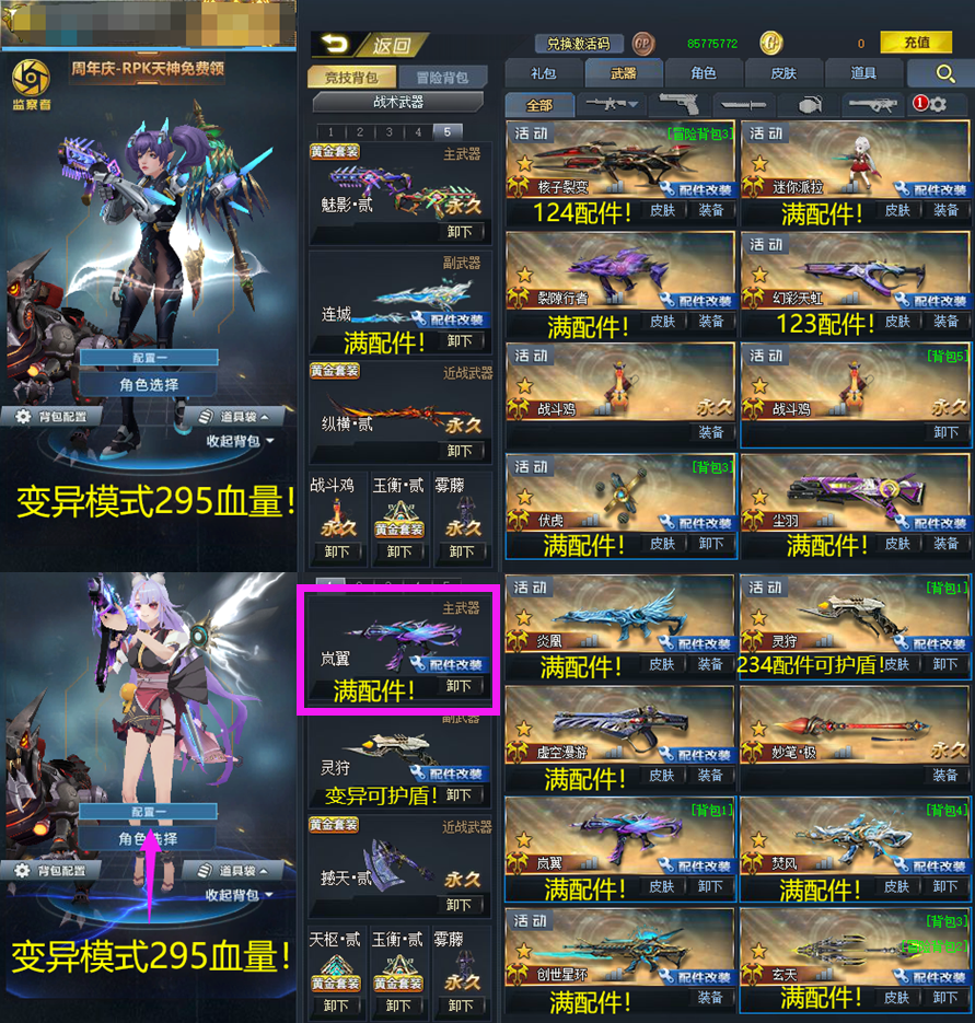 满配件武器:岚翼!金桂•藤木蔓芯!裂隙行者!冰•炎凰!124核子裂变!迷你派拉!灵狩!鬼刃修罗!幻彩天虹!虚空漫游!123尘埃!绝境!焚风!连城!跳跳锤!伏虎!尘羽!玄天!等