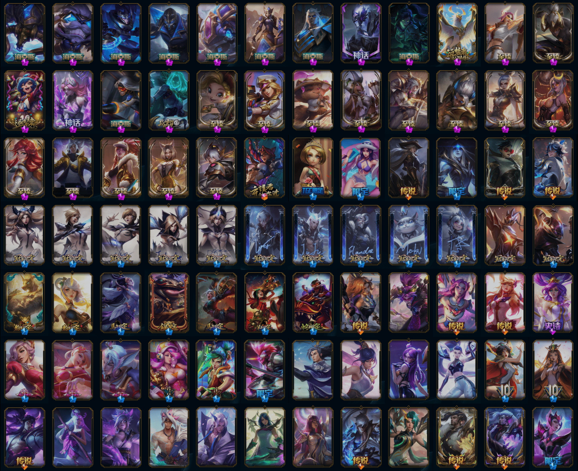 【重要皮肤】女帝黛安娜至臻 奥术师佐伊至臻 真实伤害亚索至臻 灵魂莲华提莫至臻 福牛守护者菲奥娜至臻 神龙尊者炎龙瑟提至臻 KDA阿狸至臻 KDA阿狸2022至臻 KDA阿卡丽至臻 战斗学院拉克丝至臻 战斗学院拉克丝2022至臻 烈焰美人薇恩至臻 烈焰美人薇恩2022至臻 电玩女神凯特琳至臻 电玩女神凯特琳2022至臻 魅惑女巫厄运小姐至臻 魅惑女巫厄运小姐2022至臻 源计划正义艾瑞莉娅至臻 源计划正义艾瑞莉娅2022至臻 玉剑传说武剑仙至臻 玉剑传说武剑仙2022至臻 黑夜使者李青至臻 黑夜使者李青2022至臻 灰烬杀手塞拉斯 海克斯科技瑟庄妮 海克斯科技克格莫 海克斯科技斯维因 海克斯科技吉格斯 海克斯科技嘉文四世 海克斯科技阿利斯塔 水晶圣骑蕾欧娜 摄魂使者薇恩 新创战纪希维尔 胜利剑圣易 胜利之王泰达米尔 胜利巨口克格莫 舞会公主安妮 电玩女神厄运小姐 电玩勇者锐雯 电玩女神阿狸 神凰行者幽羽玄凰萨勒芬妮 神凰行者烈羽焰凰霞 海珀利安小队Y03权天使卡蜜尔 黎明使者薇恩 虎头虎脑崔丝塔娜 招财进宝提莫 替父从军花木兰 神龙烈焰金克丝 碧玉之牙卡西奥佩娅 春晖神女拉克丝 北辰之威内瑟斯 美猴王孙悟空 玉净夜叉凯特琳 紫金罗刹莫甘娜 广寒仙子嫦娥 虎痴之拳蔚 司马懿仲达 金猪烈焰瑟庄妮 烈焰美人薇恩 纳财大帝塔姆 神龙之翼库奇 胜利女神奥莉安娜 胜利枪神卢锡安 胜利之剑亚托克斯 甜心之翎洛 甜心宝贝娑娜 穿心之剑菲奥娜 觅心游侠卢锡安 觅心魔灵奥莉安娜 觅心女王艾希 觅心之翼奎因 觅心猎手薇恩 雪球也能爆炸吉格斯 冰雪驯鹿波比 冰雪风暴希维尔 冰雪女神辛德拉 魄罗骑士瑟庄妮 夺命美人卡特琳娜 平安夜女神娑娜 圣诞糖果棒厄运小姐 魅惑女巫莫甘娜 魅惑女巫崔丝塔娜 死亡誓约卡特琳娜 灵魂收割者索拉卡 南瓜头王子阿木木 泳池派对凯特琳 泳池派对普朗克 泳池派对奥莉安娜 泳池派对厄运小姐 泳池派对塔里克 泳池派对菲奥娜 泳池派对李青 泳池派对雷克顿 电玩战魂赫卡里姆 御星魔矢艾希 送披萨的小姐姐希维尔 鸡里奥 克格汪 制胜金靴李青 EDG厄斐琉斯 EDG佛耶戈 EDG格雷福斯 EDG悠米 EDG佐伊 FPX锤石 FPX薇恩 FPX李青 FPX普朗克 FPX墨菲特 iG卡蜜尔 iG洛 iG卡莎 iG艾瑞莉娅 iG乐芙兰 iG菲奥娜 SSG嘉文四世 SSG伊泽瑞尔 SKTT1奥拉夫 SKTT1阿兹尔 SKTT1伊莉丝 SKTT1雷克顿 SSW锤石 SSW雷恩加尔 SSW图奇 SSW辛吉德 SKTT1贾克斯 SKTT1劫 SKTT1婕拉 暗杀星奥莉安娜 暗杀星蒙多 暗杀星努努和威朗普 Fnatic迦娜 Fnatic古拉加斯 Fnatic嘉文四世 Fnatic卡尔萨斯 冰雪节玛尔扎哈 冰雪节辛吉德 防暴士兵辛吉德 防暴天使凯尔 钢铁之翼艾尼维亚 冠军典狱长锤石 冠军掠夺者卡兹克 冠军之矛卡莉丝塔 冠军之刃锐雯2016 冠军之血希瓦娜 冠军之隐劫 冠军之志瑞兹 鬼影森森茂凯 鬼影重重魔腾 海贼瑞兹 红桃杰克崔斯特 胡桃夹子萨科 惊悚派对阿木木 警用试作体K9内瑟斯 密林猎手提莫 南瓜头费德提克 女猎手希维尔 圣诞精灵崔丝塔娜 圣诞开心鬼提莫 圣诞狂欢基兰 圣诞狂欢努努和威朗普 圣诞老人古拉加斯 圣诞玩偶波比 圣诞驯鹿克格莫 糖果使徒费德提克 外星装甲库奇 无头骑士赫卡里姆 喜庆之树茂凯 邪恶圣诞老人维迦 幸福女神乐芙兰 雪默丁格 雪球也能爆炸吉格斯 雪装奈德丽 野兽猎人德莱文 野兽猎人瑟庄妮 野兽猎人泰达米尔 英勇玩具兵普朗克 永恒之森乐芙兰 勇者阿狸 勇者奈德丽 征服者卡尔玛 征服者韦鲁斯 暗影沃里克 冠军之箭艾希 机械迷城加里奥 阿木木主人不要我了 2022全球总决赛阿兹尔 2021全球总决赛嘉文四世 波比的巧克力工坊 都铎王朝图奇 十五周年纪念希维尔 十周年纪念安妮 源代码乐芙兰 神凰行者瑞羽圣凰艾尼维亚 胜利凤凰艾尼维亚 斗魂觉醒莎弥拉 灵魂守卫乌迪尔 未来战士伊泽瑞尔 绝息圣堂洛