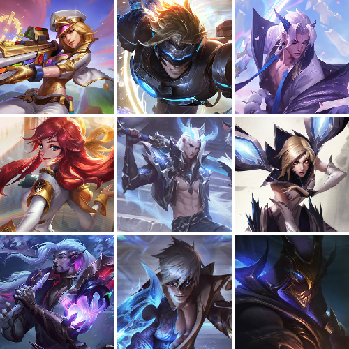 【传说皮肤】冰霜亚龙希瓦娜 灵魂莲华锤石 魔幻卡牌崔斯特 蔷薇绅士杰斯 星之守护者卡莎 钢铁军团盖伦 战地机甲厄加特 大天使长米迦勒凯尔 女主播迦娜 冰川巨兽墨菲特 第三类接触黑默丁格 黑夜使者亚索 宇航员诺提勒斯 提莫约德尔人的一大步 地狱之门卫士加里奥 至尊魔女莫甘娜 太空律动猫猫布里和里茨 女校长菲奥娜 黎明使者锐雯 星之守护者金克丝 腥红之月鬼武姬阿卡丽 电玩女神娑娜 霸天异形卡兹克 未来战士凯特琳 钢铁之翼凯尔 约德尔国队长提莫 天煞劫 神拳李青 战地巨兽科加斯 青花瓷伊泽瑞尔 光明哨兵格雷福斯 丧尸布兰德 女警狙击凯特琳 战斗学院伊泽瑞尔 黯黑魔龙希瓦娜 最终BOSS维迦 恶魔之刃泰达米尔 合金巨兽努努和威朗普 邪鸦魅影乐芙兰 冰霜之刃艾瑞莉娅 死亡骑士盖伦 银河魔装机神兰博 铁哥们儿奥拉夫 神龙尊者夜月幻龙亚索 红色男爵库奇 源计划联合艾希 源计划林易 神龙尊者圣龙李青 灌篮高手德莱厄斯 暗星锤石 屠龙勇士潘森 泳池派对吉格斯 西部魔影卢锡安 陆地王者4WD布里茨 女皇艾希 战场女武神凯尔 源计划净化薇恩 日蚀骑士蕾欧娜 驯龙炮手崔丝塔娜 黎明使者索拉卡 欧米伽小队幽灵特工 恶魔男爵瑞兹 神王盖伦 炼狱魔犬内瑟斯 鬼魂新娘莫甘娜 金牌主播德莱文 绅士科加斯 黯晶凤凰艾尼维亚 西部天使艾希 苍穹之光韦鲁斯 苹果机器人布里茨 星之守护者霞 律政大亨蒙多 光明哨兵薇恩 双重冰晶艾尼维亚 神龙尊者昼日真龙亚索 焰尾妖狐阿狸 符文战熊沃利贝尔 血石领主弗拉基米尔 烈焰雄心崔丝塔娜 幻灵战斗队长厄运小姐 星之守护者阿狸 神王德莱厄斯 偶像歌手阿狸 枯萎之壤泽拉斯
