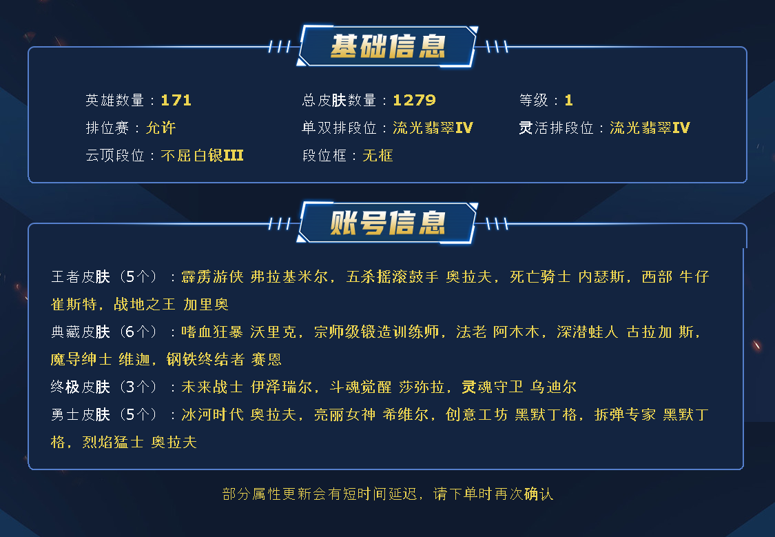 ~~喜欢记得收藏~~可排位~~1300皮全英雄~~租之前尽量查一下游戏ID,确保段位是您需要的,避免浪费您的时间~~请勿挂机逃跑故意送人头,谢谢合作,谢谢~~