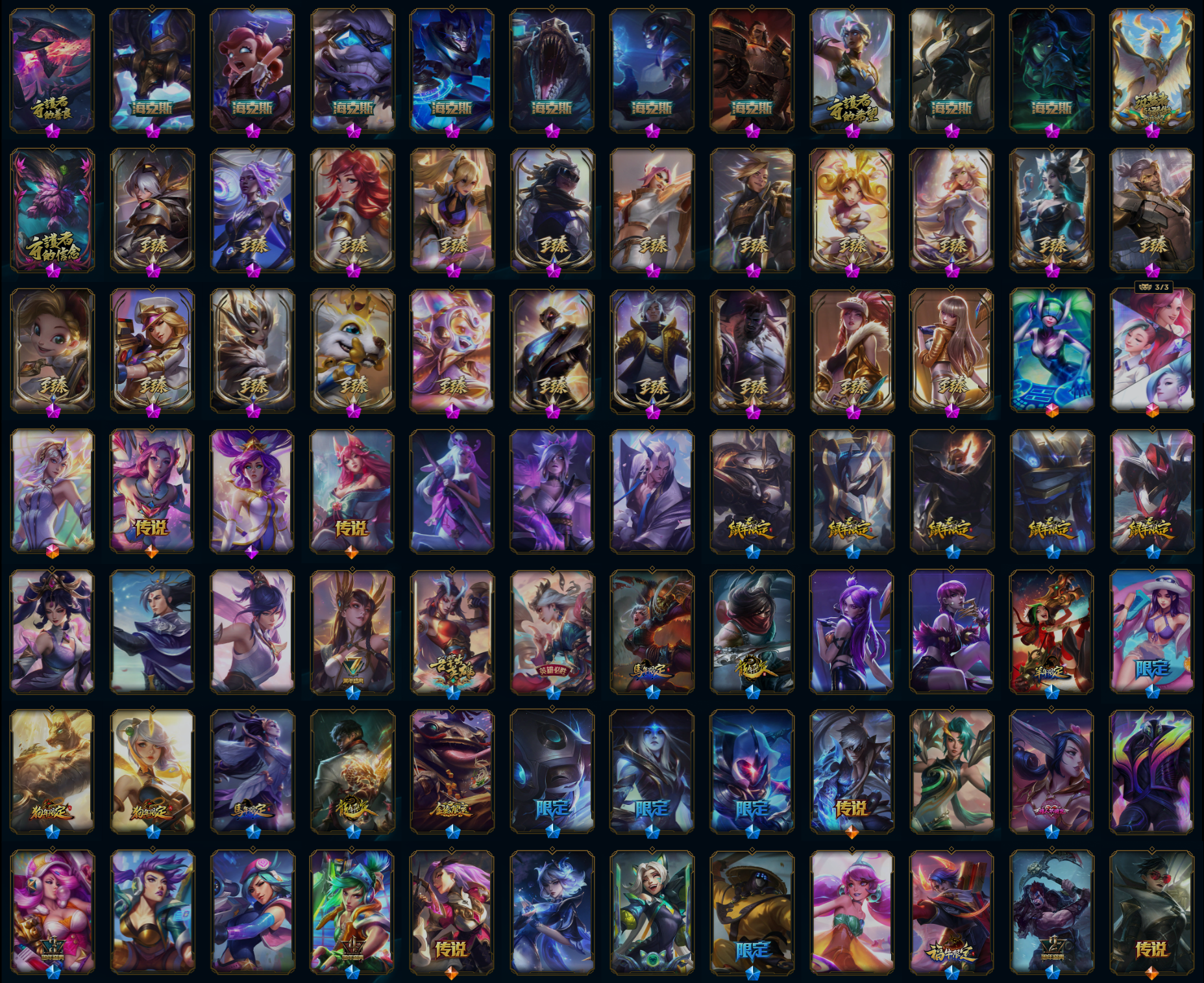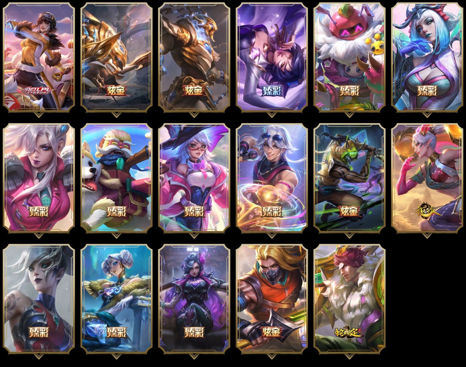 【重要皮肤】至高天奎桑提至臻 星之守护者辛德拉至臻 月蚀骑士赛娜至臻 战斗学院蕾欧娜至臻 太空律动璐璐至臻 魔女婕拉至臻 奥术师佐伊至臻 真实伤害亚索至臻 真实伤害赛娜至臻 星之守护者索拉卡至臻 灵能特工伊泽瑞尔至臻 福牛守护者菲奥娜至臻 源计划逆流塞拉斯至臻 KDA一代卡莎至臻 KDA卡莎2022至臻 KDA阿卡丽至臻 KDA阿卡丽2022至臻 战斗学院拉克丝至臻 电玩女神凯特琳至臻 电玩女神凯特琳2022至臻 星之守护者妮蔻至臻 源计划正义艾瑞莉娅至臻 绒毛菲兹至臻 绒毛菲兹2022至臻 未来战士锤石至臻 未来战士锤石2022至臻 海克斯科技安妮 海克斯科技雷克顿 海克斯科技吉格斯 海克斯科技玛尔扎哈 海克斯科技波比 海克斯科技嘉文四世 海克斯科技阿利斯塔 永恒之森奥恩 暗星科加斯 黎明使者卡尔玛 恐惧新星德莱厄斯 零之枪骑赫卡里姆 摄魂使者薇恩 胜利剑圣易 胜利女神娑娜 胜利之王泰达米尔 胜利巨口克格莫 战熊骑士瑟庄妮 创星之灵璐璐 荣誉使者玛尔扎哈 养蜂人辛吉德 勇敢的心德莱厄斯 电玩女神厄运小姐 电玩勇者锐雯 玉剑传说舞剑仙 玉剑传说舞龙卫 玉剑传说翼剑仙 龙的传人李青 银龙裁决泰隆 天龙之子斯莫德 替父从军花木兰 神龙烈焰金克丝 碧玉之牙卡西奥佩娅 春晖神女拉克丝 你看见过我的熊猫吗安妮 北辰之威内瑟斯 南天之怒沃里克 美猴王孙悟空 玉净夜叉凯特琳 紫金罗刹莫甘娜 广寒仙子嫦娥 虎痴之拳蔚 张辽文远 司马懿仲达 金猪烈焰瑟庄妮 烈焰美人薇恩 纳财大帝塔姆 神龙之翼库奇 王国机神青龙德莱文 王国机神朱雀蕾欧娜 王国机神苍狼瑟提 王国机神白虎贾克斯 王国机神玄武盖伦 福牛守护者安妮 福牛守护者厄斐琉斯 福牛守护者阿利斯塔 胜利女神瑟庄妮 胜利机器人布里茨 甜心之羽霞 觅心女王艾希 水晶玫瑰婕拉 北极星猎人斯维因 冬季仙境奥莉安娜 圣诞老人布隆 冰雪驯鹿波比 冰雪风暴希维尔 冬季仙境卡尔玛 狂心冰王图奇 冰封王子蒙多 冰雪女神辛德拉 魄罗骑士瑟庄妮 夺命美人卡特琳娜 平安夜女神娑娜 圣诞糖果棒厄运小姐 魅惑女巫莫甘娜 魅惑女巫崔丝塔娜 伯爵卡萨丁 死亡誓约劫 灵魂收割者索拉卡 泳池派对凯特琳 泳池派对辛德拉 泳池派对奥莉安娜 泳池派对厄运小姐 泳池派对塔里克 泳池派对菲奥娜 泳池派对李青 泳池派对瑟提 斩星魔剑易 御星魔矢艾希 送披萨的小姐姐希维尔 鸡里奥 制胜金球拉莫斯 SSG洛 SSG嘉文四世 SKTT1娜美 SKTT1奥拉夫 SKTT1阿利斯塔 SKTT1伊莉丝 SKTT1雷克顿 SSW锤石 SSW雷恩加尔 SSW泰隆 SSW图奇 SSW辛吉德 SKTT1贾克斯 SKTT1婕拉 SKTT1薇恩 暗杀星奥莉安娜 暗杀星蒙多 暗杀星努努和威朗普 暗杀星慎 Fnatic迦娜 Fnatic库奇 Fnatic古拉加斯 Fnatic嘉文四世 Fnatic卡尔萨斯 冰雪节格雷福斯 冰雪节玛尔扎哈 冰雪节辛吉德 冰雪兽纳尔 防暴机器人布里茨 防暴士兵格雷福斯 防暴士兵辛吉德 钢铁之翼艾尼维亚 冠军典狱长锤石 冠军蔷薇乐芙兰 冠军之矛卡莉丝塔 冠军之刃锐雯 冠军之刃锐雯2016 冠军之血希瓦娜 冠军之隐劫 鬼影森森茂凯 胡桃夹子萨科 惊悚派对阿木木 惊悚派对费德提克 警用试作体K9内瑟斯 密林猎手提莫 南瓜头费德提克 破空枪骑孙悟空 圣诞开心鬼提莫 圣诞狂欢基兰 圣诞狂欢努努和威朗普 圣诞老人古拉加斯 圣诞玩偶波比 圣诞驯鹿克格莫 外星装甲库奇 卧虎藏龙贾克斯 无头骑士赫卡里姆 喜庆之树茂凯 邪恶圣诞老人维迦 幸福女神乐芙兰 雪默丁格 野兽猎人德莱文 野兽猎人瑟庄妮 野兽猎人泰达米尔 英勇玩具兵普朗克 永恒之森乐芙兰 勇者阿狸 勇者奈德丽 征服者卡尔玛 征服者诺提勒斯 征服者韦鲁斯 暗影沃里克 冠军之箭艾希 战场BOSS吉格斯 阿木木主人不要我了 波比的巧克力工坊 地底世界崔斯特 都铎王朝图奇 十五周年纪念希维尔 神凰行者瑞羽圣凰艾尼维亚 胜利凤凰艾尼维亚 暗裔英雄盖伦 DJ娑娜 大元素使拉克丝 武装战姬厄运小姐 KDAALLOUT萨勒芬妮独立音乐人 KDAALLOUT萨勒芬妮明日新星 KDAALLOUT萨勒芬妮超级巨星 绝息圣堂洛