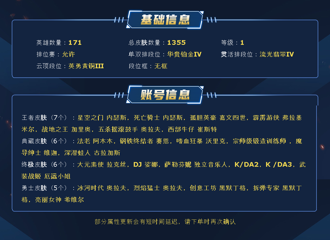 ~~喜欢记得收藏~~可排位~~1347皮全英雄丨964原皮383炫彩~~租之前尽量查一下游戏ID,确保段位是您需要的,避免浪费您的时间~~请勿挂机逃跑故意送人头,谢谢合作,谢谢~~