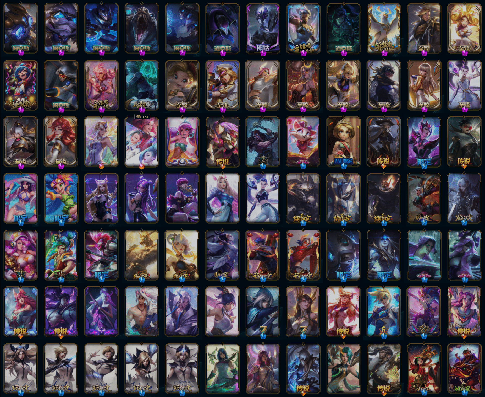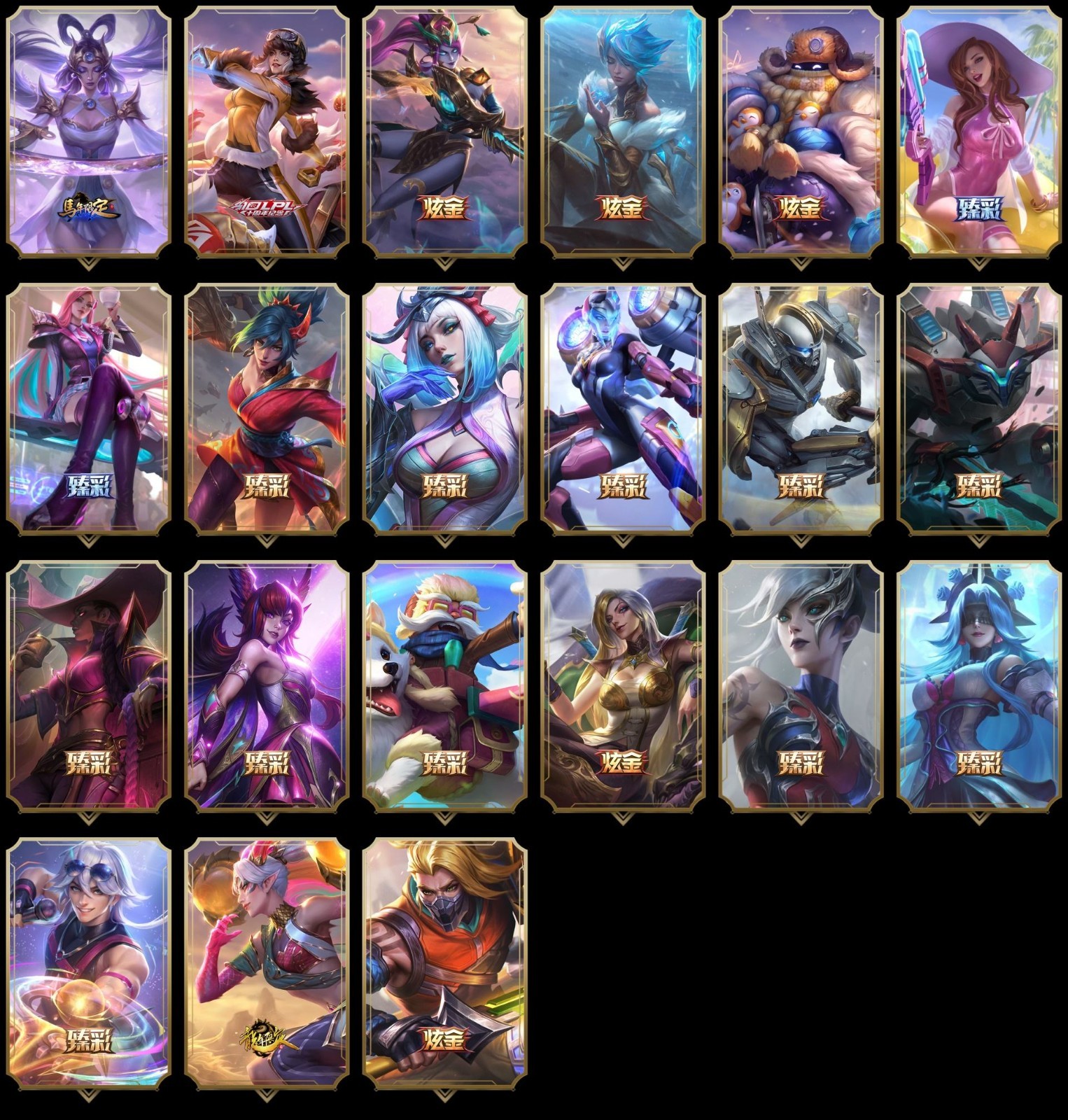 【重要皮肤】战斗学院蕾欧娜至臻 奥术师佐伊至臻 真实伤害赛娜至臻 灵能特工伊泽瑞尔至臻 福牛守护者菲奥娜至臻 KDA二代卡莎至臻 KDA一代卡莎至臻 KDA卡莎2022至臻 战斗学院拉克丝至臻 战斗学院拉克丝2022至臻 烈焰美人薇恩至臻 烈焰美人薇恩2022至臻 电玩女神凯特琳至臻 电玩女神凯特琳2022至臻 星之守护者妮蔻至臻 星之守护者妮蔻2022至臻 源计划正义艾瑞莉娅至臻 源计划正义艾瑞莉娅2022至臻 灰烬杀手塞拉斯 海克斯科技雷克顿 海克斯科技吉格斯 海克斯科技玛尔扎哈 海克斯科技嘉文四世 海克斯科技阿木木 海克斯科技魔腾 星之守护者塔莉垭 黎明使者卡尔玛 摄魂使者薇恩 新创战纪希维尔 胜利剑圣易 胜利女神娑娜 胜利之王泰达米尔 胜利巨口克格莫 舞会公主安妮 创星之灵璐璐 勇敢的心德莱厄斯 电玩女神厄运小姐 电玩勇者锐雯 电玩女神阿狸 星之守护者伊泽瑞尔 玉剑传说无影 玉剑传说舞剑仙 海珀利安小队Y03权天使卡蜜尔 星之守护者佐伊 替父从军花木兰 神龙烈焰金克丝 碧玉之牙卡西奥佩娅 春晖神女拉克丝 你看见过我的熊猫吗安妮 北辰之威内瑟斯 南天之怒沃里克 美猴王孙悟空 玉净夜叉凯特琳 紫金罗刹莫甘娜 广寒仙子嫦娥 虎痴之拳蔚 张辽文远 司马懿仲达 烈焰美人薇恩 神龙之翼库奇 王国机神青龙德莱文 王国机神苍狼瑟提 王国机神白虎贾克斯 福牛守护者安妮 福牛守护者厄斐琉斯 福牛守护者德莱厄斯 福牛守护者阿利斯塔 福牛守护者嘉文四世 福牛守护者菲奥娜 胜利女神奥莉安娜 胜利枪神卢锡安 胜利之剑亚托克斯 觅心游侠卢锡安 觅心女王艾希 觅心之翼奎因 觅心猫猫悠米 幽梦玫瑰辛德拉 幽梦玫瑰泰隆 水晶玫瑰婕拉 水晶玫瑰斯维因 冬季仙境奥莉安娜 圣诞老人布隆 冰雪风暴希维尔 冬季仙境卡尔玛 冰封王子蒙多 冰雪女神辛德拉 平安夜女神娑娜 圣诞糖果棒厄运小姐 魅惑女巫迦娜 大魔法锅布里茨 死亡誓约卡特琳娜 勇敢的心德莱厄斯 海之歌永恩 泳池派对凯特琳 泳池派对佐伊 泳池派对奥莉安娜 泳池派对塔莉垭 泳池派对瑟提 电玩战魂赫卡里姆 御星魔矢艾希 送披萨的小姐姐希维尔 鸡里奥 克格汪 EDG厄斐琉斯 iG卡蜜尔 iG洛 iG卡莎 iG艾瑞莉娅 iG乐芙兰 iG菲奥娜 SSG纳尔 SKTT1扎克 SKTT1辛德拉 SKTT1娜美 SKTT1阿利斯塔 SKTT1卡莉丝塔 SKTT1瑞兹 SKTT1伊莉丝 SSW泰隆 SSW图奇 SSW辛吉德 SKTT1贾克斯 SKTT1劫 SKTT1李青 暗杀星奥莉安娜 暗杀星蒙多 暗杀星伊泽瑞尔 暗杀星慎 Fnatic迦娜 Fnatic库奇 Fnatic古拉加斯 Fnatic嘉文四世 Fnatic卡尔萨斯 冰雪节辛吉德 防暴机器人布里茨 防暴天使凯尔 钢铁之翼艾尼维亚 冠军之矛卡莉丝塔 冠军之血希瓦娜 冠军之隐劫 冠军之志瑞兹 鬼影森森茂凯 鬼影重重魔腾 海贼瑞兹 胡桃夹子萨科 惊悚派对阿木木 惊悚派对费德提克 警用试作体K9内瑟斯 蓝色忧郁崔斯特 密林猎手提莫 南瓜头费德提克 女猎手希维尔 破空枪骑孙悟空 圣诞精灵崔丝塔娜 圣诞狂欢基兰 圣诞老人古拉加斯 圣诞玩偶波比 圣诞驯鹿克格莫 外星装甲库奇 无头骑士赫卡里姆 邪恶圣诞老人维迦 幸福女神乐芙兰 雪默丁格 雪装奈德丽 野兽猎人德莱文 野兽猎人瑟庄妮 野兽猎人泰达米尔 永恒之森乐芙兰 勇者阿狸 勇者奈德丽 征服者韦鲁斯 暗影沃里克 冠军之箭艾希 阿木木主人不要我了 波比的巧克力工坊 地底世界崔斯特 都铎王朝图奇 十五周年纪念希维尔 十周年纪念安妮 源代码乐芙兰 神凰行者瑞羽圣凰艾尼维亚 大元素使拉克丝 未来战士伊泽瑞尔 武装战姬厄运小姐 KDAALLOUT萨勒芬妮独立音乐人 KDAALLOUT萨勒芬妮明日新星 KDAALLOUT萨勒芬妮超级巨星