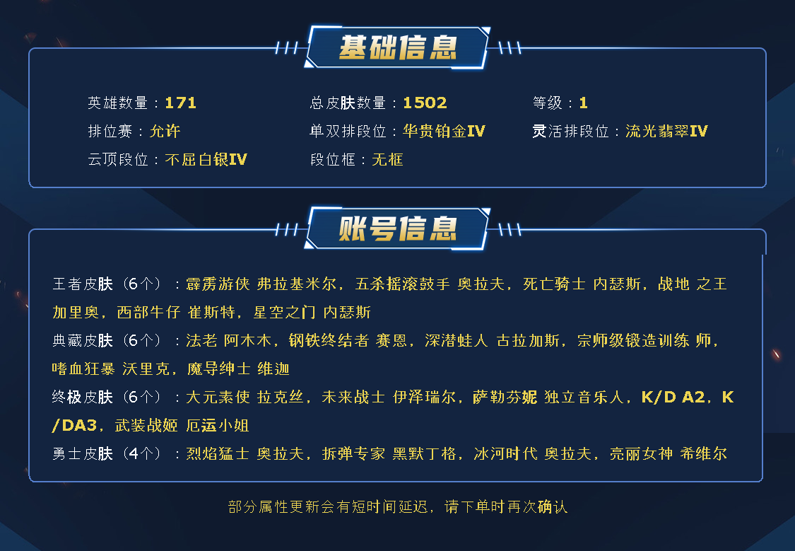 ~~喜欢记得收藏~~可排位~~1487皮全英雄~~租之前尽量查一下游戏ID,确保段位是您需要的,避免浪费您的时间~~请勿挂机逃跑故意送人头,谢谢合作,谢谢~~