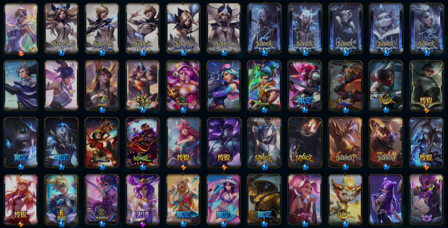 【传说皮肤】丧尸布兰德 源计划超体莫德凯撒 至尊魔女莫甘娜 焰尾妖狐阿狸 源计划林易 女主播迦娜 太空律动猫猫布里和里茨 灵魂莲华阿狸 炼狱魔犬内瑟斯 合金巨兽努努和威朗普 源计划毁灭派克 星之守护者霞 星之守护者洛 暗星锤石 灵魂莲华锤石 西部魔影卢锡安 真实伤害艾克 天煞劫 西部天使赛娜 暗星尊烬 黑夜使者亚索 奥德赛凯隐 灌篮高手德莱厄斯 蔷薇绅士杰斯 神王德莱厄斯 霸天异形卡兹克 金牌主播德莱文 符文战熊沃利贝尔 宇航员诺提勒斯 苍穹之光韦鲁斯 偶像歌手阿狸 枯萎之壤泽拉斯 光明哨兵格雷福斯 冰霜亚龙希瓦娜 星之守护者阿狸 黯黑魔龙希瓦娜 黎明使者锐雯 月蚀骑士蕾欧娜 钢铁军团盖伦 死亡骑士盖伦 腥红之月鬼武姬阿卡丽 屠龙勇士潘森 战斗学院伊泽瑞尔 驯龙学者黑默丁格 第三类接触黑默丁格 银河魔装机神兰博 光明哨兵薇恩 源计划净化薇恩 神龙尊者圣龙李青 神拳李青 地狱行者孙悟空 源计划泯灭雷克顿 上古战魂魔腾 冰川巨兽墨菲特 陆地王者4WD布里茨 苹果机器人布里茨 未来战士凯特琳 女警狙击凯特琳 最终BOSS维迦 红色男爵库奇 冰霜之刃艾瑞莉娅 电玩女神娑娜 双重冰晶艾尼维亚 黯晶凤凰艾尼维亚 战地巨兽科加斯 绅士科加斯 鬼魂新娘莫甘娜 女皇艾希 源计划联合艾希 恶魔之刃泰达米尔 烈焰雄心崔丝塔娜 驯龙炮手崔丝塔娜 提莫约德尔人的一大步 黎明使者索拉卡 约德尔国队长提莫 欧米伽小队幽灵特工 霸天零式赛恩 大天使长米迦勒凯尔 钢铁之翼凯尔 恶魔男爵瑞兹 血石领主弗拉基米尔 战场女武神凯尔 邪鸦魅影乐芙兰 战地机甲厄加特 地狱之门卫士加里奥 魔幻卡牌崔斯特 铁哥们儿奥拉夫 泳池派对吉格斯 律政大亨蒙多
