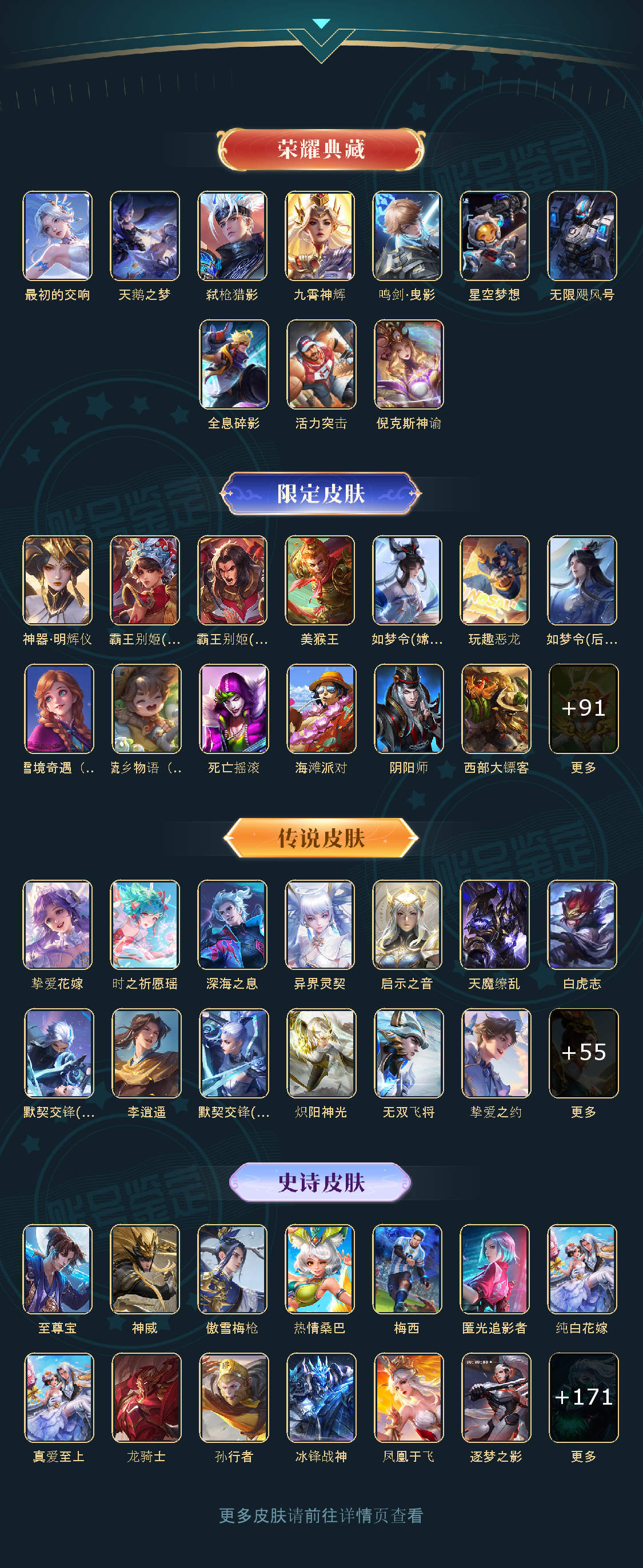 贵族等级V10,段位至尊星耀,英雄数量127,典藏皮肤数10,皮肤数量570,纯白花嫁/天魔缭乱/至尊宝/真爱至上/热情桑巴/梅西/白虎志/久胜战神/飞衡/匿光追影者/神器·明辉仪/鸣剑·曳影/无双飞将/时之祈愿瑶/挚爱花嫁/李逍遥/深海之息/最初的交响/玉兔公主/补天/弑枪猎影/异界灵契/神威/炽阳神光/启示之音/九霄神辉/傲雪梅枪/纯白花嫁/天魔缭乱/至尊宝/真爱至上/热情桑巴/梅西/白虎志/久胜战神/飞衡/匿光追影者/神器·明辉仪/鸣剑·曳影/无双飞将/时之祈愿瑶/挚爱花嫁/李逍遥/深海之息/最初的交响/玉兔公主/补天/弑枪猎影/异界灵契/神威/炽阳神光/启示之音/九霄神辉/傲雪梅枪