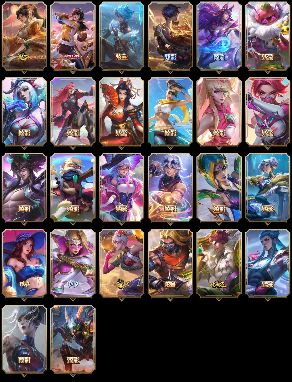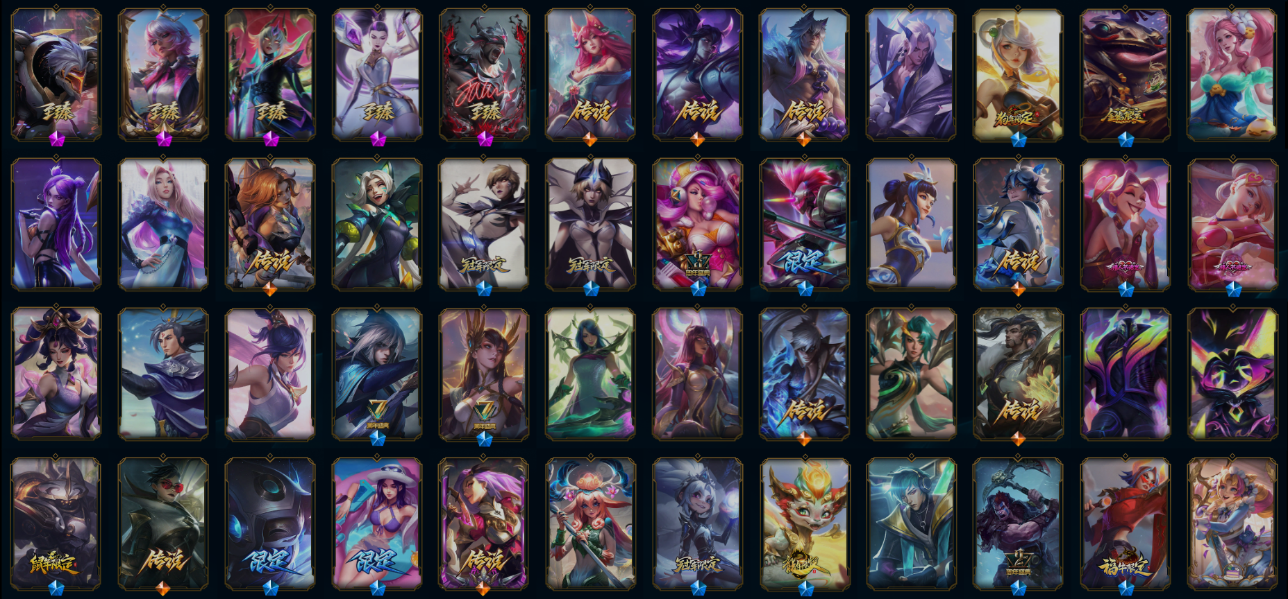 【传说皮肤】神拳李青 灵魂莲华瑟提 幻灵战斗队长厄运小姐 星之守护者拉克丝 日蚀骑士希维尔 烈焰雄心崔丝塔娜 源计划毁灭派克 灵能特工娑娜 女主播迦娜 光明哨兵薇恩 霸天零式赛恩 战斗学院伊泽瑞尔 心之钢凯隐 星之守护者洛 血石领主弗拉基米尔 霸天异形卡兹克 星之守护者阿卡丽 死亡骑士盖伦 灵魂莲华阿狸 暗星尊烬 源计划净化薇恩 青花瓷伊泽瑞尔 陆地王者4WD布里茨 钢铁之翼凯尔 上古战魂魔腾 太空律动律动队长提莫 黎明使者永恩 神龙尊者昼日真龙亚索 泳池派对吉格斯 黯晶凤凰艾尼维亚 电玩女神娑娜 西部魔影卢锡安 灵魂莲华锤石 屠龙勇士潘森 星之守护者金克丝 星之守护者霞 苹果机器人布里茨 恶魔之刃泰达米尔 焰尾妖狐阿狸 西部天使艾希 魔女伊芙琳 地狱行者孙悟空 神龙尊者圣龙李青 未来战士凯特琳 真实伤害艾克 源计划超体莫德凯撒 西部天使赛娜 至尊魔女莫甘娜 天煞劫 邪鸦魅影乐芙兰 约德尔国队长提莫 提莫约德尔人的一大步 合金巨兽努努和威朗普 绅士科加斯 枯萎之壤泽拉斯 铁哥们儿奥拉夫 奥德赛凯隐 最终BOSS维迦 冰霜之刃艾瑞莉娅 冰霜亚龙希瓦娜 女帝卡特琳娜 欧米伽小队幽灵特工 黯黑魔龙希瓦娜 战场女武神凯尔 金牌主播德莱文 鬼魂新娘莫甘娜 源计划联合艾希 苍穹之光韦鲁斯 魔幻卡牌崔斯特 暗星锤石 腥红之月鬼武姬阿卡丽 律政大亨蒙多 偶像歌手阿狸 地狱之门卫士加里奥 黎明使者锐雯 宇航员诺提勒斯 战地机甲厄加特 灌篮高手德莱厄斯 大天使长米迦勒凯尔 女皇艾希 黑夜使者亚索 恶魔男爵瑞兹 女校长菲奥娜 星之守护者阿狸 源计划林易