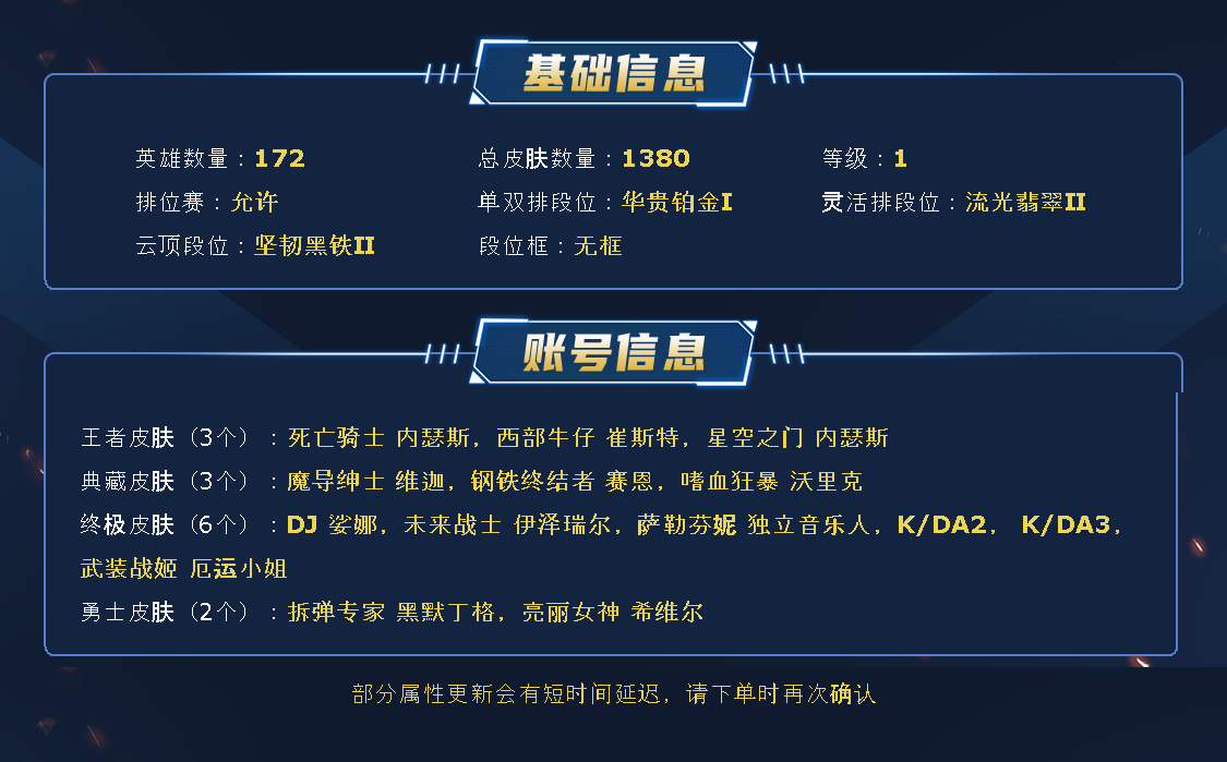 ~~喜欢记得收藏~~可排位~~1203皮全英雄丨803原皮400炫彩~~租之前尽量查一下游戏ID,确保段位是您需要的,避免浪费您的时间~~请勿挂机逃跑故意送人头,谢谢合作,谢谢~~