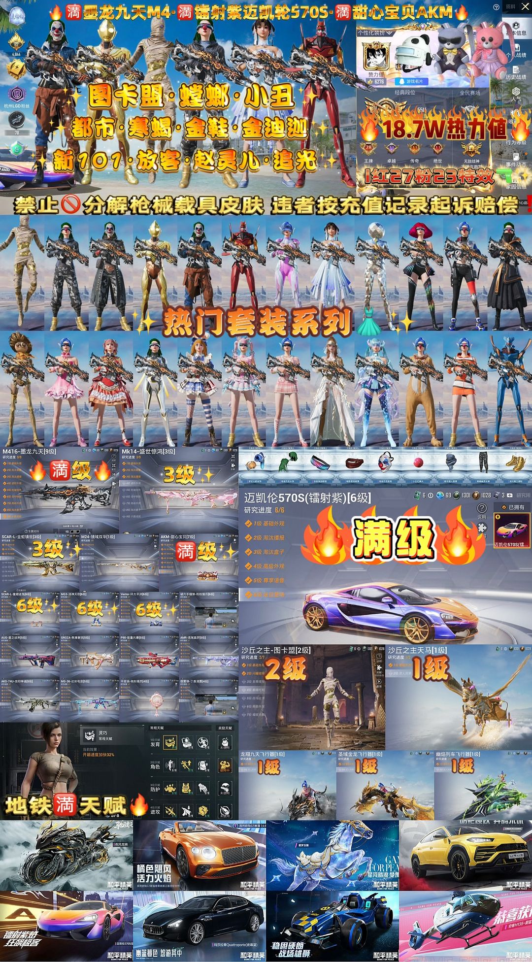 恶意撤单一律拉黑 可直接上号 租客须知◆ 本账号已在公安局备案,请勿对账号做出非法操作 如:开挂,坐挂车,使用第三方工具等,请您和谐游戏,如有损害财务的情形必追究到底 登录游戏:登录请打开和平精英并勾选上同意协议,再点击开始登录即可,如跳转停留主页面无反应,!!!重新打开和平精英!!!!即可正常进入游戏 **:如账号触发账号系统,会为您补上时间,到时不会下线,直到下一位租客租赁账号为止 请尽量不要以**进行维权 恶意维权,恶意维权者进行拉黑处理,永不放出 关于登号器,登录请打开和平经营并勾选上同意协议,再点击开始登录即可,如跳转停留主页面无反应,重新打开和平精英即可正常进入游戏 如果您喜欢本账号,可以点个收藏 【该账号库存价值较大已在派出所进行虚拟财产备案处理发现封禁将依法追究责任 禁止毁号开第三方软件发现账号被封禁联系平台获取联系方式进行法院起诉故意损害他人财物处理】请勿以身试法。开G封号一律报警并法院起诉,追究到底! 别以为虚拟ip,虚拟卡就可以为所欲为,平台注册手机验证,身份证号或者ZF宝付款记录等太明显了,网络不是法外之地, 想想那些在网上违法诈骗的怎么被抓的? 做一件事的时候要考虑后果是不是你能承担的,想开G自己注册个新Q玩就行了, 租别人的号开G吃亏的还是自己,切勿抱有侥幸心理, 到时候被网监局刑事部门找上门,罚钱坐牢留下案底,亲人两行泪!恶意撤单一律拉黑