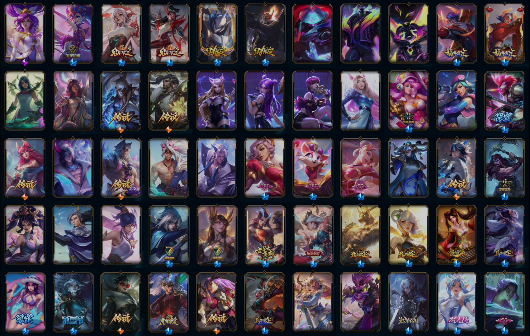 【传说皮肤】女帝卡特琳娜 神龙尊者昼日真龙亚索 偶像歌手阿狸 星之守护者霞 血石领主弗拉基米尔 花仙女王卡尔玛 绝息圣堂锐雯 墨之影武者易 灌篮高手德莱厄斯 源计划泯灭雷克顿 灵魂莲华阿狸 宇航员诺提勒斯 灵能特工娑娜 黎明使者锐雯 暗星女王拉克丝 星之守护者拉克丝 太空律动律动队长提莫 影执事劫 源计划毁灭派克 太空律动猫猫布里和里茨 黎明使者索拉卡 符文战熊沃利贝尔 神王盖伦 丧尸布兰德 女皇艾希 战地机甲厄加特 至尊魔女莫甘娜 枯萎之壤泽拉斯 陆地王者4WD布里茨 光明哨兵薇恩 耀星女神拉克丝 战斗学院凯特琳 炼狱魔犬内瑟斯 腥红之月鬼武姬阿卡丽 黎明使者永恩 灵魂莲华瑟提 天煞劫 战斗学院伊泽瑞尔 泳池派对吉格斯 律政大亨蒙多 红色男爵库奇 魔女伊芙琳 暗星锤石 苍穹之光韦鲁斯 青花瓷伊泽瑞尔 西部天使赛娜 驯龙炮手崔丝塔娜 女校长菲奥娜 最终BOSS维迦 光明哨兵格雷福斯 神龙尊者夜月幻龙亚索 电玩女神娑娜 霸天零式赛恩 欧米伽小队幽灵特工 大天使长米迦勒凯尔 源计划超体莫德凯撒 地狱之门卫士加里奥 暗星尊烬 蔷薇绅士杰斯 战地巨兽科加斯 神龙尊者圣龙李青 真实伤害艾克 提莫约德尔人的一大步 恶魔男爵瑞兹 驯龙学者黑默丁格 焰尾妖狐阿狸 铁哥们儿奥拉夫 女主播迦娜 冰川巨兽墨菲特 黯黑魔龙希瓦娜 霸天异形卡兹克 冰霜亚龙希瓦娜 约德尔国队长提莫 神拳李青 屠龙勇士潘森 钢铁之翼凯尔 银河魔装机神兰博 死亡骑士盖伦 魔幻卡牌崔斯特 源计划净化薇恩 邪鸦魅影乐芙兰 未来战士凯特琳 西部魔影卢锡安 黑夜使者亚索 神王德莱厄斯 星之守护者金克丝 第三类接触黑默丁格 苹果机器人布里茨 源计划联合艾希 双重冰晶艾尼维亚 烈焰雄心崔丝塔娜 战场女武神凯尔 绅士科加斯 女警狙击凯特琳 鬼魂新娘莫甘娜 冰霜之刃艾瑞莉娅 源计划林易