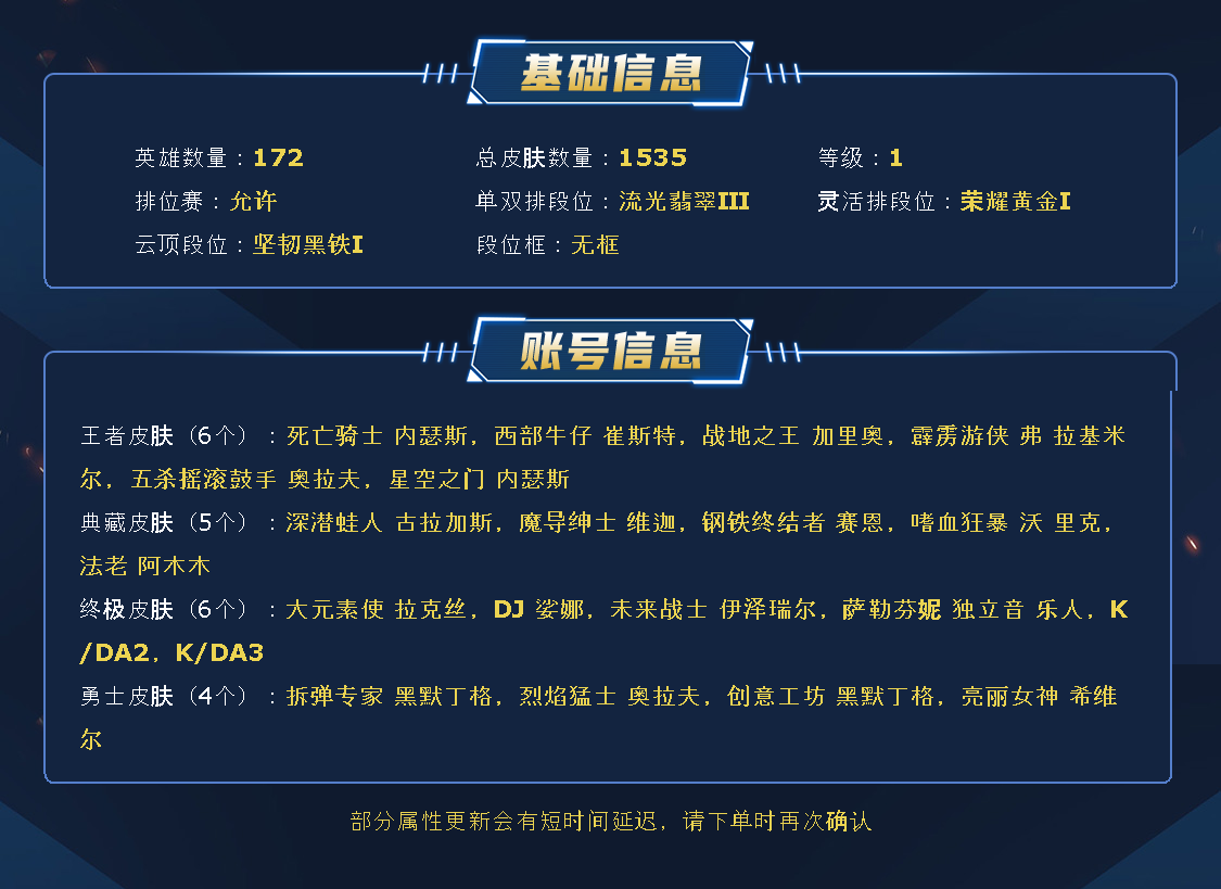 ~~喜欢记得收藏~~可排位~~1533皮全英雄丨975原皮558炫彩~~租之前尽量查一下游戏ID,确保段位是您需要的,避免浪费您的时间~~请勿挂机逃跑故意送人头,谢谢合作,谢谢~~