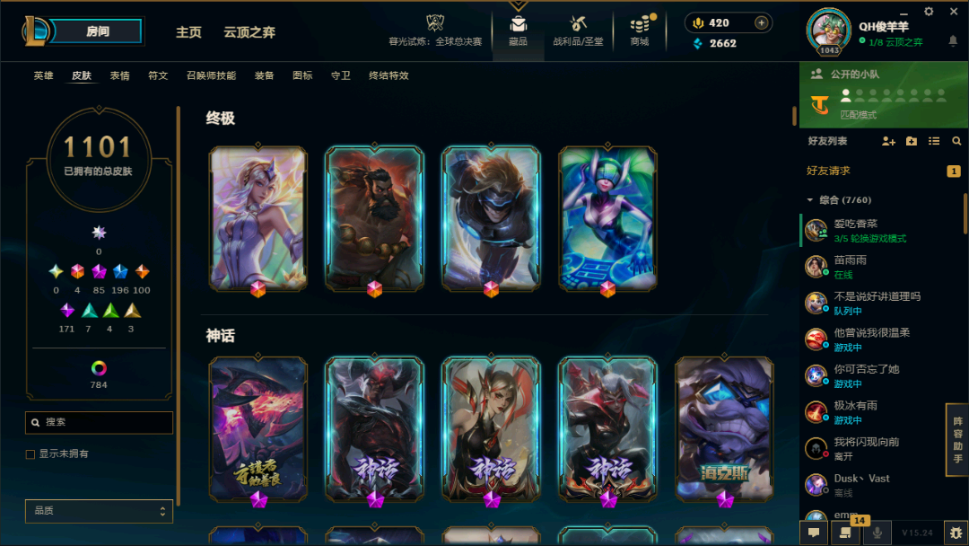 1101皮/85神话/龙虾/斩星魔剑/龙刀/神话亚索永恩瞎子/46臻彩/900多炫彩