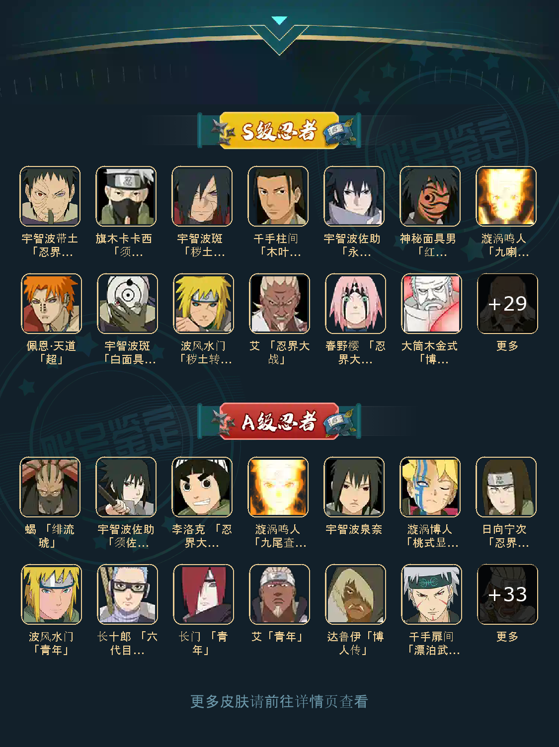 VIP11级;S忍41个;A忍42个,通灵兽20个,S忍:猿飞日斩大蛇丸普通纲手九喇嘛鸣人永恒万花筒佐助忍战樱仙人自来也百豪纲手普通自来也豪杰自来也死门凯波风水门秽土水门秽土猿飞千手扉间秽土扉间千手柱间秽土柱间木叶创立柱...