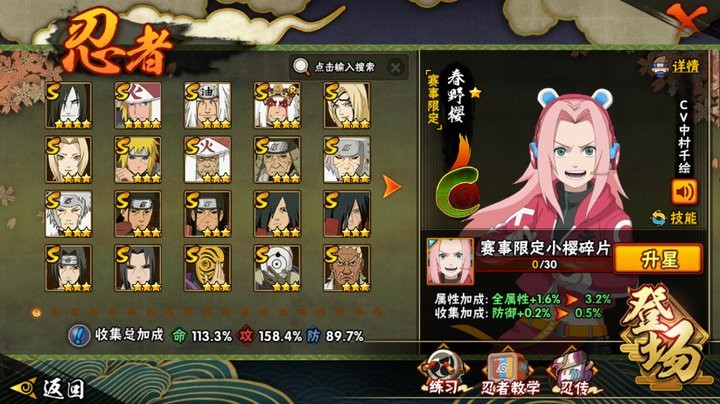 战力:1404W+;VIP11级;S忍25个;A忍35个,通灵兽21个,S忍:大蛇丸波风水门普通自来也豪杰自来也百豪纲手普通纲手秽土水门猿飞日斩秽土猿飞秽土扉间千手扉间千手柱间秽土柱间宇智波斑秽土斑须佐鼬秽土鼬神秘面具男白面具四代艾二代土影