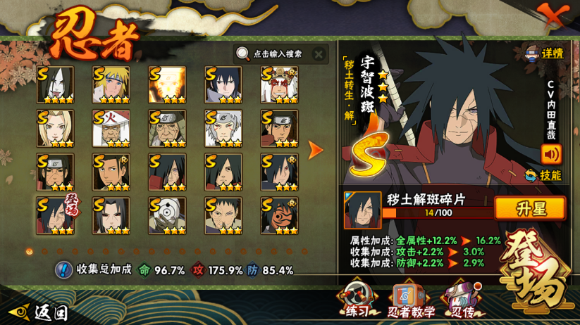 战力:1215W+;VIP11级;S忍25个;A忍35个,通灵兽21个,S忍:大蛇丸波风水门九喇嘛鸣人永恒万花筒佐助豪杰自来也普通纲手猿飞日斩秽土猿飞千手扉间千手柱间秽土柱间木叶创立柱间宇智波斑秽土斑木叶创立斑秽土解斑秽土鼬白面具忍战带土红