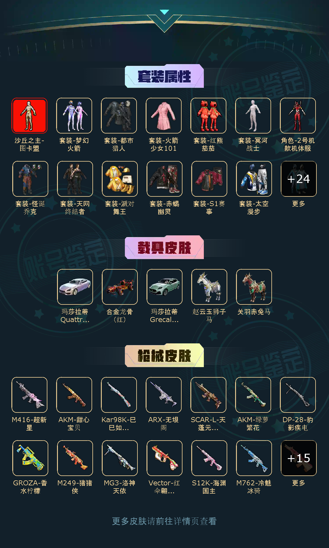 27粉,5载具,26特效枪,281套装,25王牌印记 UZI-绮梦青鸾/AKM-甜心宝贝/SCAR-L-童趣迷兔/AWM-花间之火/Vector-红伞翩翩/GROZA-香水柠檬/M416-五爪金龙/MG3-洛神天依/GROZA-焦糖拿铁/M762-冷魅冰骑/S12K-海渊国主/UMP45-雪国精灵/M24-星之信仰/Mini14-龙虾霸霸/AKM-梦之光华/合金龙骨(红)