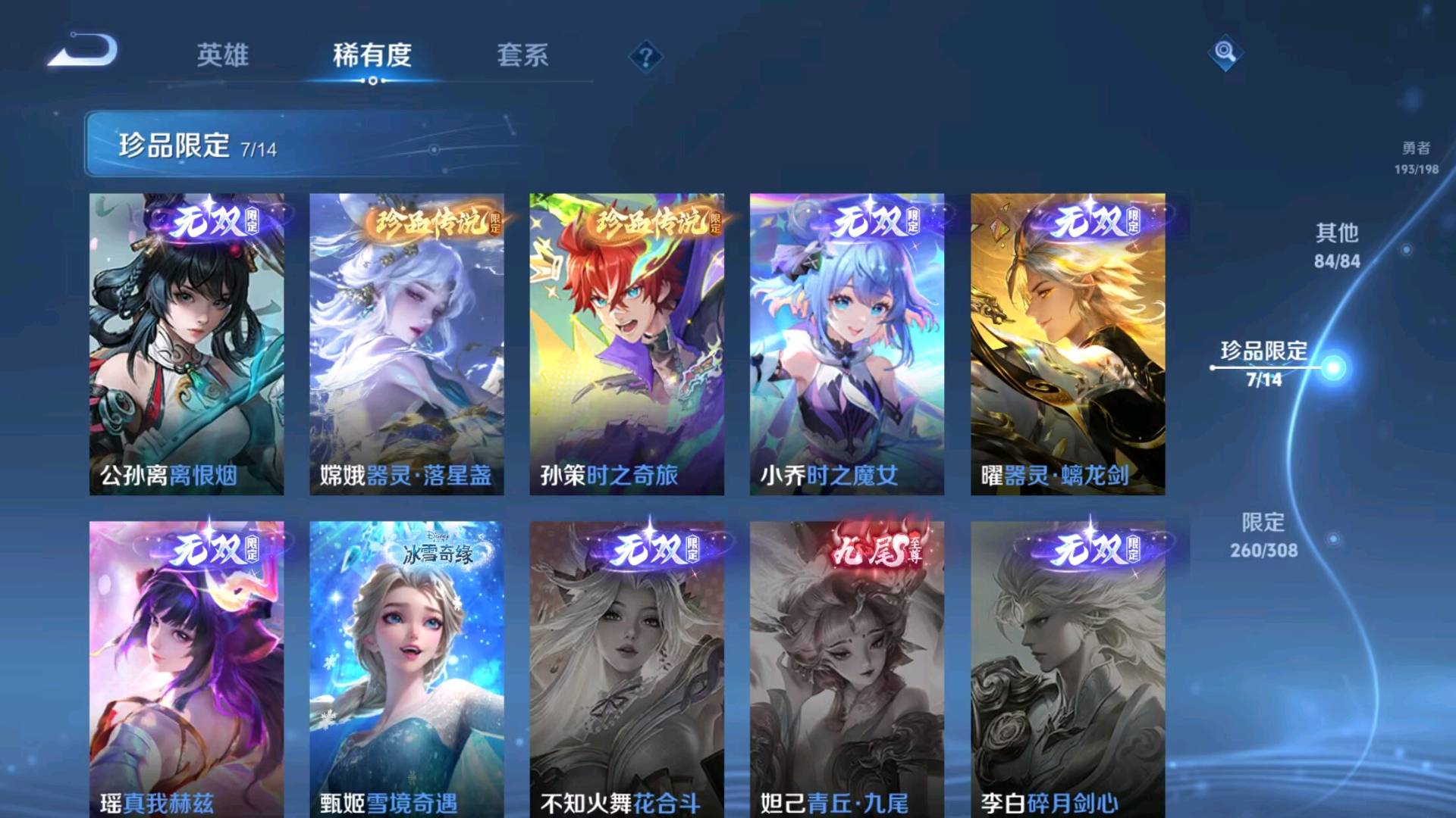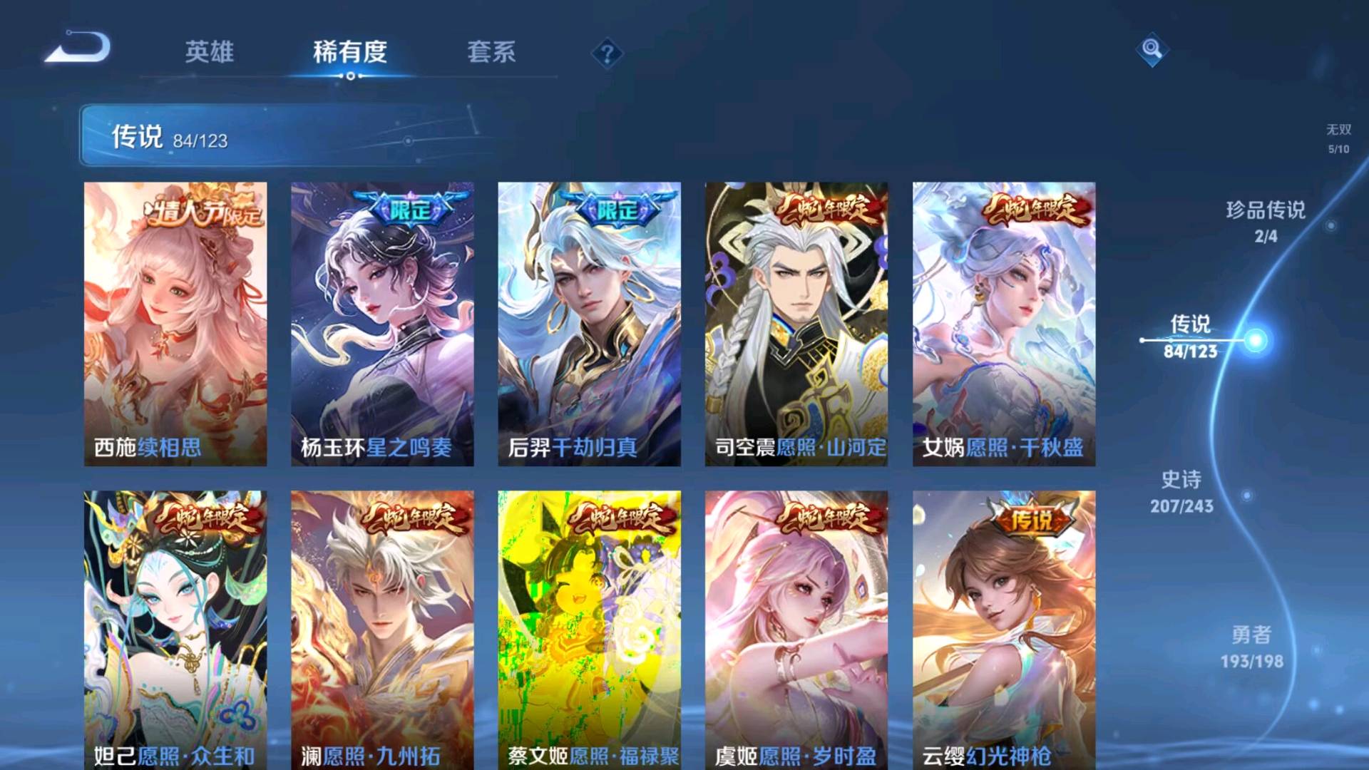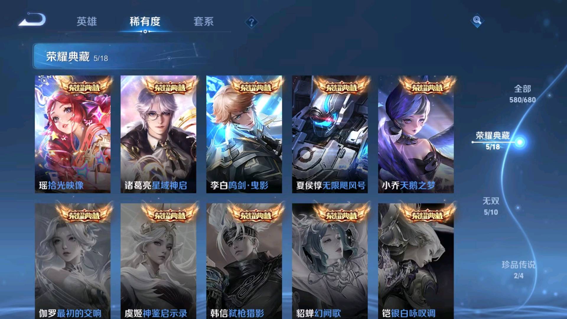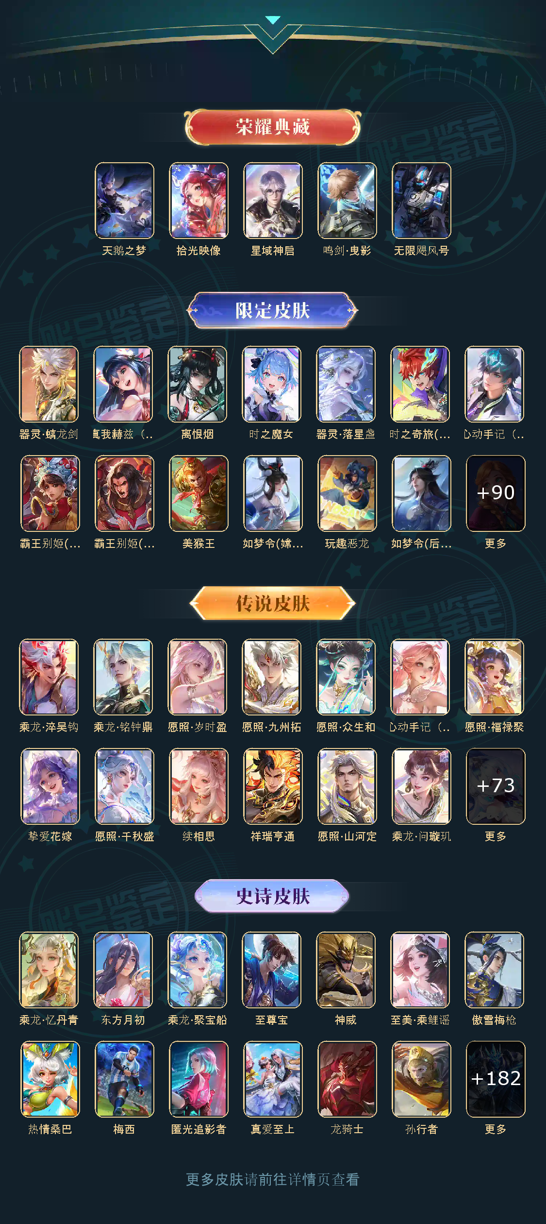 ,英雄数量123,典藏皮肤数5,皮肤数量580,天魔缭乱/至尊宝/真爱至上/热情桑巴/梅西/白虎志/久胜战神/飞衡/器灵·螭龙剑/愿照·九州拓/愿照·众生和/匿光追影者/鸣剑·曳影/群星魔术团(上官婉儿)/乘龙·问璇玑/心动手记(朵莉亚)/时之奇旅(大乔)/真我赫兹(瑶)/时之奇旅(鲁班七号)/愿照·福禄聚/无双飞将/至美·化雀舞/时之祈愿瑶/星域神启/李逍遥/涂山红红/逐花归海/器灵·落星盏/至美·乘鲤谣/琥珀纪元(伽罗)/时之奇旅(孙策)/离恨烟/愿照·千秋盛/霜月吟/雪境奇遇(甄姬)/乘龙·淬吴钩/东方月初/拾光映像/乘龙·铭钟鼎/妄想实况/深海之息/玉兔公主/补天/愿照·岁时盈/乘龙·聚宝船/续相思/异界灵契/神威/炽阳神光/乘龙·忆丹青/影龙天霄/心动手记(海诺)/鹤归松栖(云缨)/愿照·山河定/时之魔女/傲雪梅枪/时雨天司/天魔缭乱/至尊宝/真爱至上/热情桑巴/梅西/白虎志/久胜战神/飞衡/器灵·螭龙剑/愿照·九州拓/愿照·众生和/匿光追影者/鸣剑·曳影/群星魔术团(上官婉儿)/乘龙·问璇玑/心动手记(朵莉亚)/时之奇旅(大乔)/真我赫兹(瑶)/时之奇旅(鲁班七号)/愿照·福禄聚/无双飞将/至美·化雀舞/时之祈愿瑶/星域神启/李逍遥/涂山红红/逐花归海/器灵·落星盏/至美·乘鲤谣/琥珀纪元(伽罗)/时之奇旅(孙策)/离恨烟/愿照·千秋盛/霜月吟/雪境奇遇(甄姬)/乘龙·淬吴钩/东方月初/拾光映像/乘龙·铭钟鼎/妄想实况/深海之息/玉兔公主/补天/愿照·岁时盈/乘龙·聚宝船/续相思/异界灵契/神威/炽阳神光/乘龙·忆丹青/影龙天霄/心动手记(海诺)/鹤归松栖(云缨)/愿照·山河定/时之魔女/傲雪梅枪/时雨天司