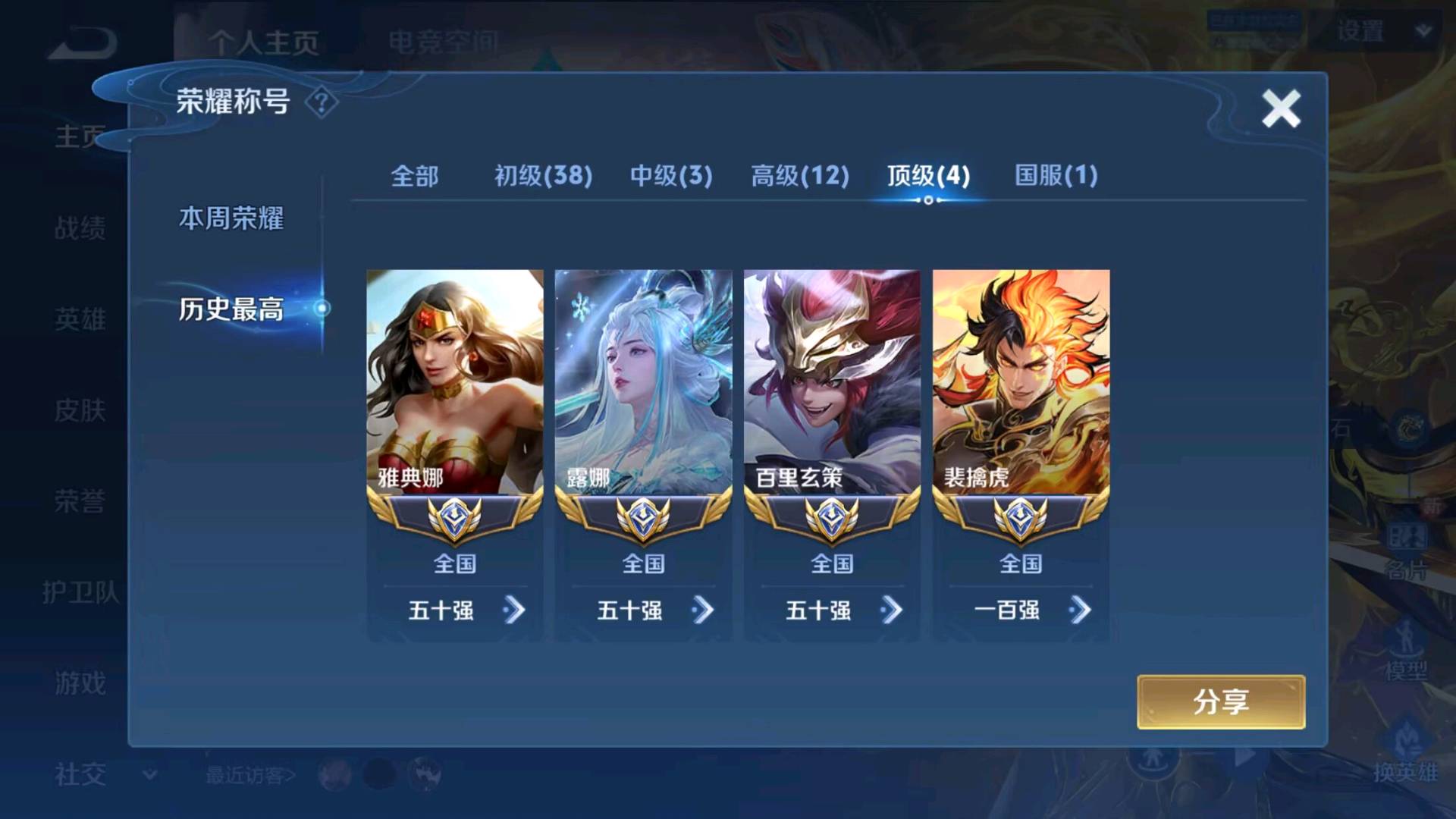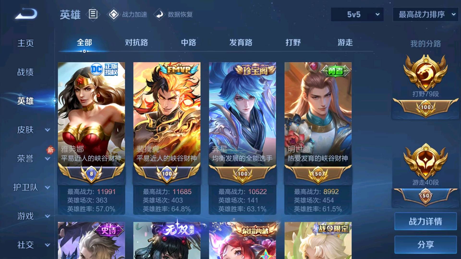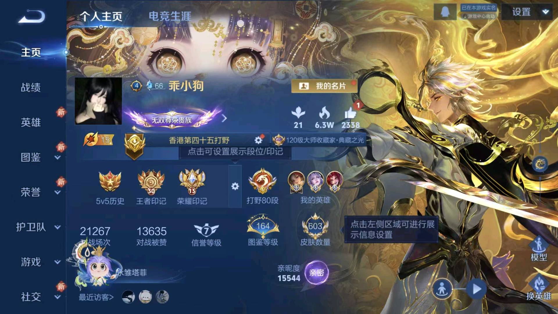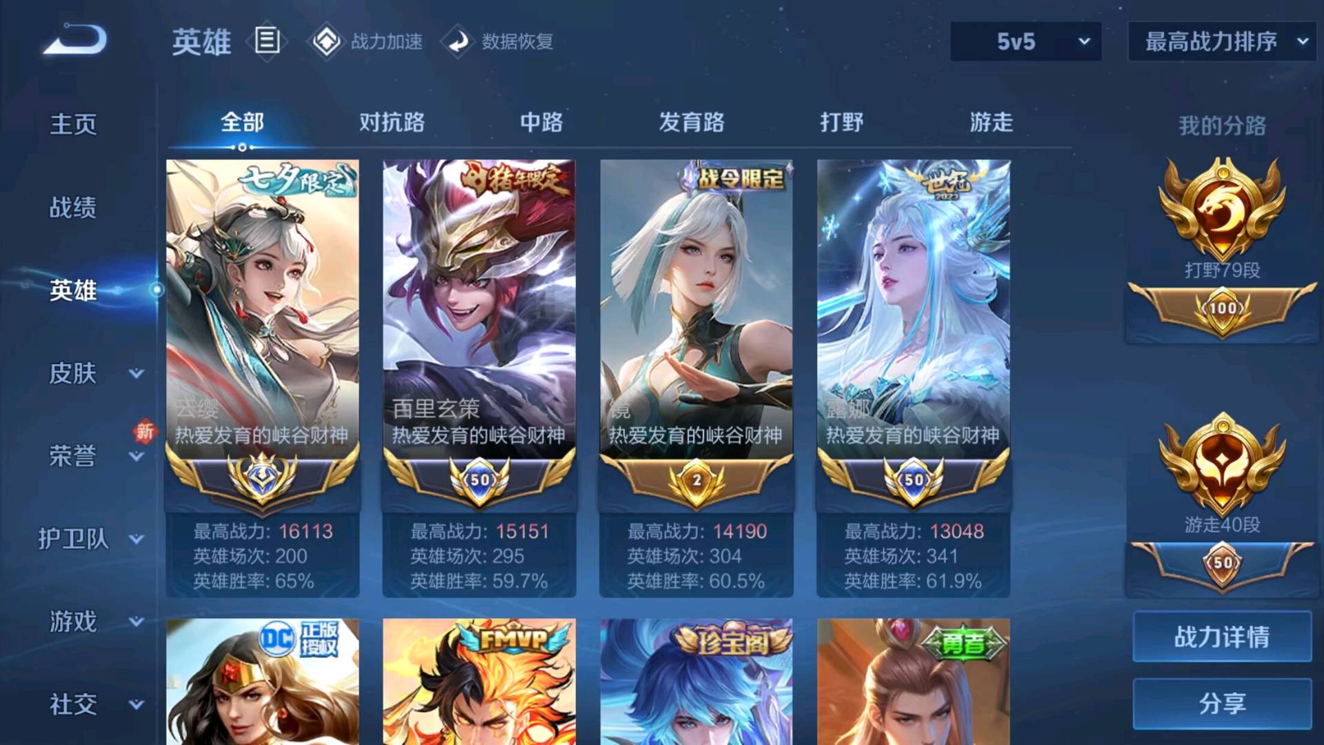 ,英雄数量123,典藏皮肤数5,皮肤数量580,天魔缭乱/至尊宝/真爱至上/热情桑巴/梅西/白虎志/久胜战神/飞衡/器灵·螭龙剑/愿照·九州拓/愿照·众生和/匿光追影者/鸣剑·曳影/群星魔术团(上官婉儿)/乘龙·问璇玑/心动手记(朵莉亚)/时之奇旅(大乔)/真我赫兹(瑶)/时之奇旅(鲁班七号)/愿照·福禄聚/无双飞将/至美·化雀舞/时之祈愿瑶/星域神启/李逍遥/涂山红红/逐花归海/器灵·落星盏/至美·乘鲤谣/琥珀纪元(伽罗)/时之奇旅(孙策)/离恨烟/愿照·千秋盛/霜月吟/雪境奇遇(甄姬)/乘龙·淬吴钩/东方月初/拾光映像/乘龙·铭钟鼎/妄想实况/深海之息/玉兔公主/补天/愿照·岁时盈/乘龙·聚宝船/续相思/异界灵契/神威/炽阳神光/乘龙·忆丹青/影龙天霄/心动手记(海诺)/鹤归松栖(云缨)/愿照·山河定/时之魔女/傲雪梅枪/时雨天司/天魔缭乱/至尊宝/真爱至上/热情桑巴/梅西/白虎志/久胜战神/飞衡/器灵·螭龙剑/愿照·九州拓/愿照·众生和/匿光追影者/鸣剑·曳影/群星魔术团(上官婉儿)/乘龙·问璇玑/心动手记(朵莉亚)/时之奇旅(大乔)/真我赫兹(瑶)/时之奇旅(鲁班七号)/愿照·福禄聚/无双飞将/至美·化雀舞/时之祈愿瑶/星域神启/李逍遥/涂山红红/逐花归海/器灵·落星盏/至美·乘鲤谣/琥珀纪元(伽罗)/时之奇旅(孙策)/离恨烟/愿照·千秋盛/霜月吟/雪境奇遇(甄姬)/乘龙·淬吴钩/东方月初/拾光映像/乘龙·铭钟鼎/妄想实况/深海之息/玉兔公主/补天/愿照·岁时盈/乘龙·聚宝船/续相思/异界灵契/神威/炽阳神光/乘龙·忆丹青/影龙天霄/心动手记(海诺)/鹤归松栖(云缨)/愿照·山河定/时之魔女/傲雪梅枪/时雨天司