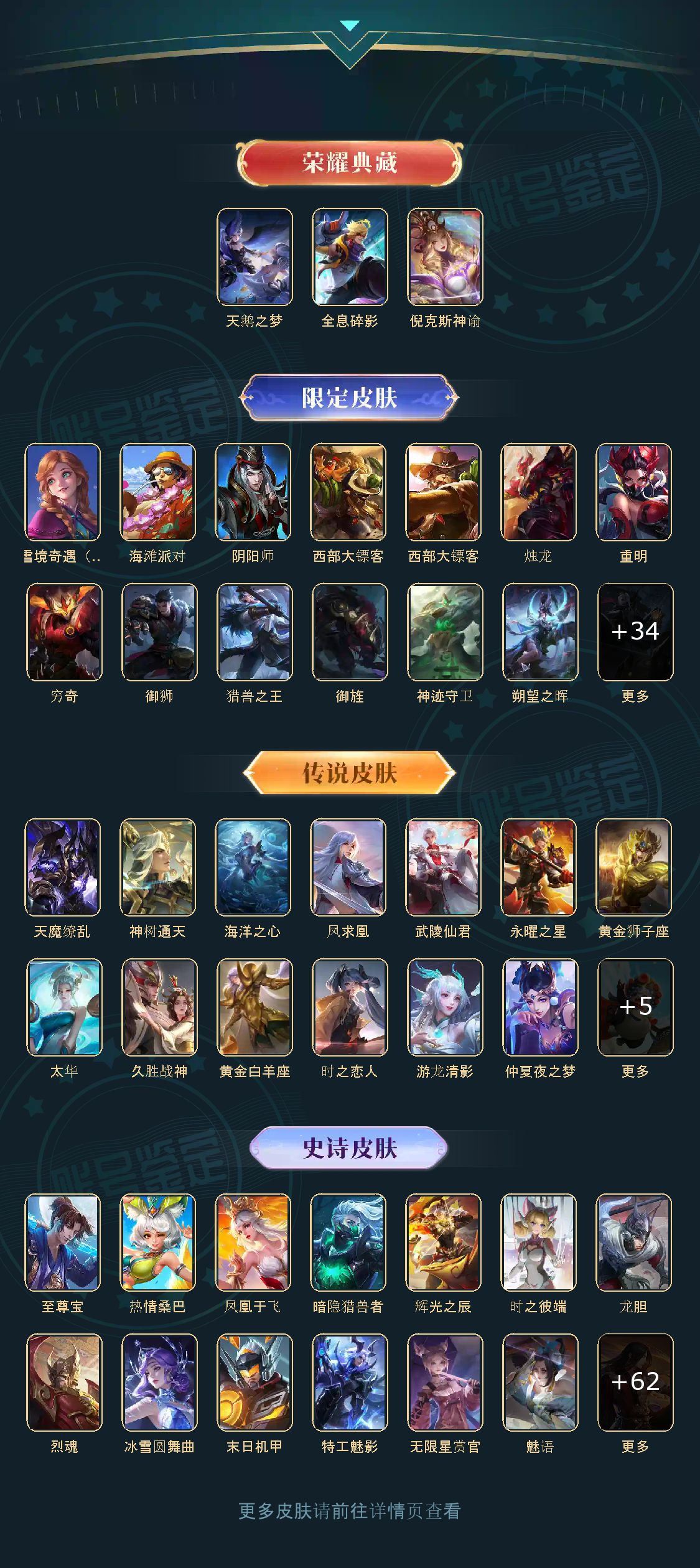 贵族等级V8,英雄数量122,典藏皮肤数3,皮肤数量265,天鹅之梦/天魔缭乱/凤求凰/武陵仙君/全息碎影/久胜战神/倪克斯神谕